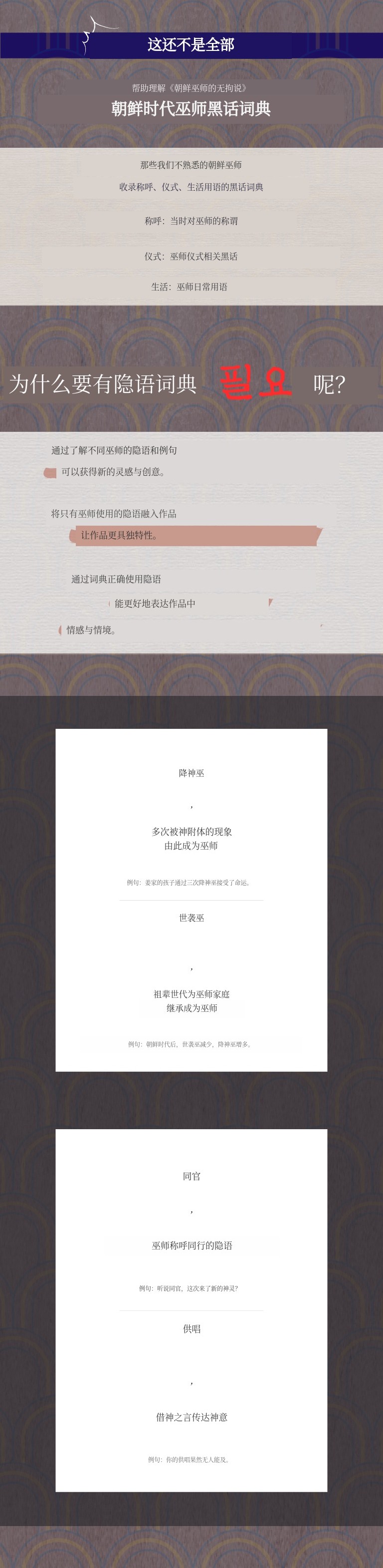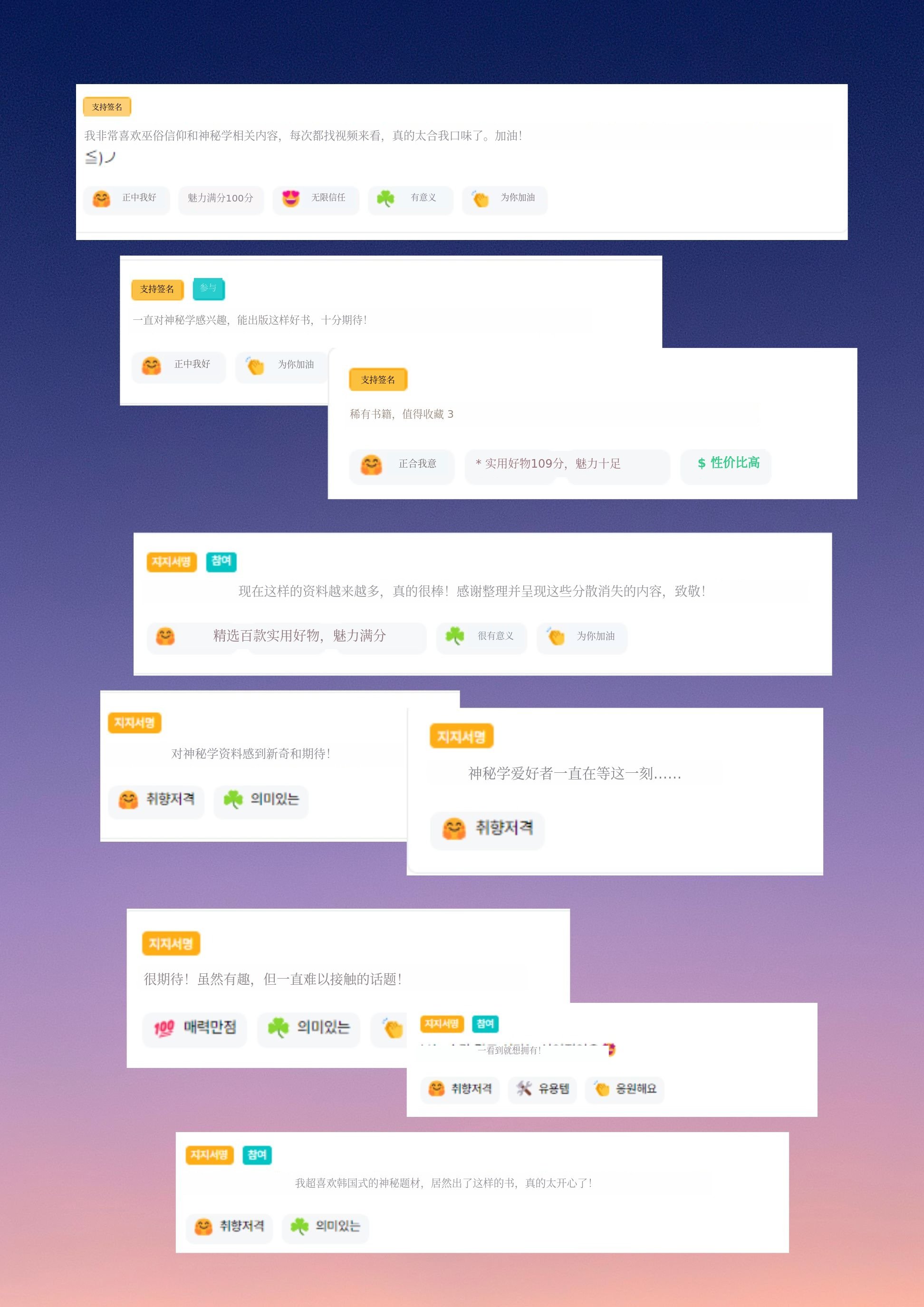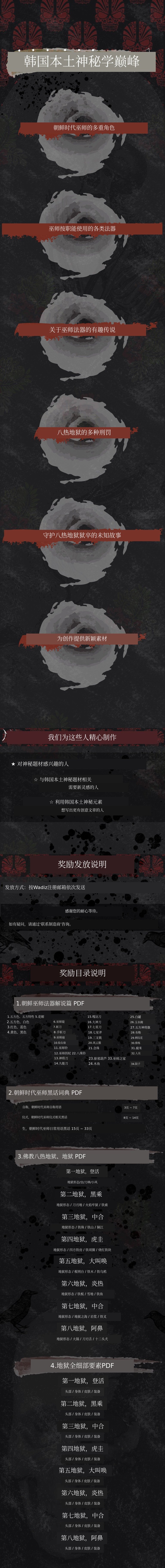 1. 📚 韩国版神秘学指南 - 涵盖巫术与佛教地狱的专业资料 2. 🔮 朝鲜时代巫师工具词典 - 助力文化理解与创作灵感 3. 🎨 独家众筹发布 - 提供稀有插画与独家内容