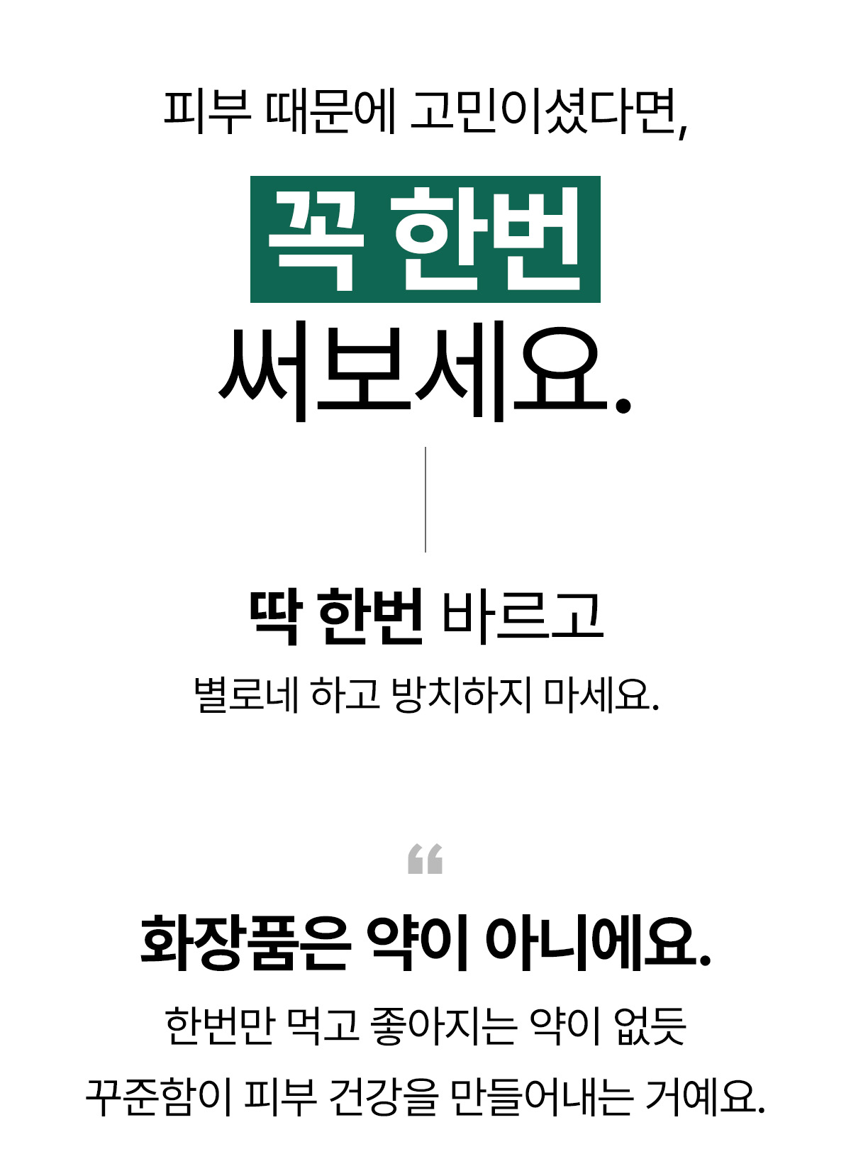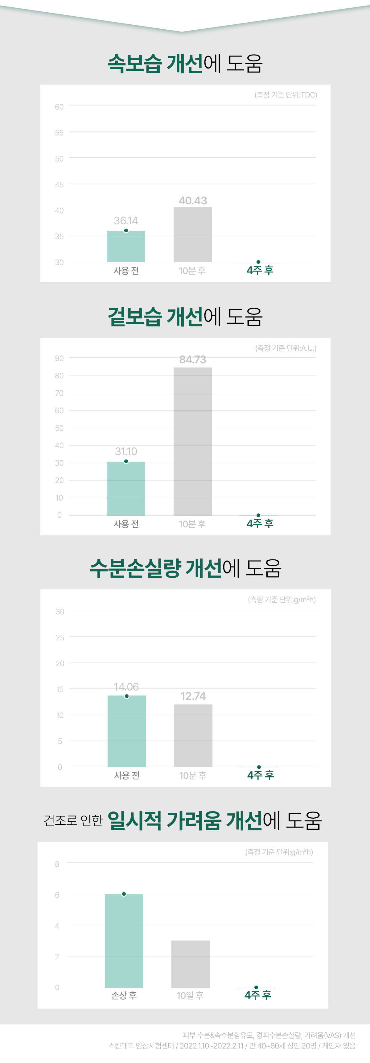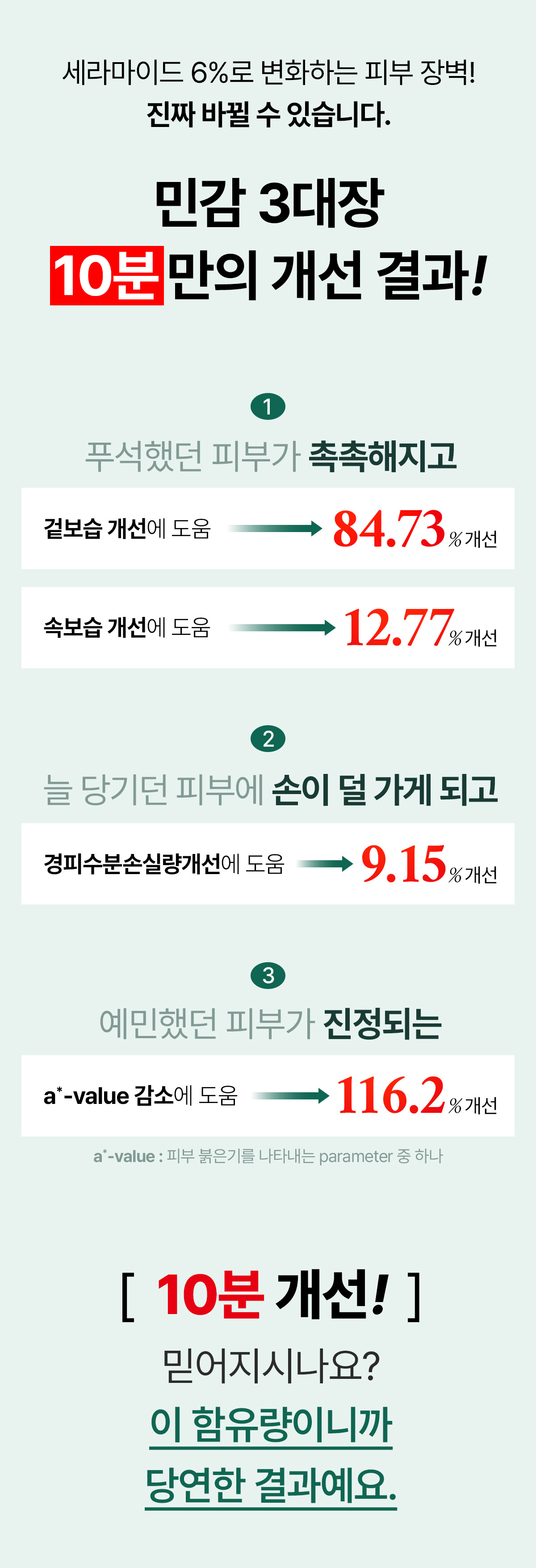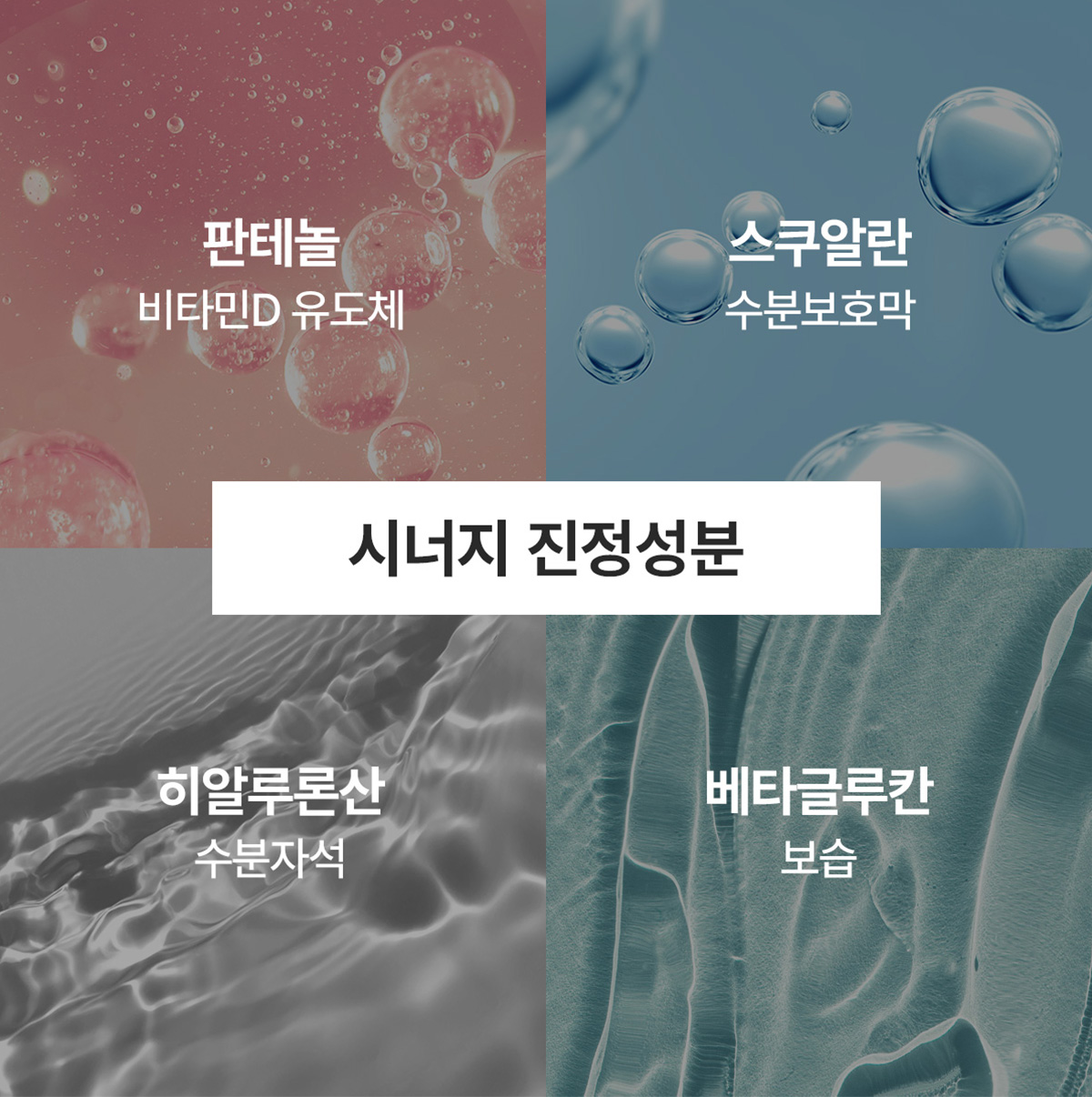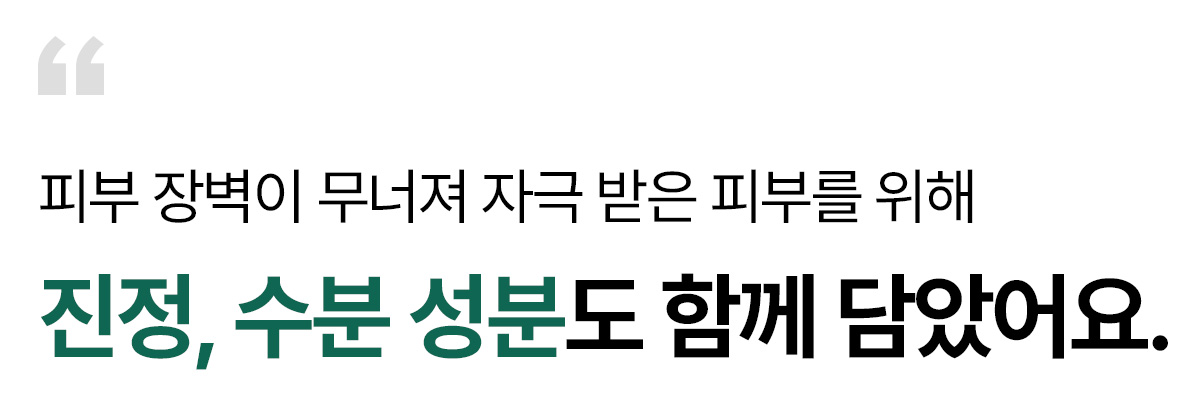 건강한 피부도 강한 자외선, 미세먼지, 건조한 바람 등 환경적인 자극으로 진정과 수분은 필요하거든요. 비타민 D 유도체를 함유한 판테놀과 보습에 탁월한 베타글루칸, 수분을 끌어당기는 히알루론산, 그 수분을 보호하는 스쿠알란, 마지막으로 피부 진정에 효과적인 병풀추출물까지 더해 자극 받은 피부를 한결 더 편안하게 만들어주죠.