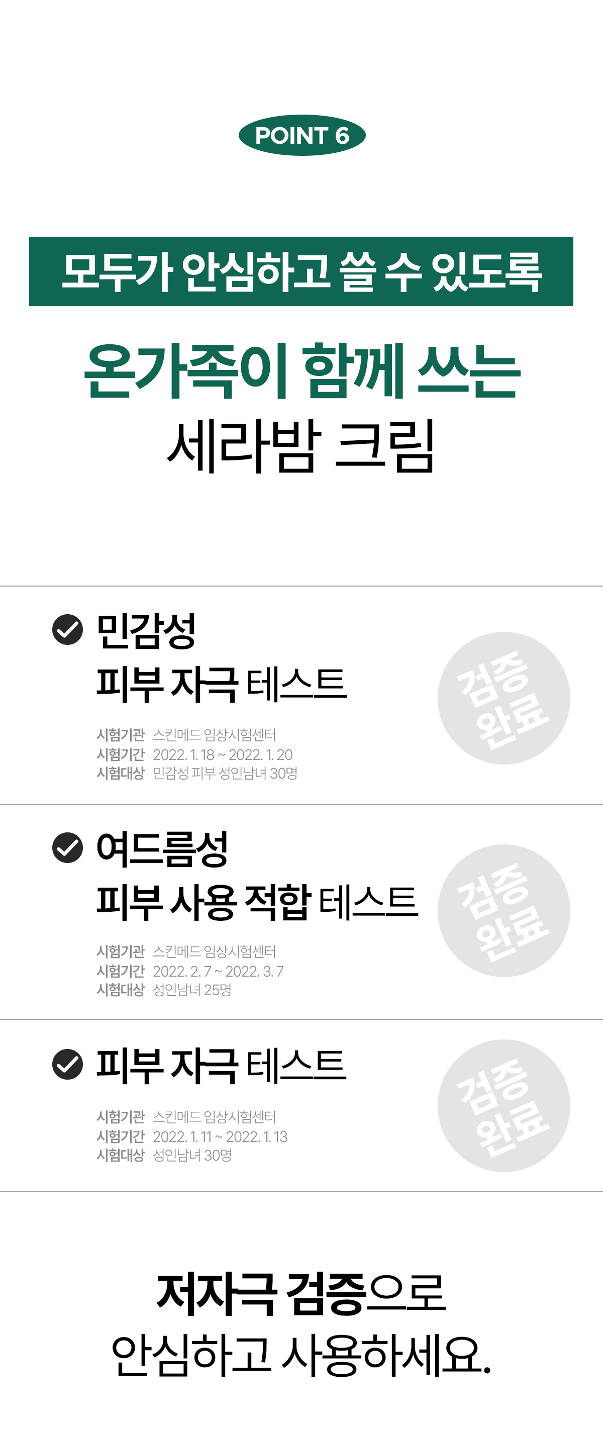 세라밤 크림은 민감성 피부 및 피부 자극 테스트를 모두 완료하였으며 18가지 주의성분, 알레르기 유발 향료를 배제한 제품으로 영유아를 포함하여 온가족이 사용 가능합니다.
