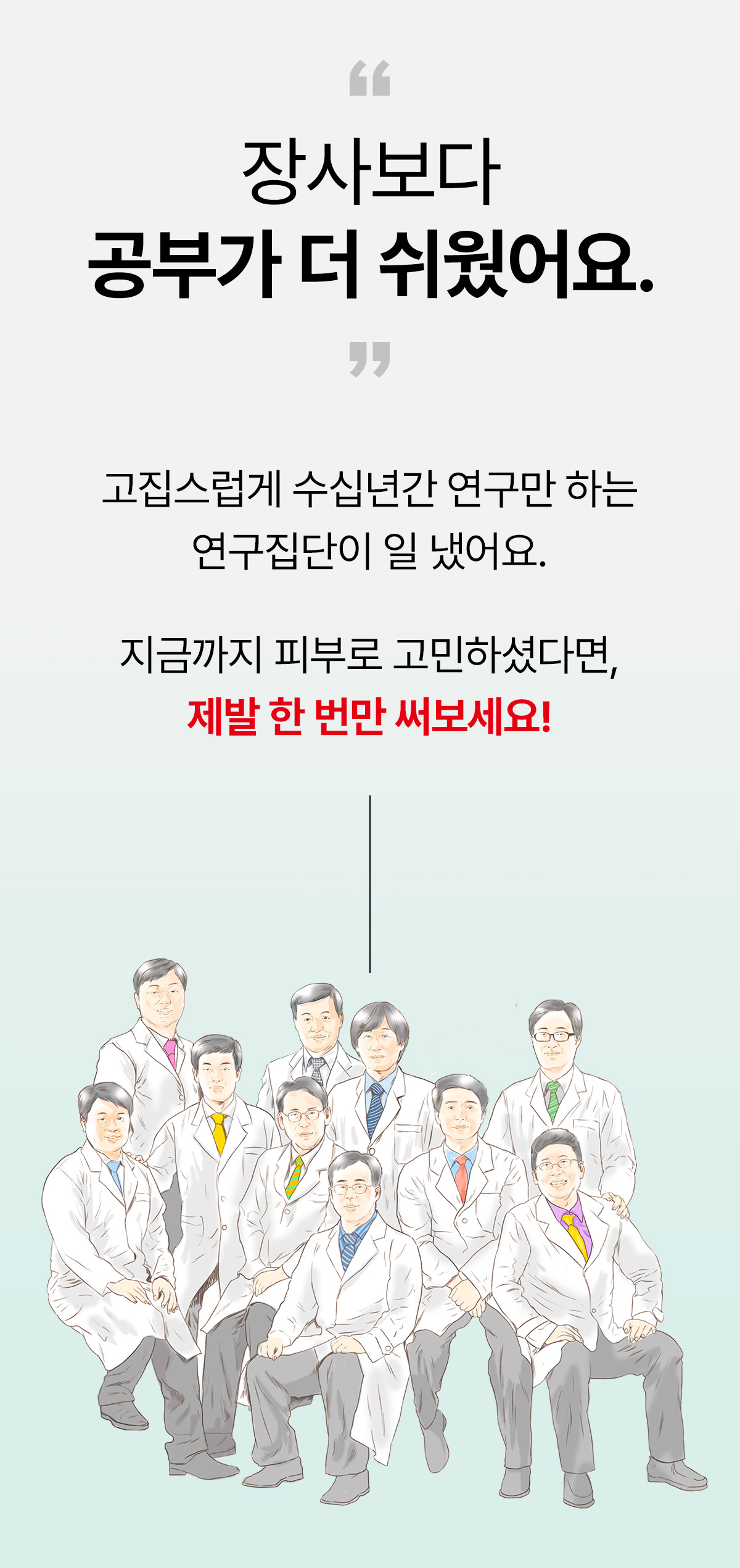 교수진과 박사, 피부과학 연구원, 성분 및 포뮬로 연구원과 임상 연구원까지 함께 모여 그 꾸준한 진심과 집착으로 최근 글로벌 강소기업 1000+ 프로젝트에 선정되는 쾌거를 이뤘죠.