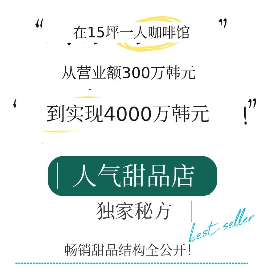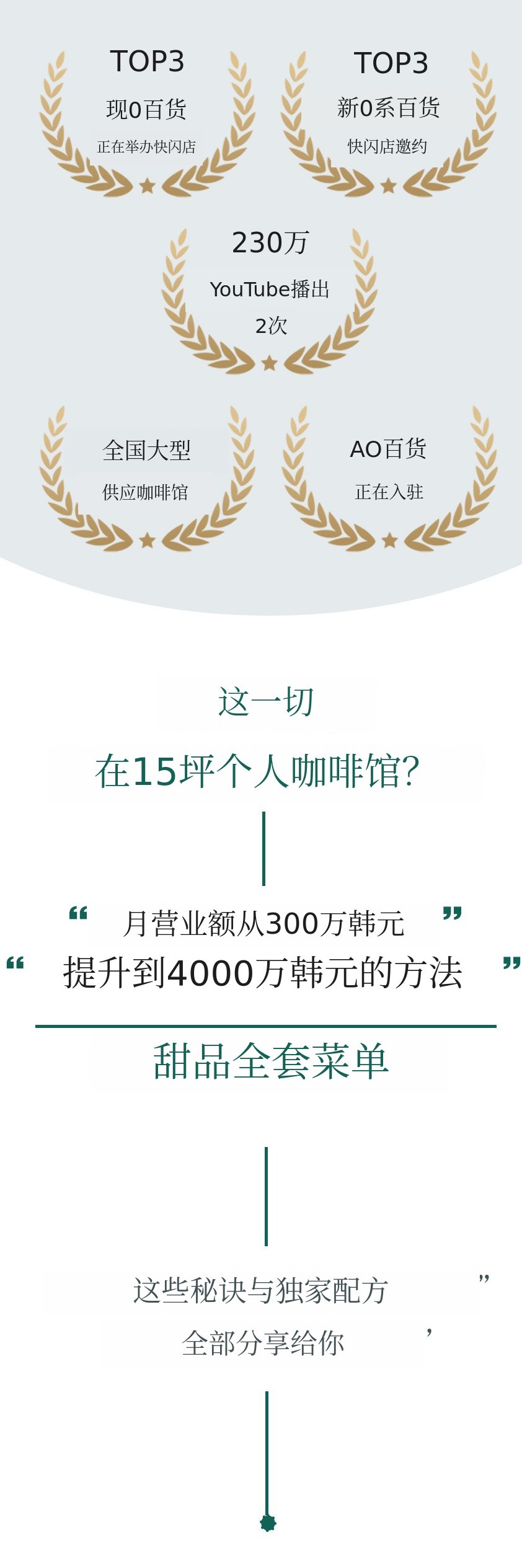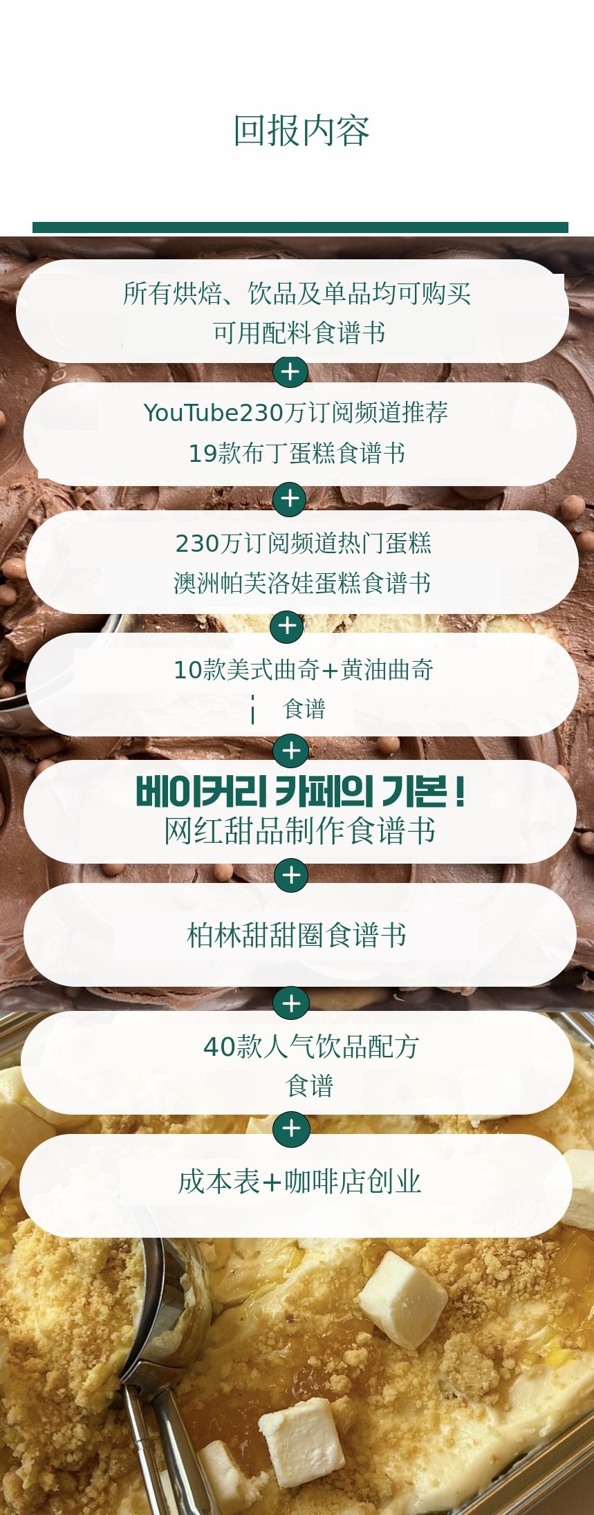1. 🍰 社区咖啡店4000万月销秘方 - 15坪咖啡店实现4000万月销的甜点结构公开 2. 📚 验证80余种甜点食谱 - 提供适合初学者的易学签名甜点食谱 3. 🎥 230万订阅YouTube播出 - 两次在热门频道播出,确保食谱可信和宣传效果