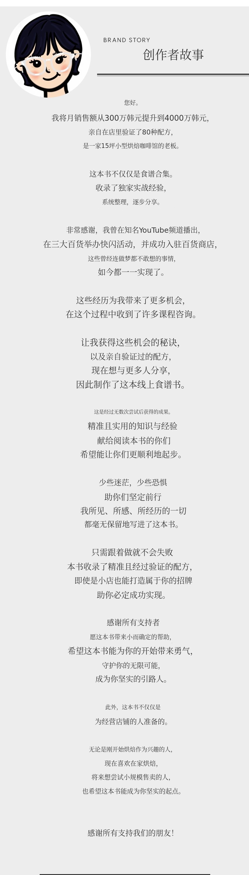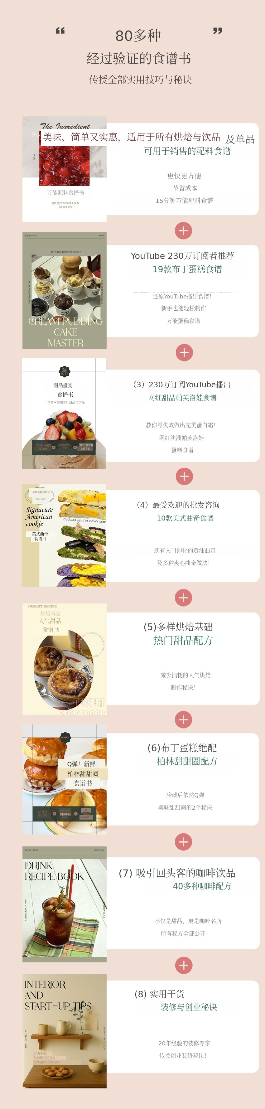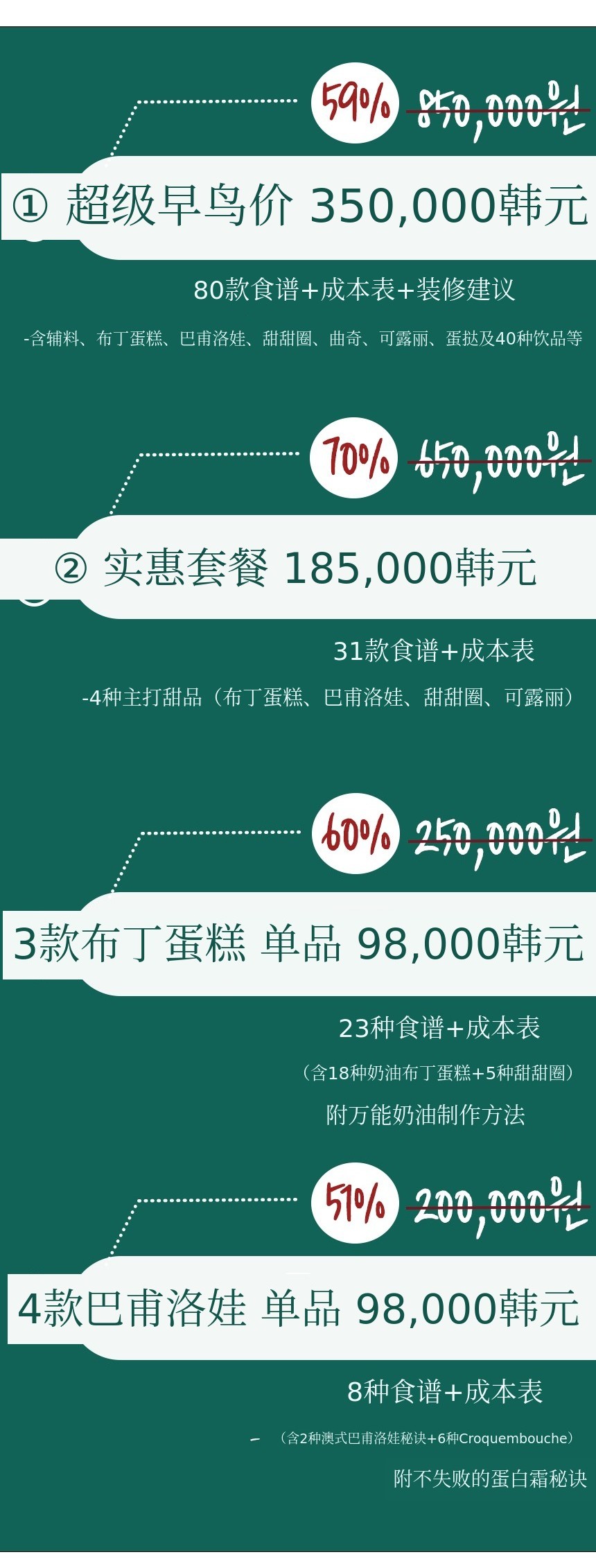 1. 🍰 社区咖啡店4000万月销秘方 - 15坪咖啡店实现4000万月销的甜点结构公开 2. 📚 验证80余种甜点食谱 - 提供适合初学者的易学签名甜点食谱 3. 🎥 230万订阅YouTube播出 - 两次在热门频道播出,确保食谱可信和宣传效果