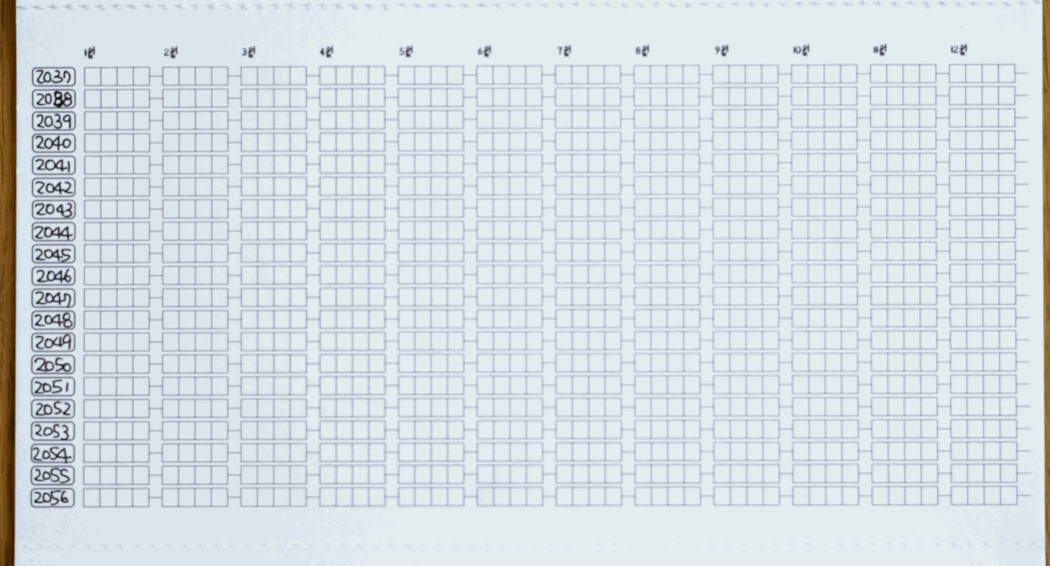 首先在笔记本左侧的竖行上,从出生年份一直写到我一百岁的年份。每一行的右侧画上52个格子,用来表示一年。每个方格里填上七条线。一条线代表一天。