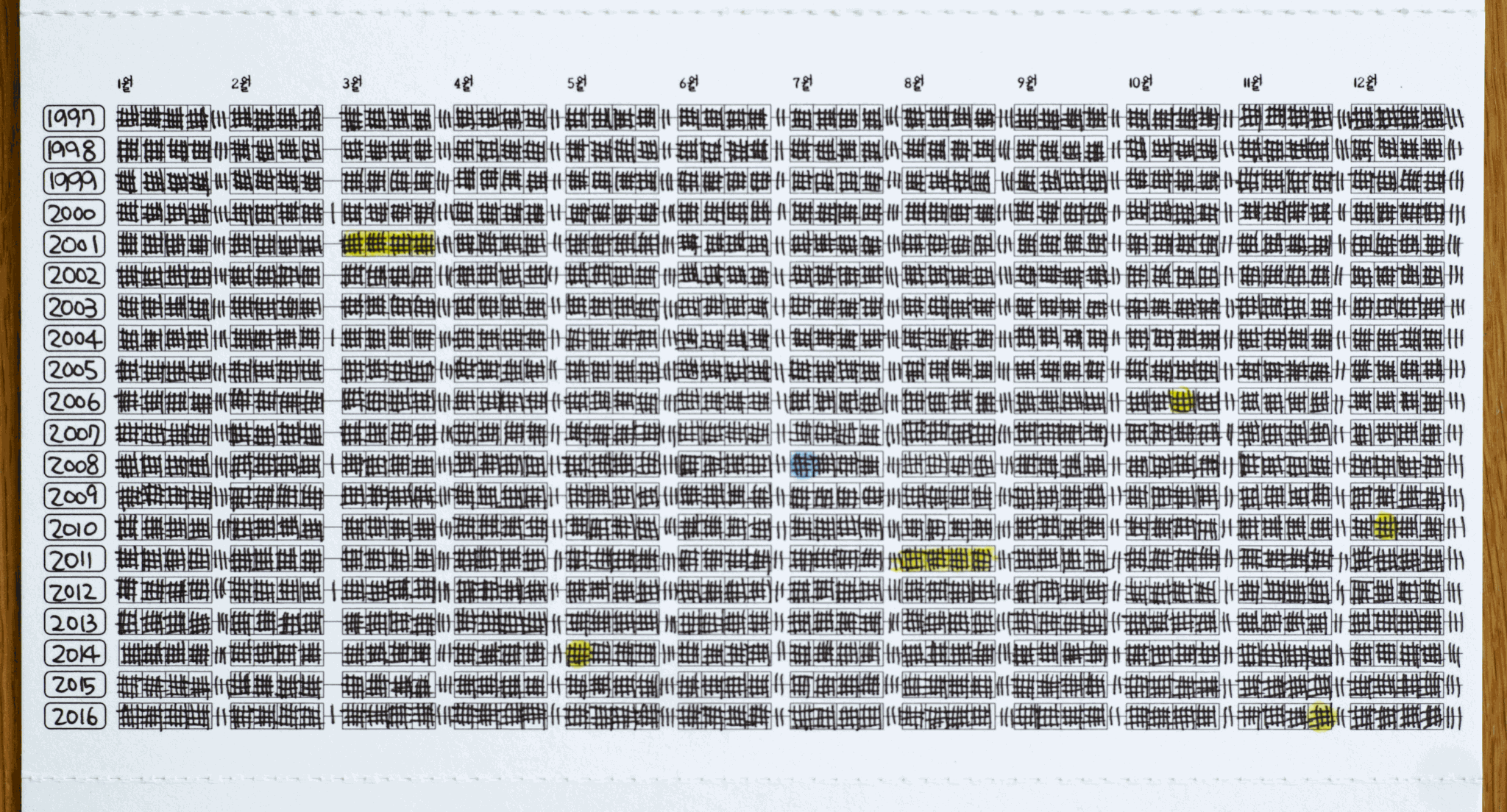 用线条描绘我至今为止活过的日子的重复行为,在这个过程中遇到的意外回忆,以及最终能一眼看到我所有日子的体验。反复用线条描绘我至今为止活过的日子,在这个过程中遇到的意外回忆,以及最终能一览无余地看到我所有日子的体验。