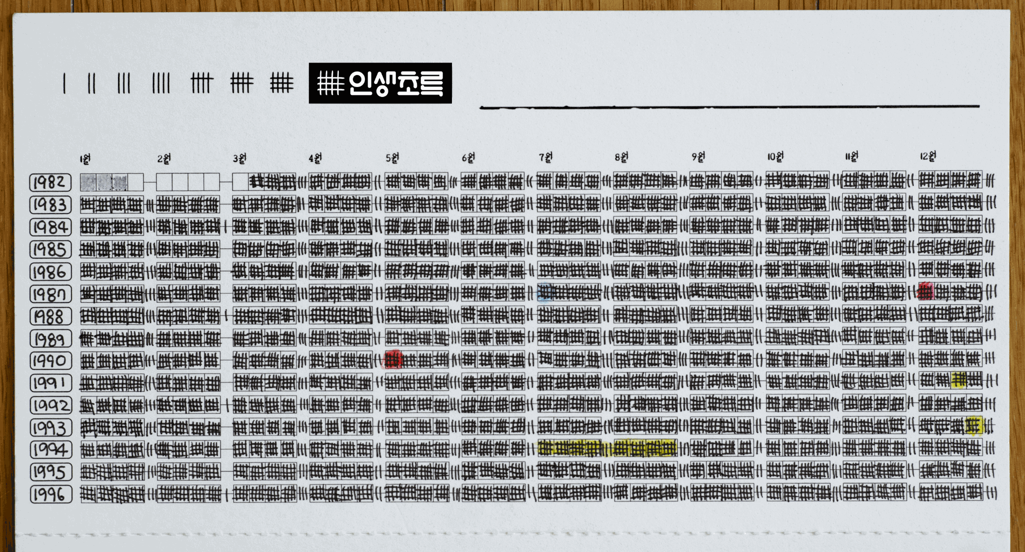 我的同事说,他把《人生抄录》交给父母,坐在他们身边,看着他们画线。就像做108拜一样,只是一个个地画着线条,但在这个过程中,父母能够不断回忆起那些连自己都早已忘记、埋藏在记忆深处的珍贵往事。例如,年过七旬的母亲想起了1958年五岁时的记忆:服兵役的父亲每次休假回来,都会在裤兜里装满饼干带回家。找回那段遗忘的记忆时,母亲笑着说“对啊,那时候”,仿佛回到了当年一样幸福地诉说着。