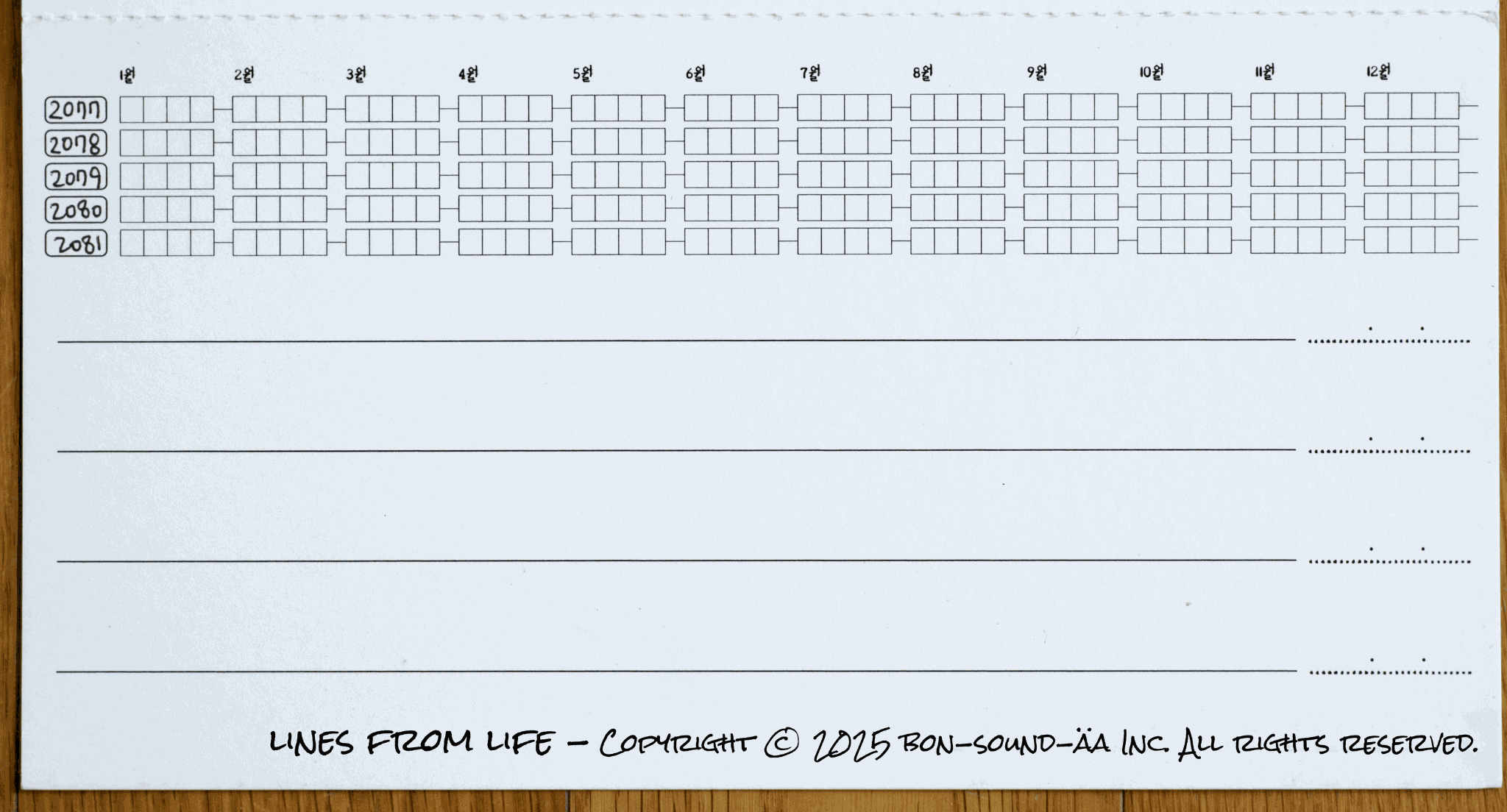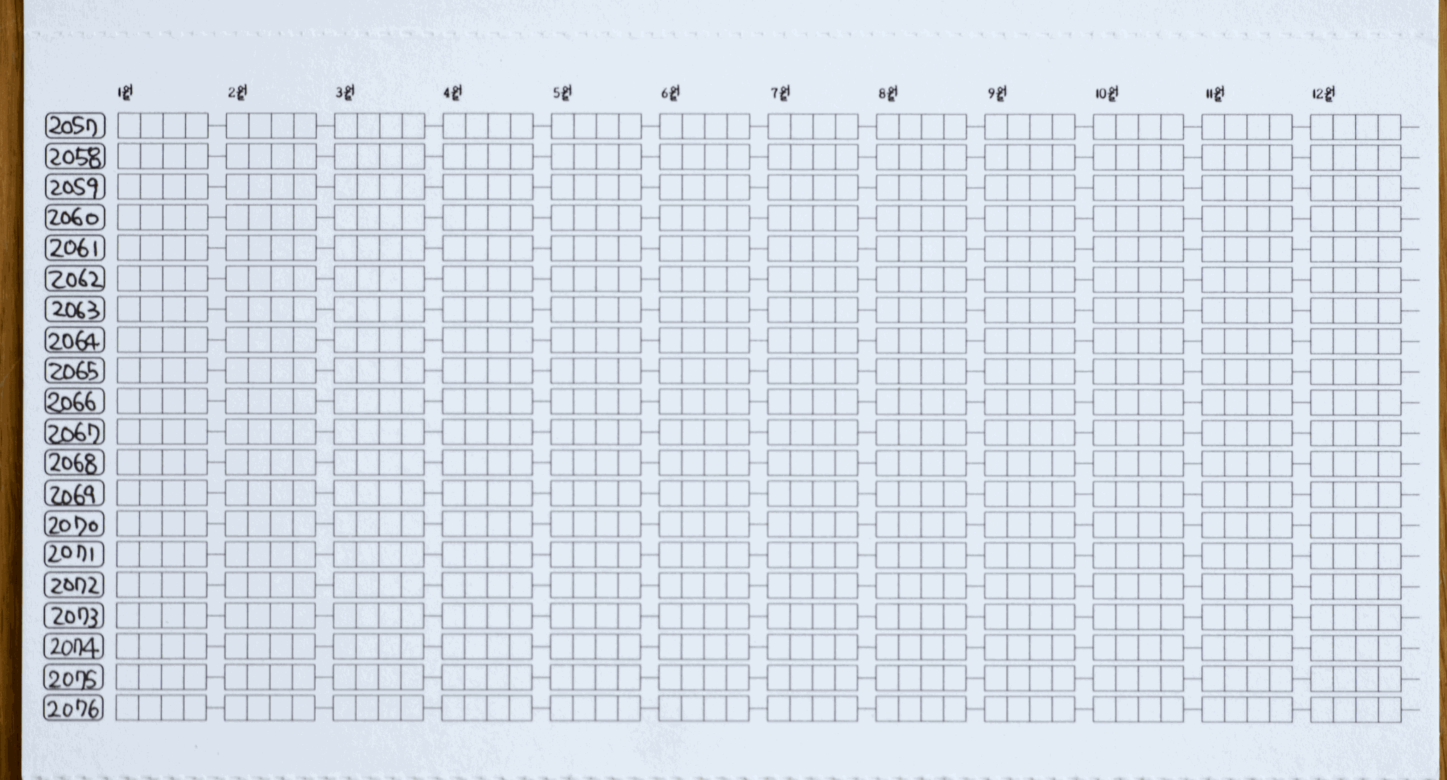 用线描绘走过的日子,体验直观面对无数日子的过程。思考自己的人生会在这方格的哪里结束。仅凭“活过”这一事实,就足以肯定我的人生已经很伟大。用一条条线描绘走过的日子,直观地面对累积的无数时光。思考自己的人生会在这个格子的哪里结束。仅凭“活过”这一事实,我们的人生就已经足够伟大。