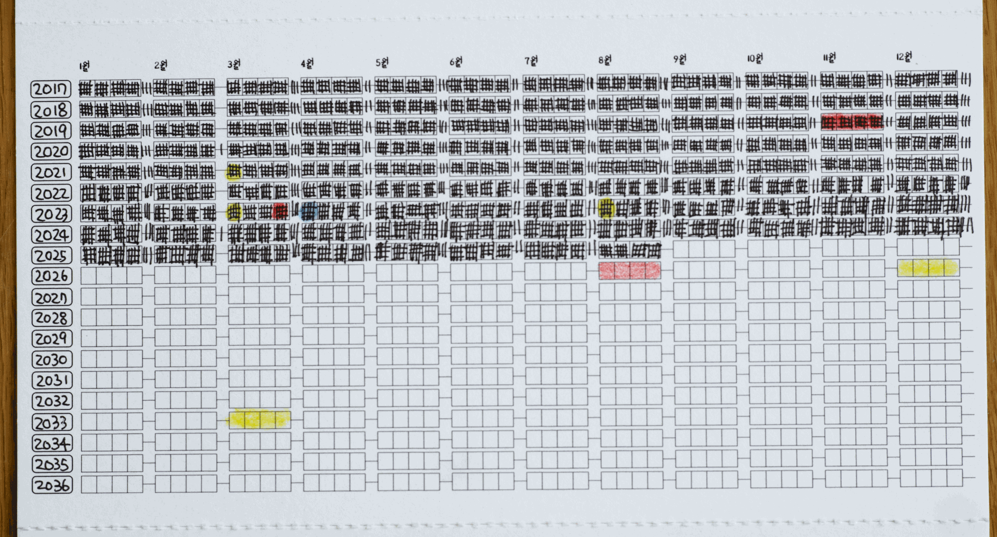 电影中被困在无人岛上的人所做的那件事。我决定试着做做那种只是用线划过自己活过的日子的简单而重复的行为。就这样,带着轻松的心情,只是为了打发无聊,拿出了方格笔记本。