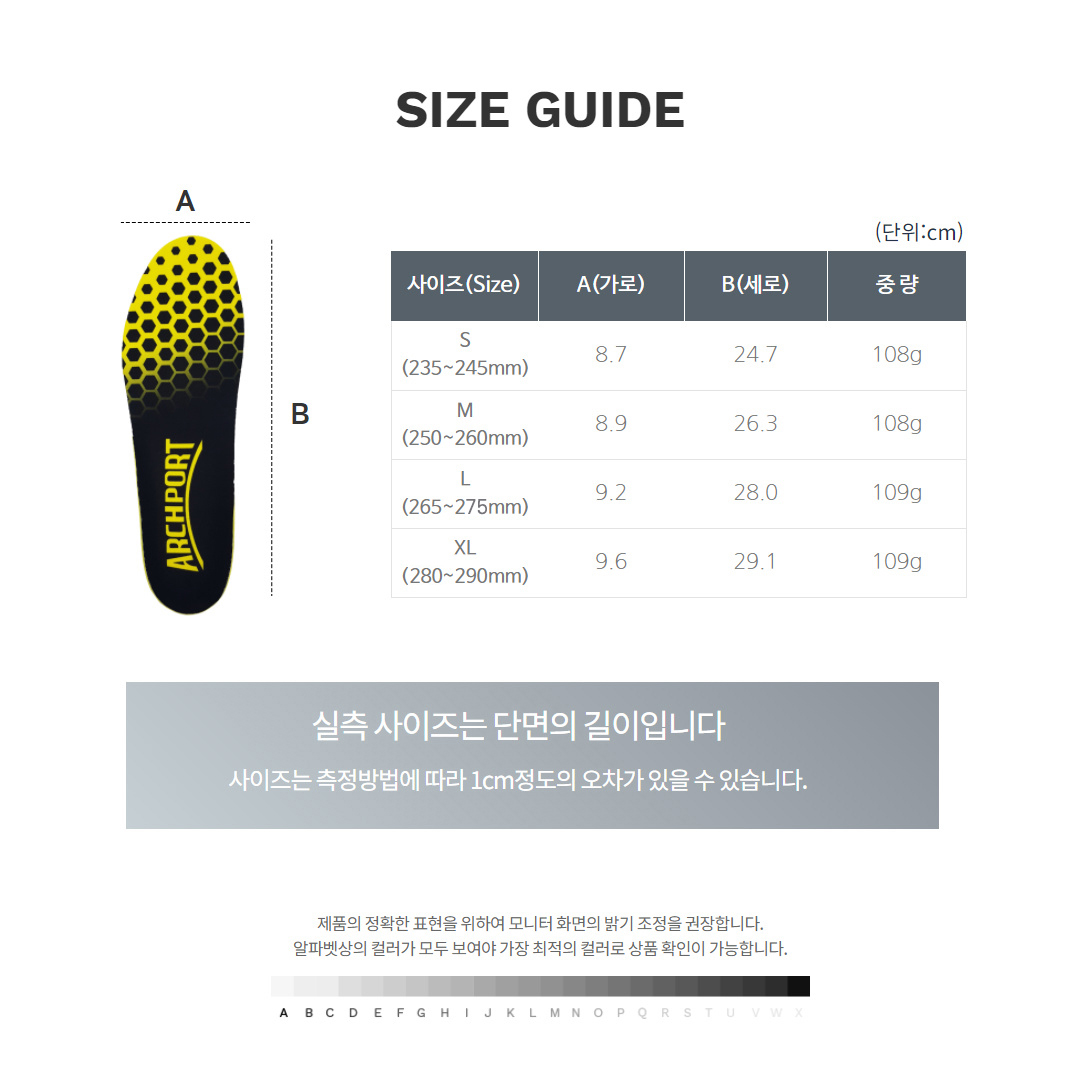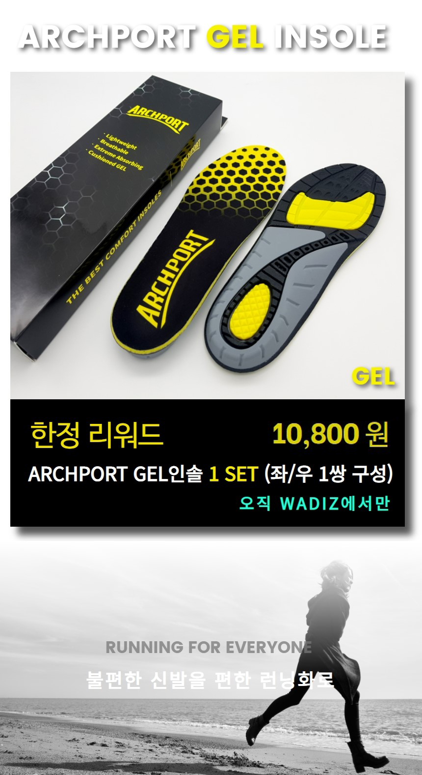 이번 펀딩에서는 인솔 내부의 로고 프린팅, 논슬림 홀 길이 미세변경 되었습니다. (ARCHPORT GEL인솔은 와디즈에서만 단독 유통합니다.)