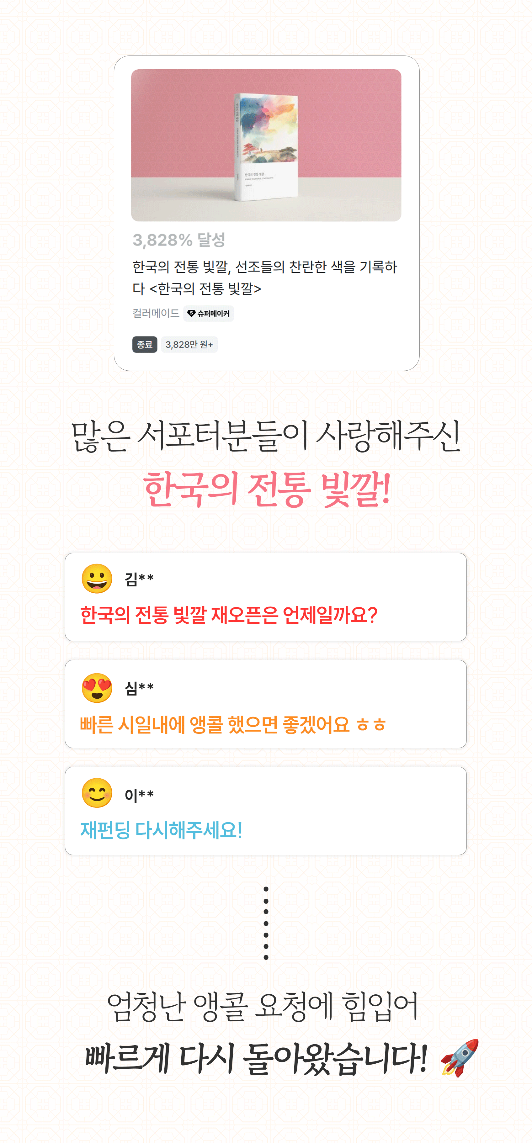 目前我们的工作室里有很多关于韩国服饰、工艺品、纹样、配色等韩国设计相关的书籍,这都得益于过去的制作经验。我们坚信韩国的美丝毫不逊于西方。为了将我们的信念变为现实,我们决定通过Wadiz对韩国传统色彩相关的图录进行归档。 希望韩国美丽的色彩能再次展现在人们面前,再次融入日常生活。我们会制作一本足够有价值的书。请多多关注用美丽色彩渲染的《韩国的传统色彩》图录。