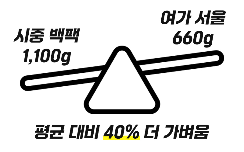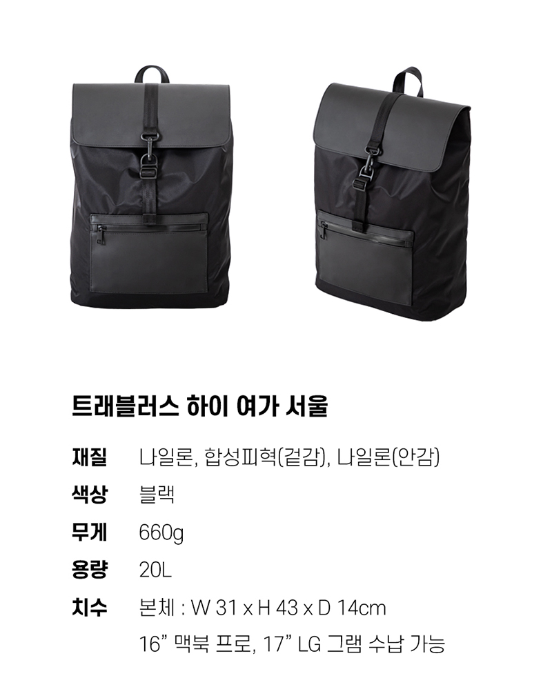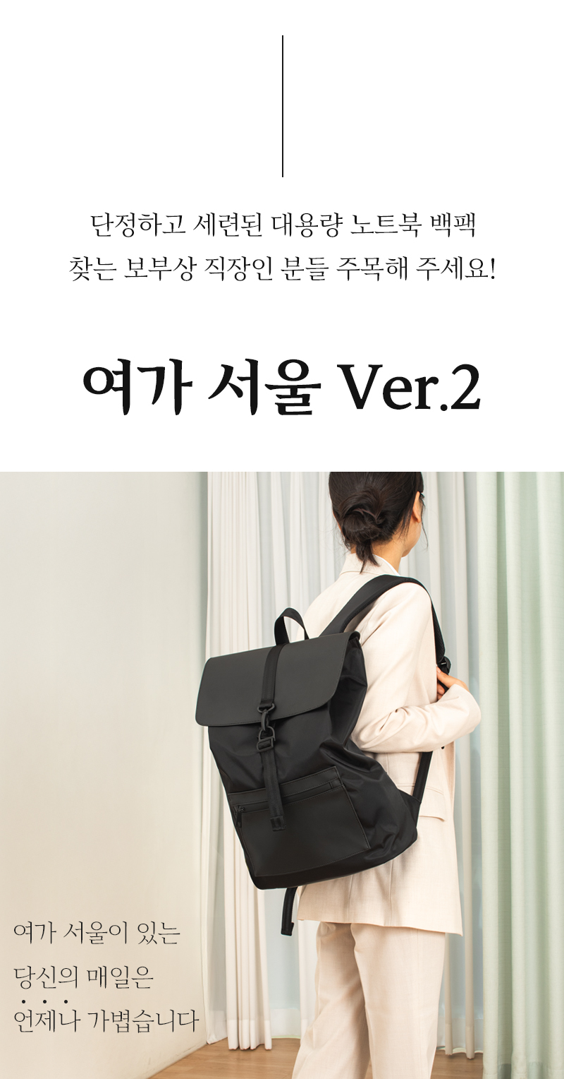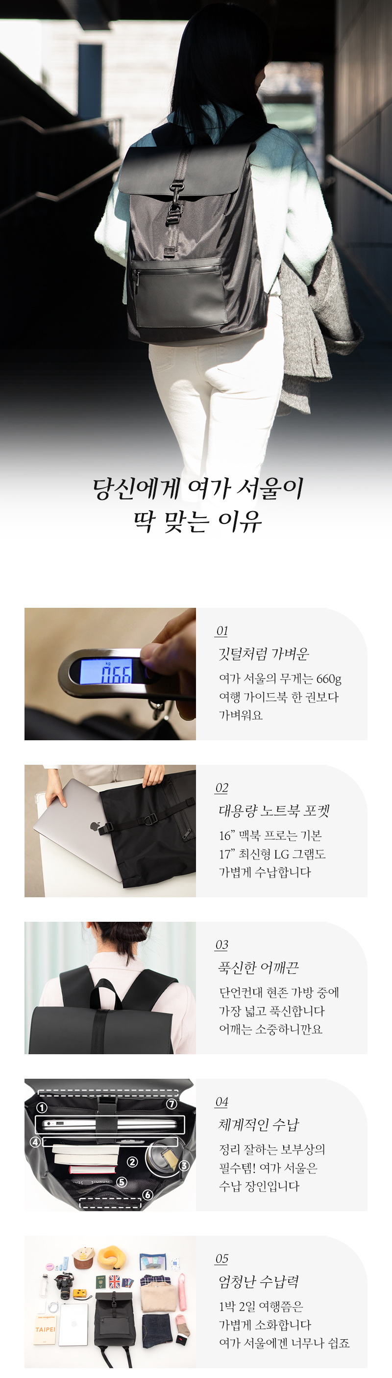 시중 대부분의 가방은 1 ~ 1.5kg 사이의 무게를 가지고 있습니다. 여가 서울은 그런 백팩들과 비교해서 최소 40%가 더 가볍습니다.