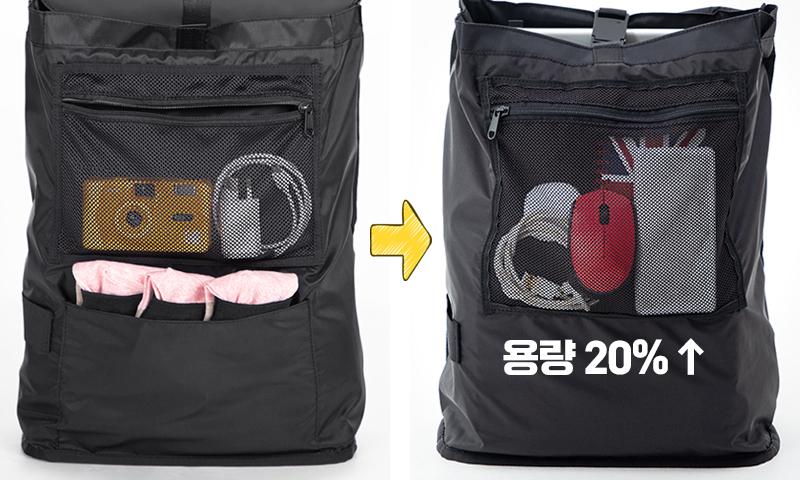 - 쓰기 어려웠던 메인 수납부 하단 오픈 포켓을 제거했습니다. 대신 상단 지퍼 매쉬 포켓의 용량이 20% 늘어났습니다.