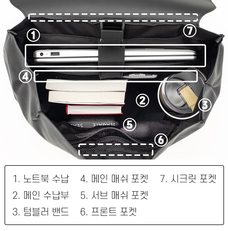 다양한 짐을 체계적으로 수납할 수 있도록 포켓 배치에 심혈을 기울였습니다. 여가 서울의 수납 공간은 넉넉하고 직관적입니다.
