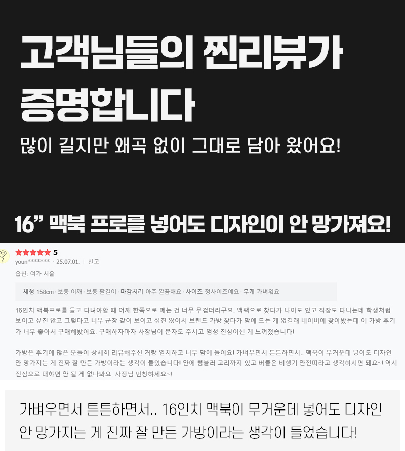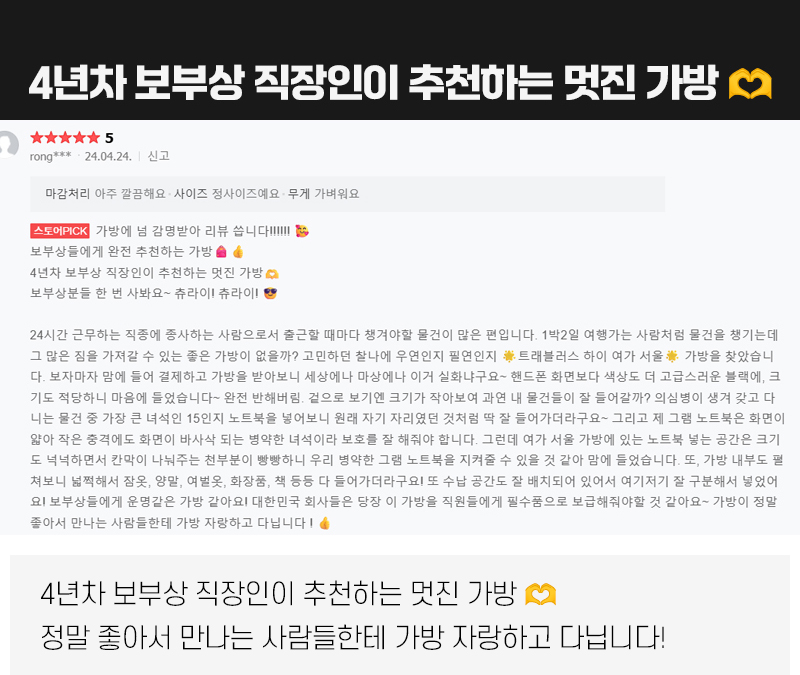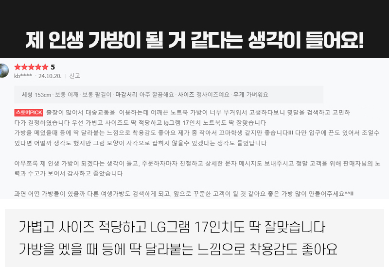 오래 착용해도 다른 가방에 비해서 어깨가 훨씬 가볍고 편합니다.