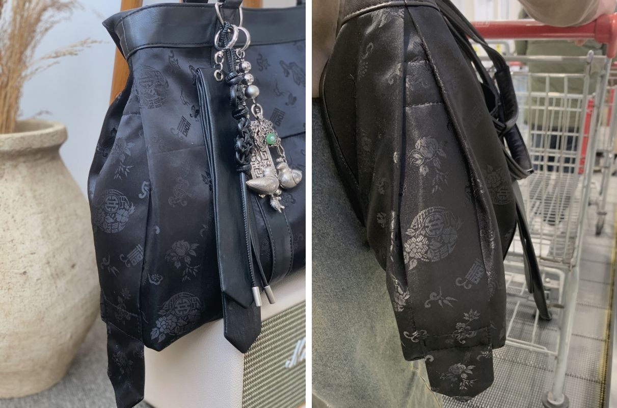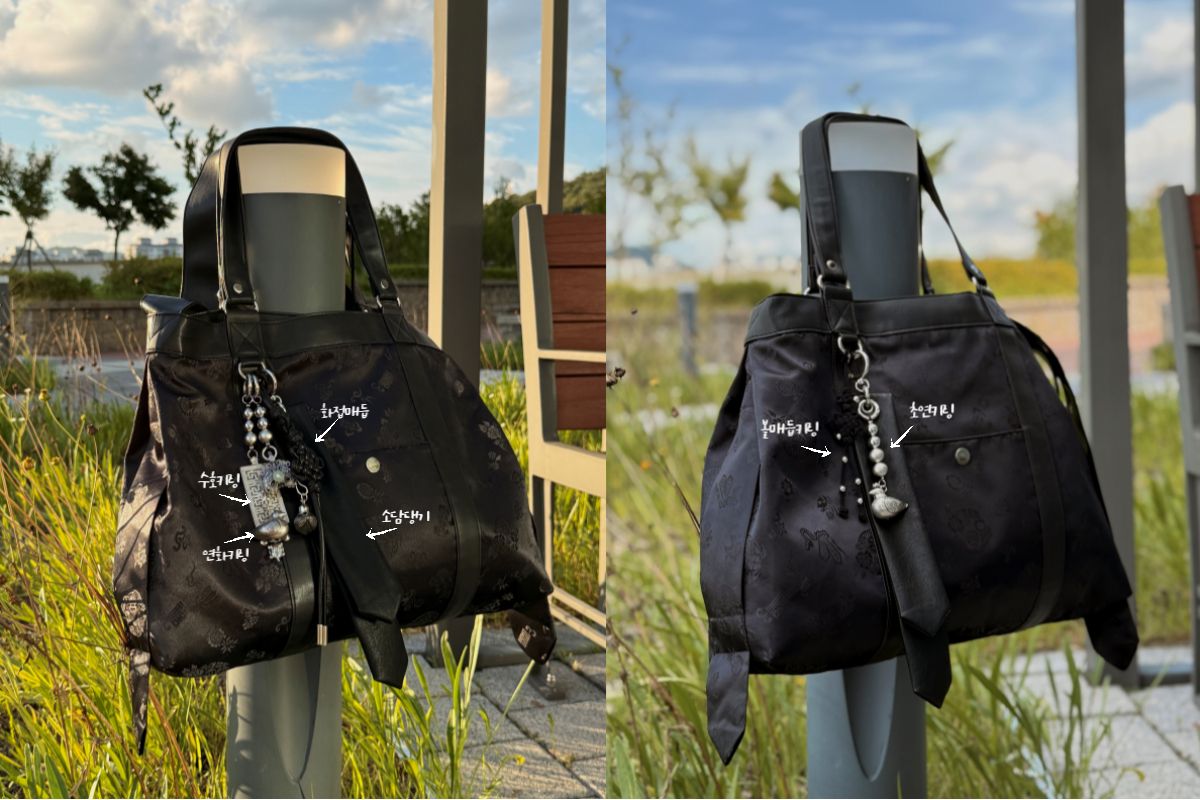 한복 노리개에서 영감을 받은 키링과 전통 한복원단을 사용한 비건레더 가방은 단순히 예쁘기만 한 게 아니라 실용성, 편안함, 그리고 전통의 가치까지 담아낸 아이템이에요.