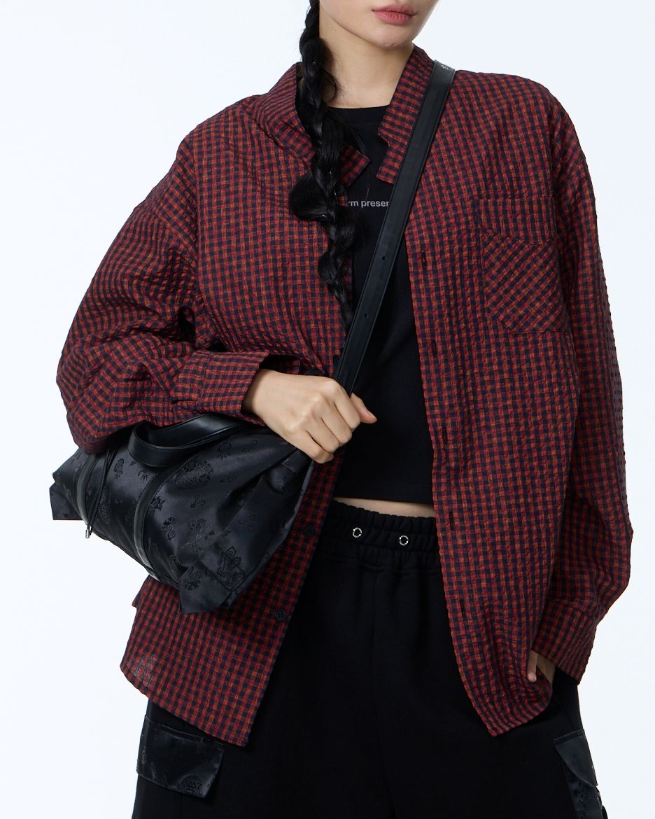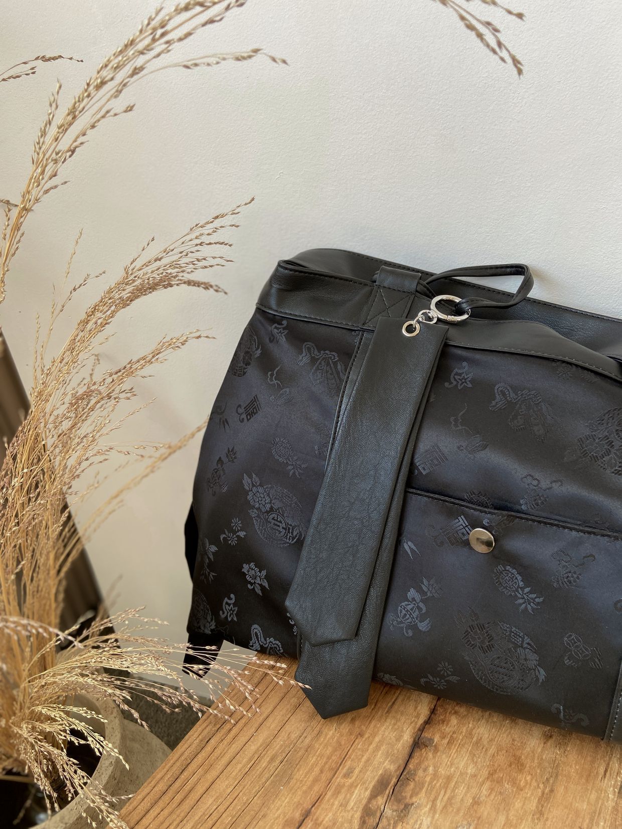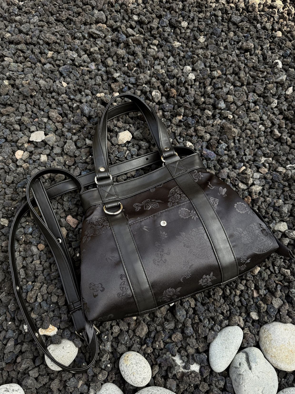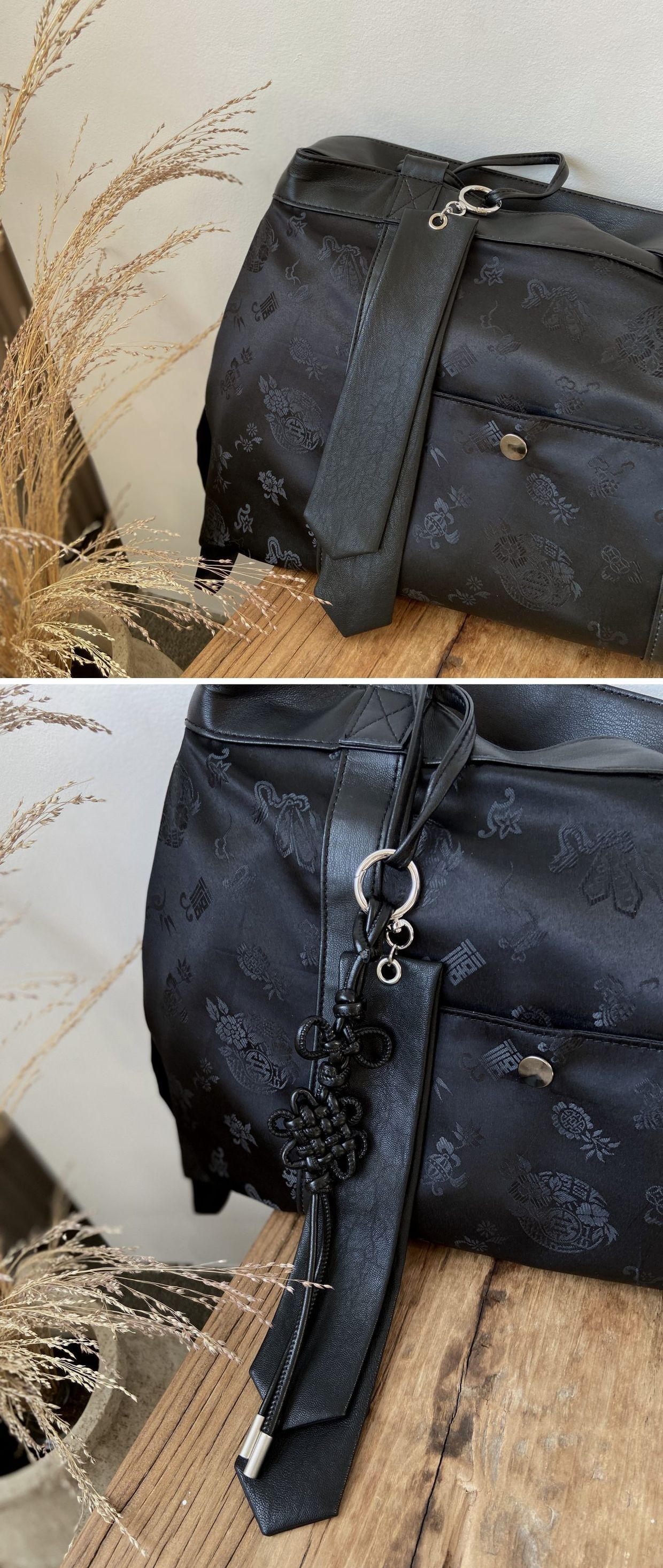 전통적인 한복 원단을 사용하여 고급스럽고 독특한 디자인을 자랑합니다. 가방 원단 패턴은 고유한 전통 문양을 담고 있어 가방의 멋을 한층 더 업! 한복원단의 특유의 아름다움과 비건레더의 세련됨을 담아낸 디자인입니다.