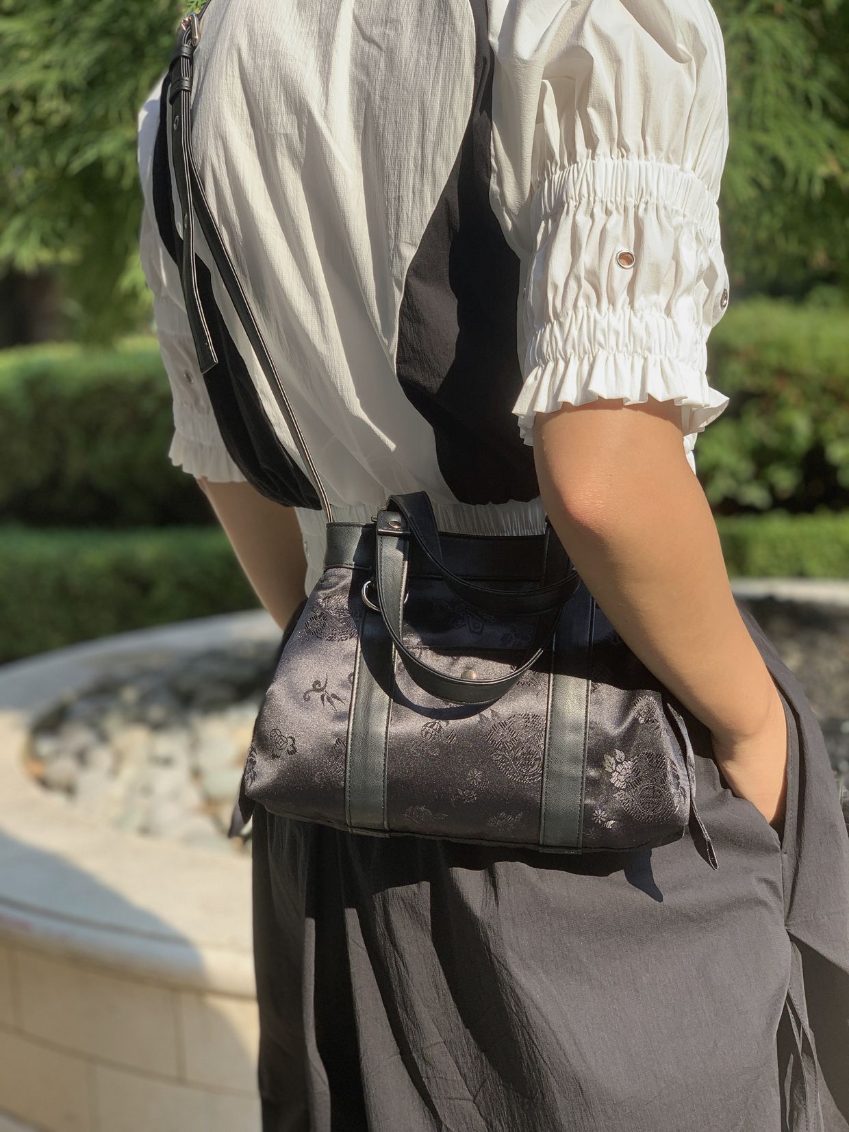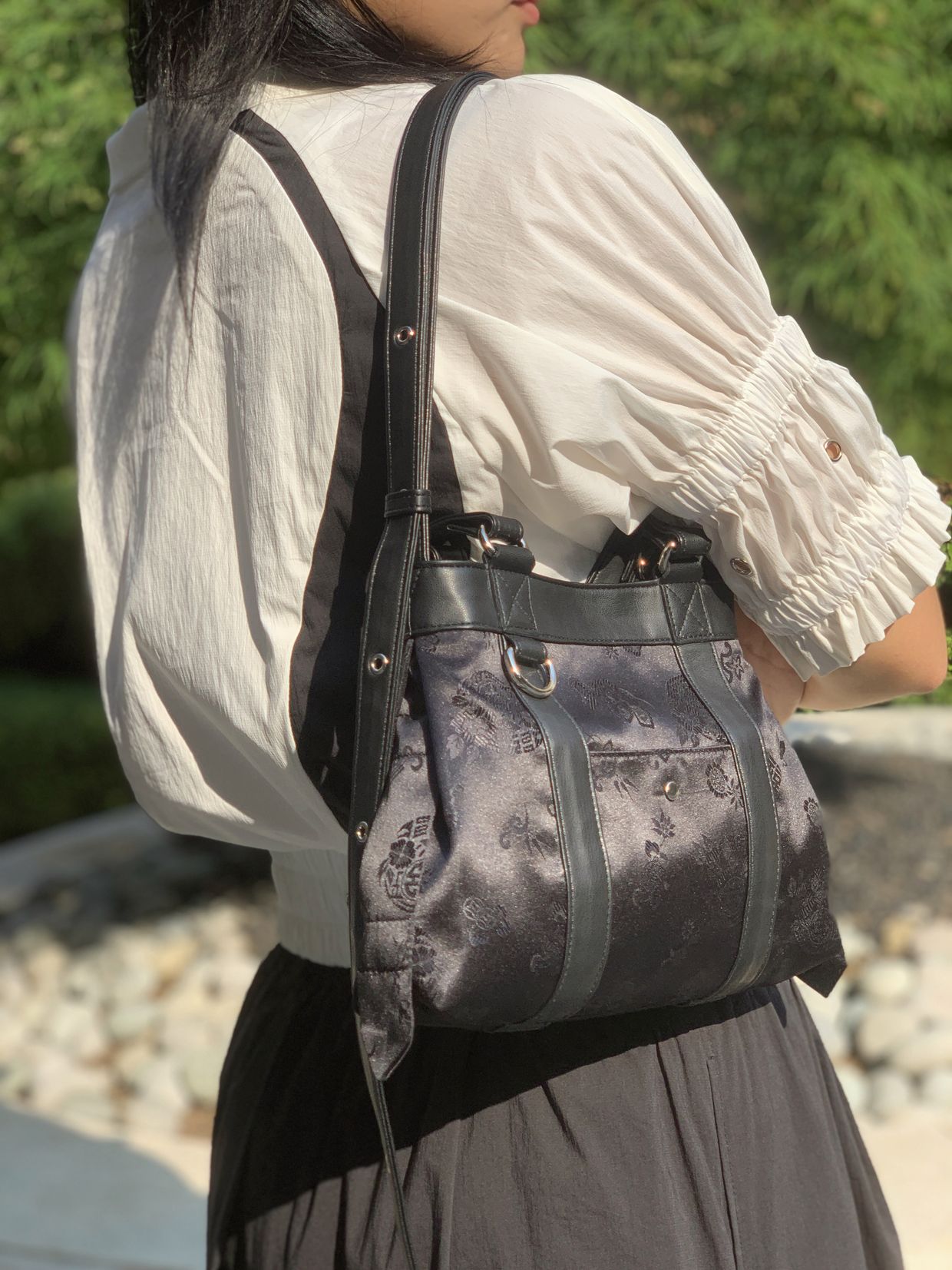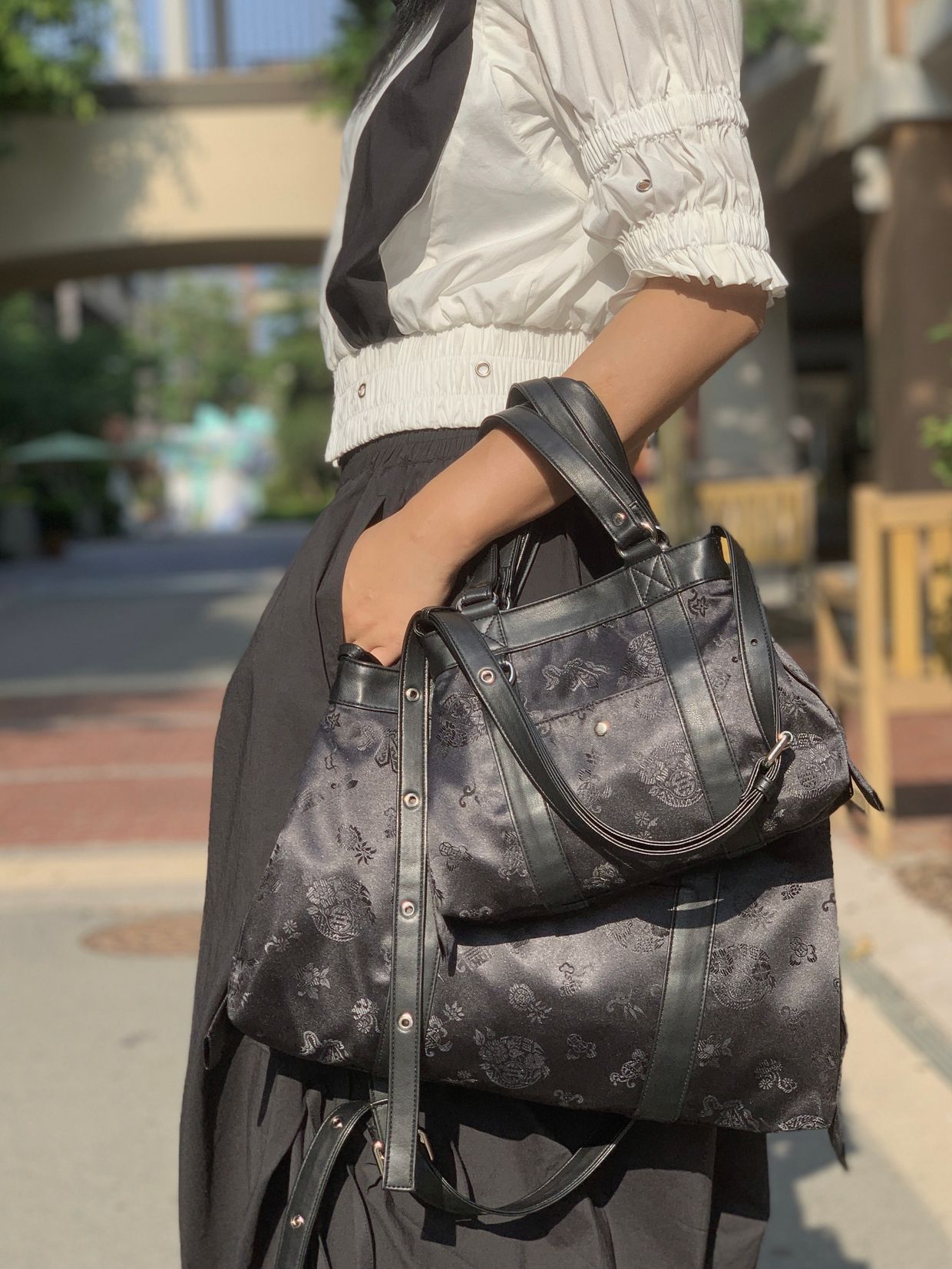 전통적인 한복 원단을 사용하여 고급스럽고 독특한 디자인을 자랑합니다. 가방 원단 패턴은 고유한 전통 문양을 담고 있어 가방의 멋을 한층 더 업! 한복원단의 특유의 아름다움과 비건레더의 세련됨을 담아낸 디자인입니다.