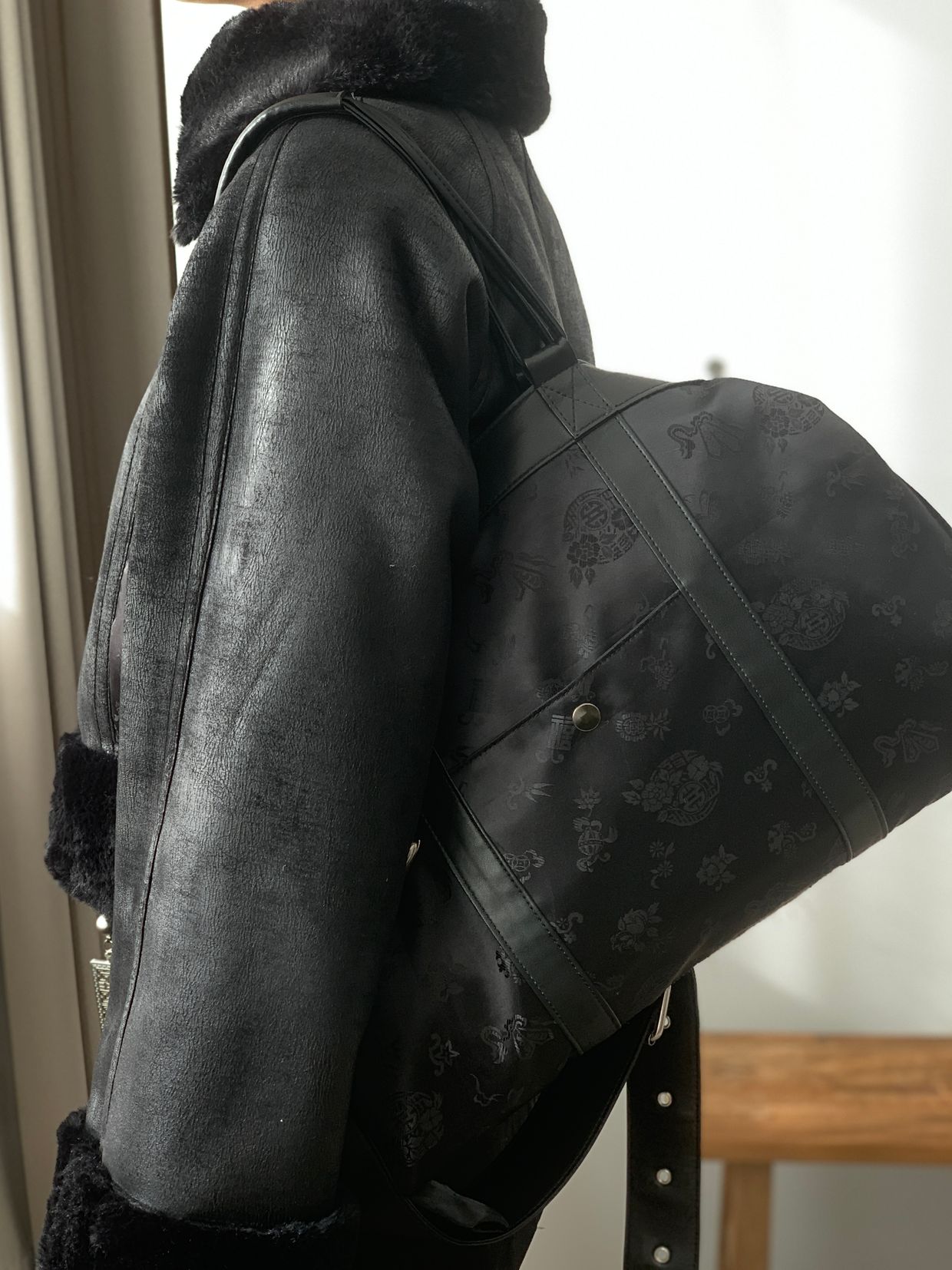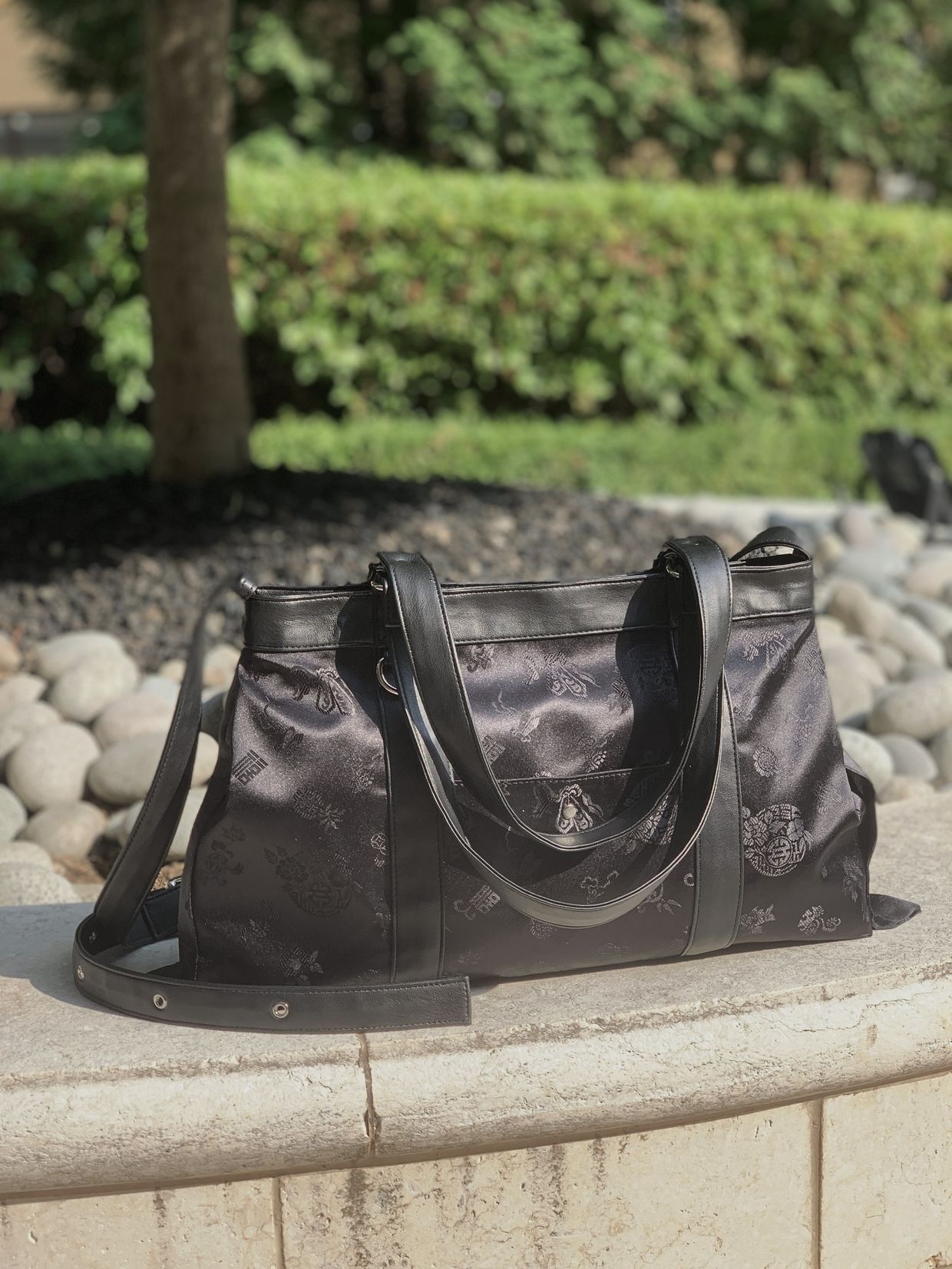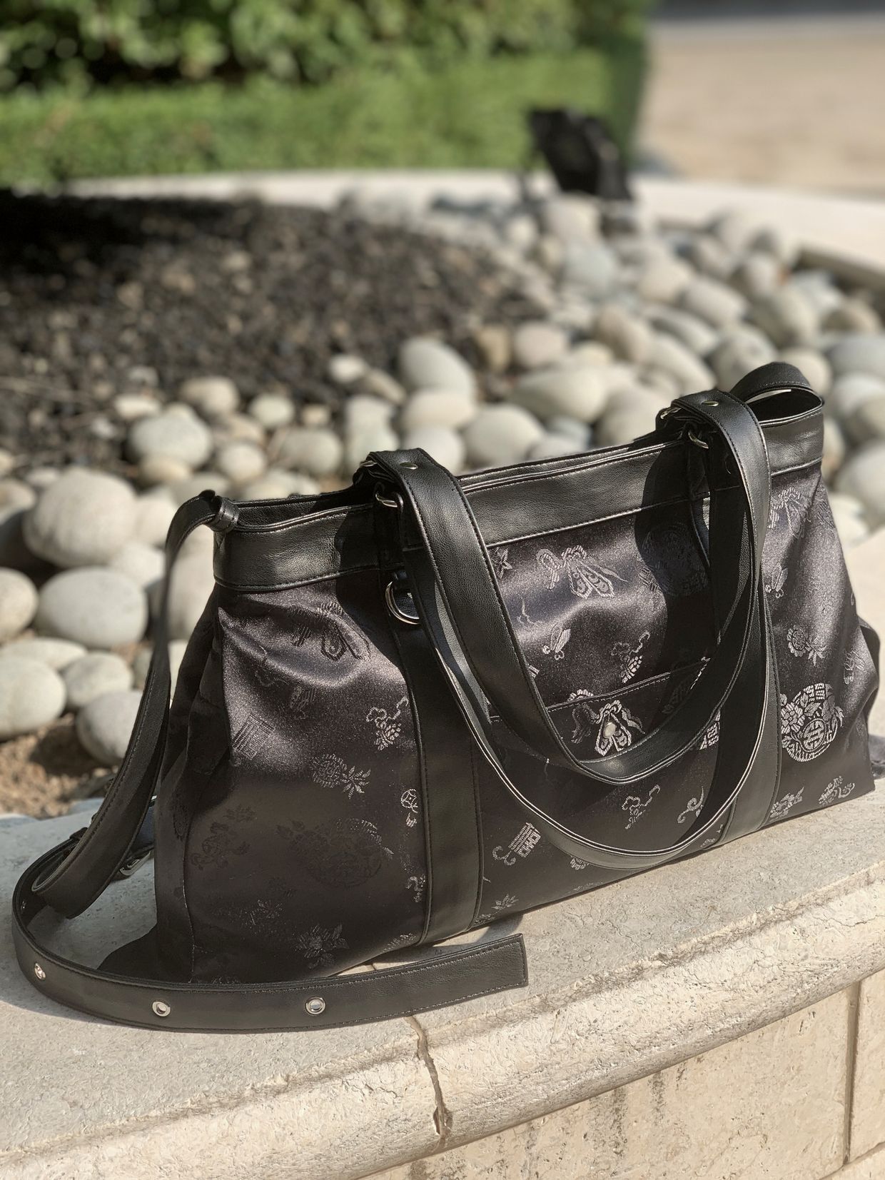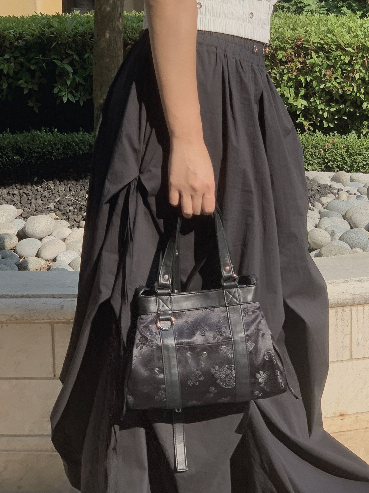 전통적인 한복 원단을 사용하여 고급스럽고 독특한 디자인을 자랑합니다. 가방 원단 패턴은 고유한 전통 문양을 담고 있어 가방의 멋을 한층 더 업! 한복원단의 특유의 아름다움과 비건레더의 세련됨을 담아낸 디자인입니다.