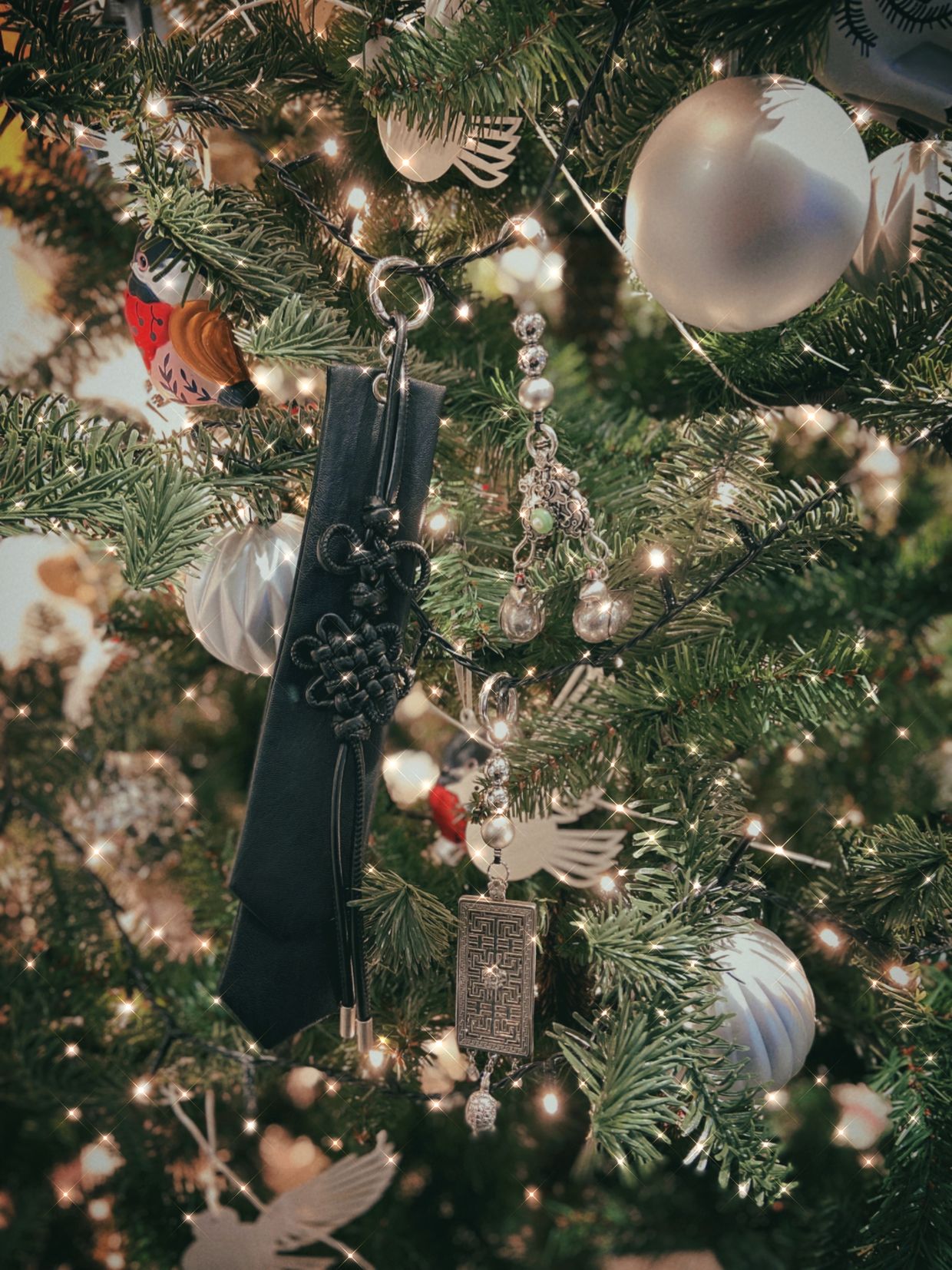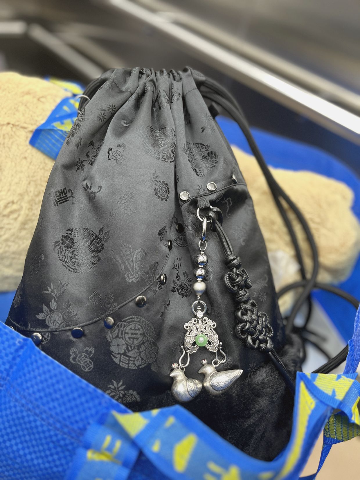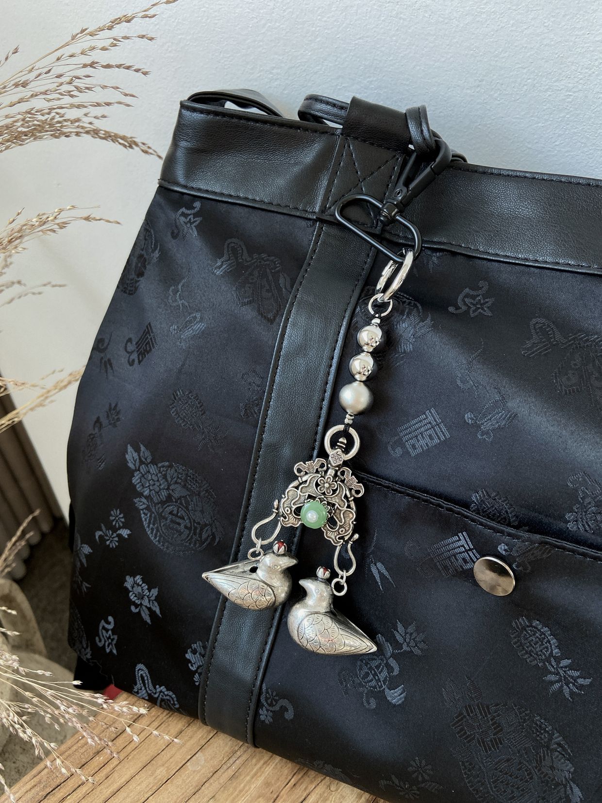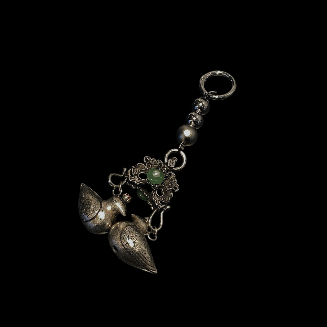 은은한 실버 컬러의 금속 구슬과 섬세하게 새겨진 원앙 장식이