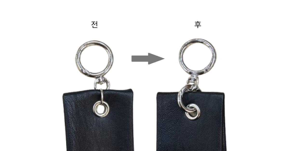 기존의 얇은 O링에서 더 굵고 연결 구멍이 있는 키링고리로 변경하였습니다.