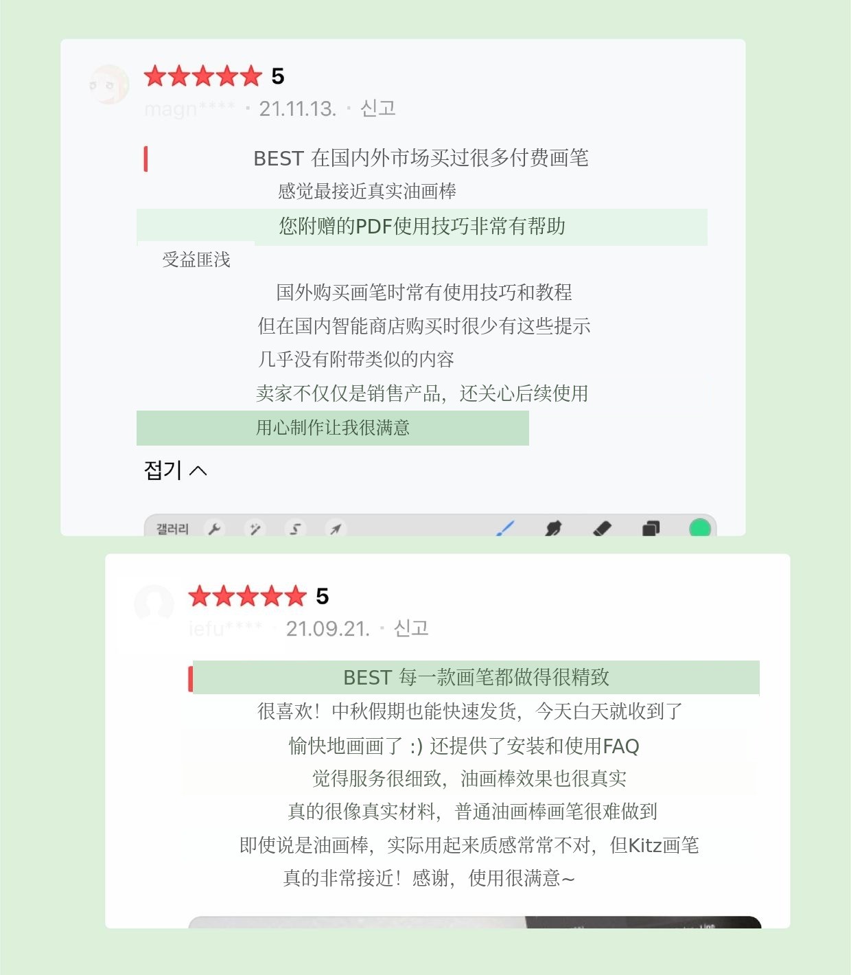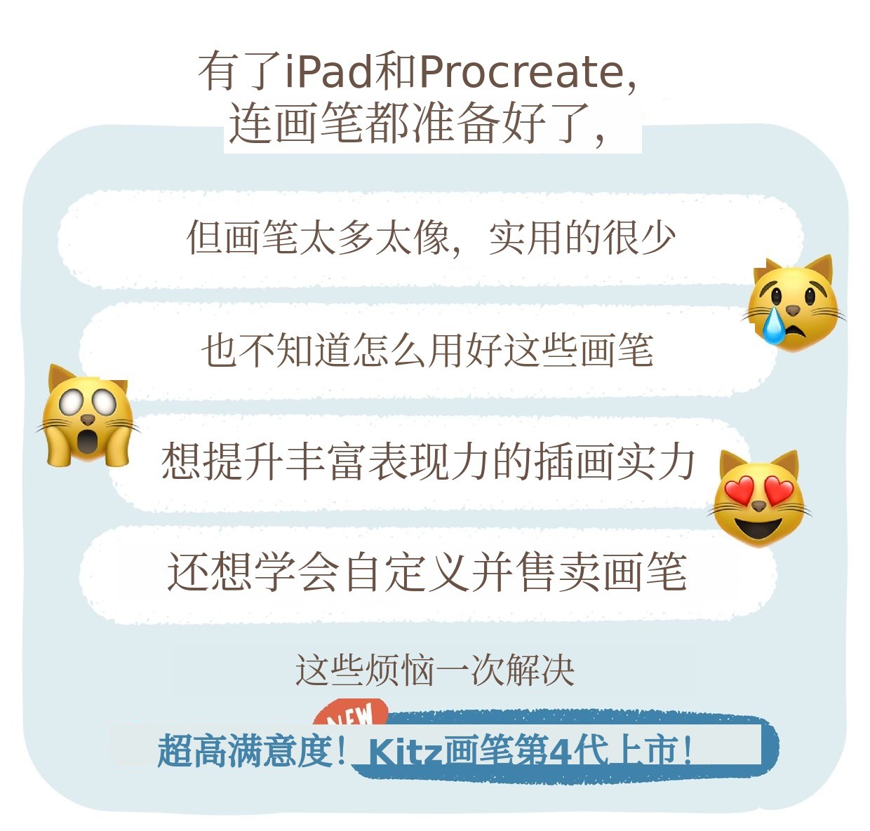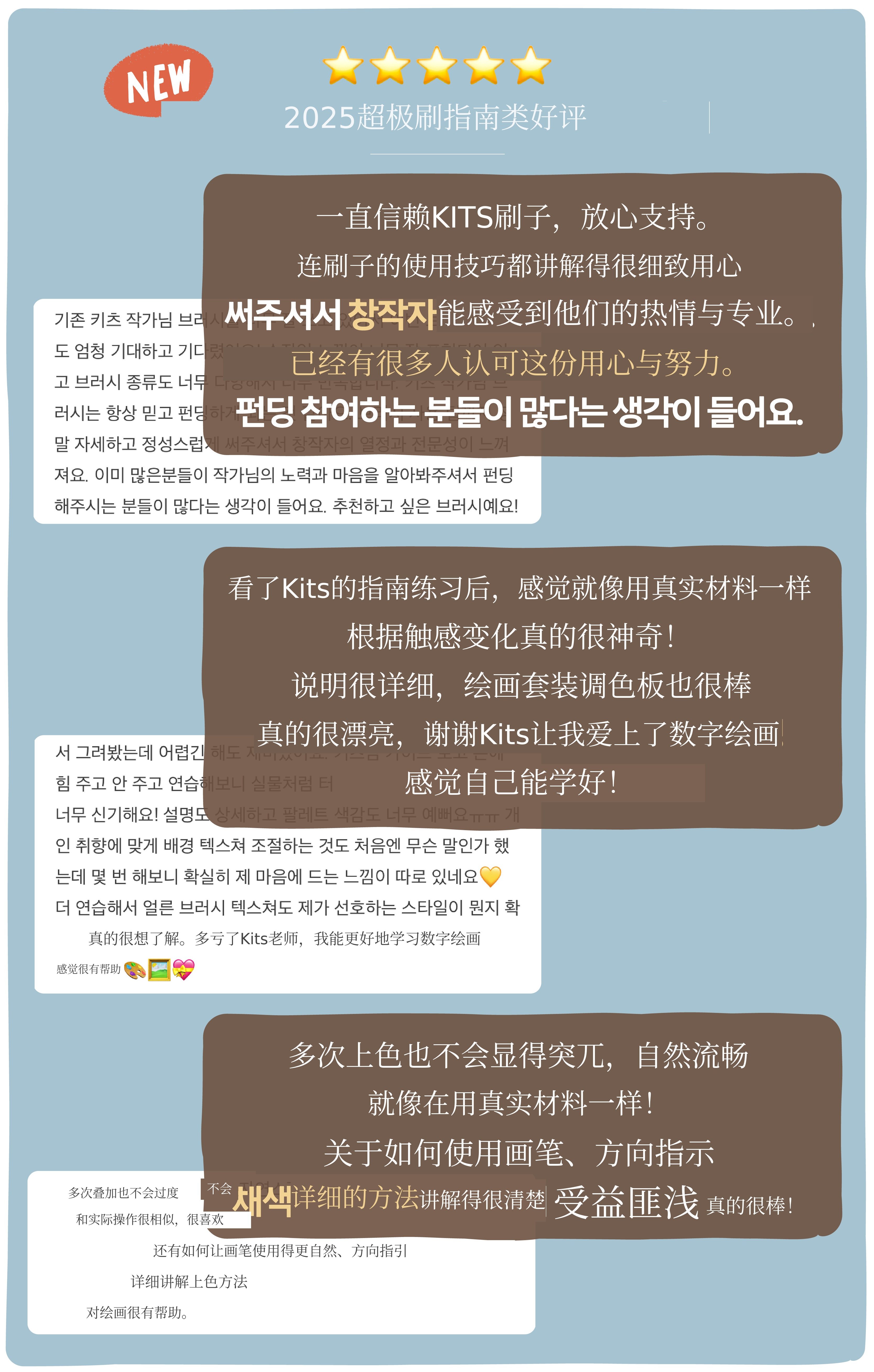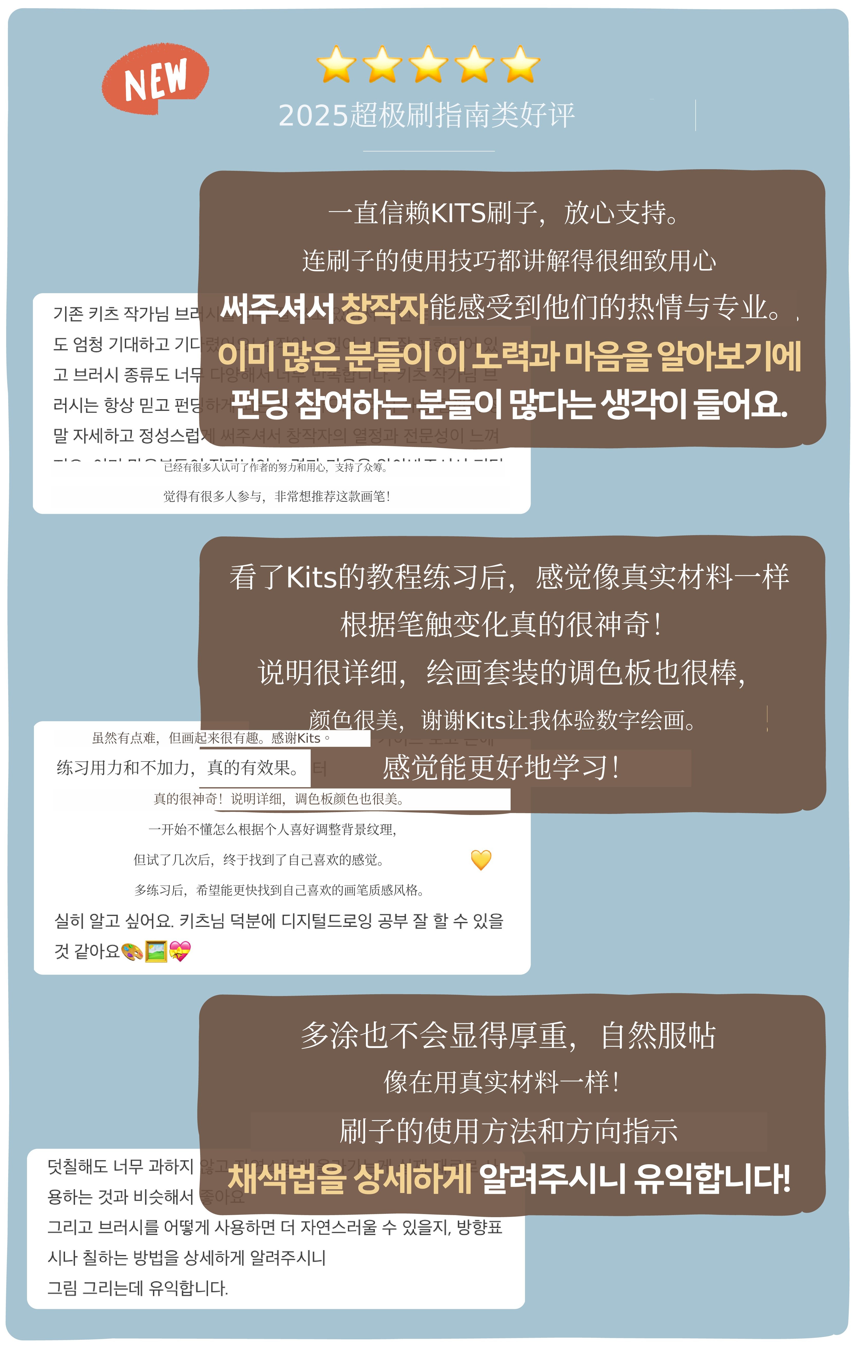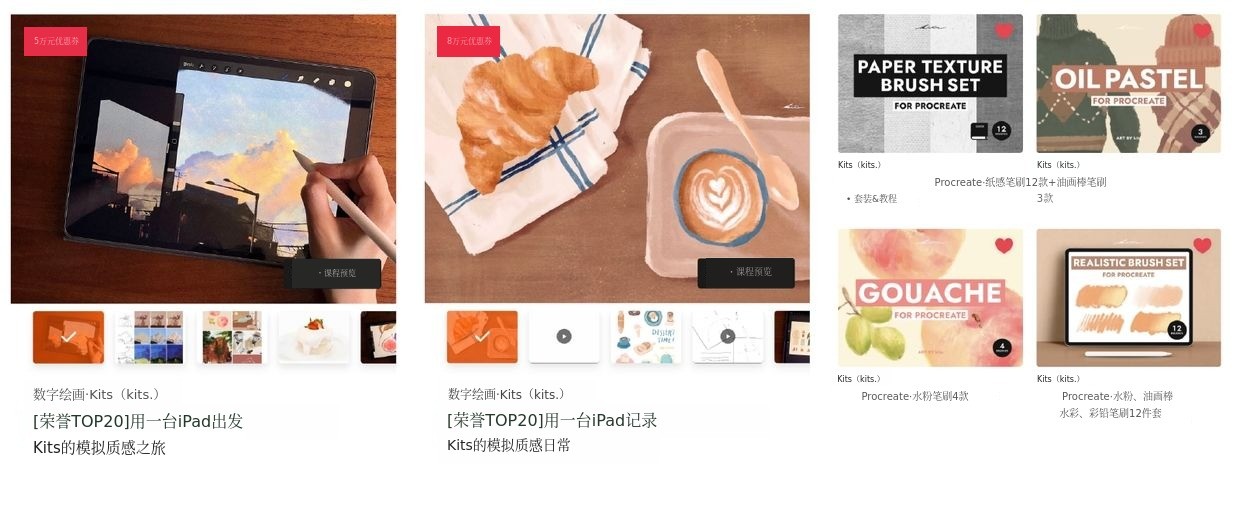 Kits Brush曾入选Class101 TOP20 通过iPad绘画“模拟质感”系列课程自2020年1月起,提供包含水粉、油画棒、水彩、彩色铅笔等材料及纸张质感的定制笔刷套装 开始提供。