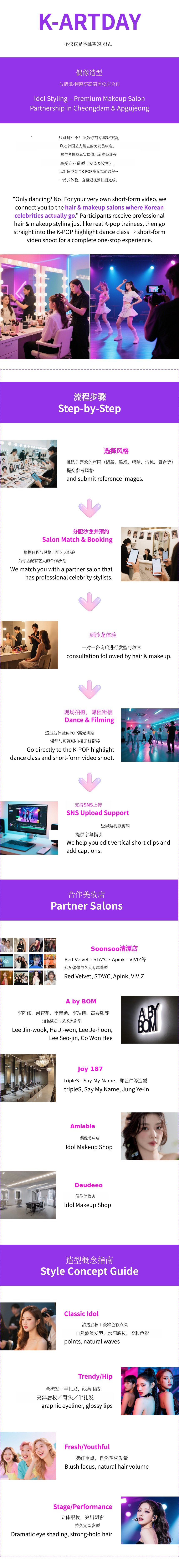 我们运营的K-Artday是以首尔弘大和江南为中心,外国游客可以在一个地方体验K-POP舞蹈课程、偶像造型、短视频拍摄的韩国唯一一站式K-文化一日体验课程。