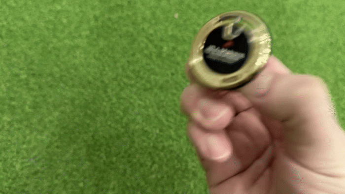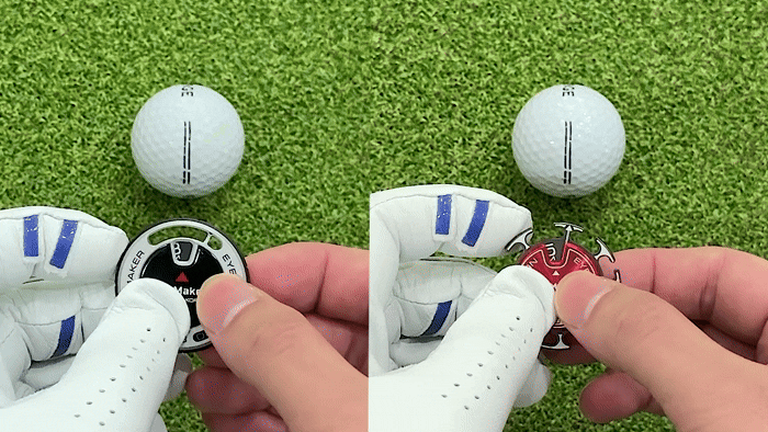 4. 볼마커 타이어휠을 에이밍 라인으로 조정한 뒤 공과 홀컵의 라인을 맞출 수 있습니다.