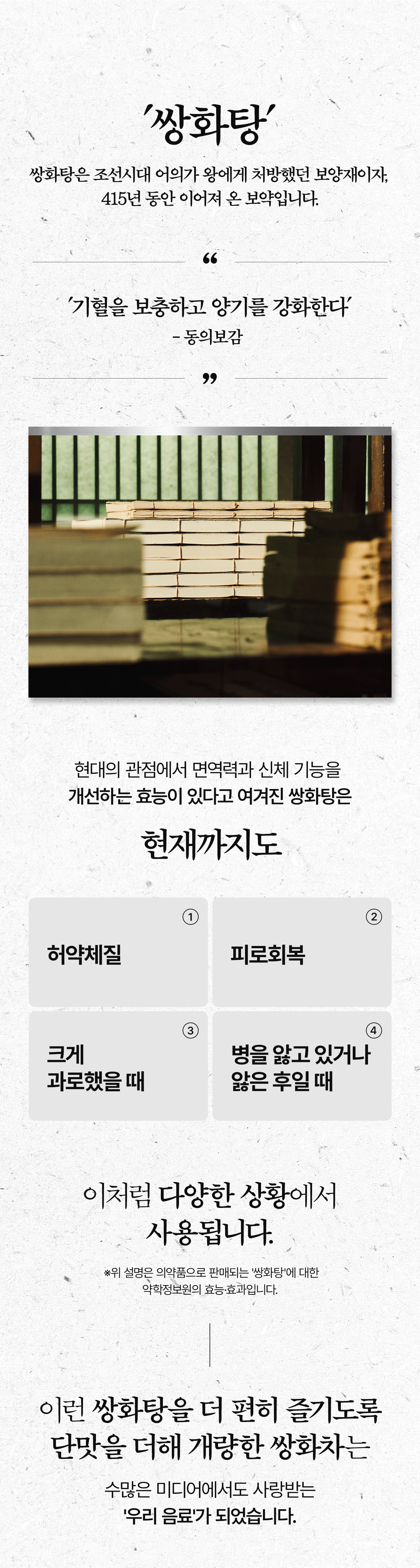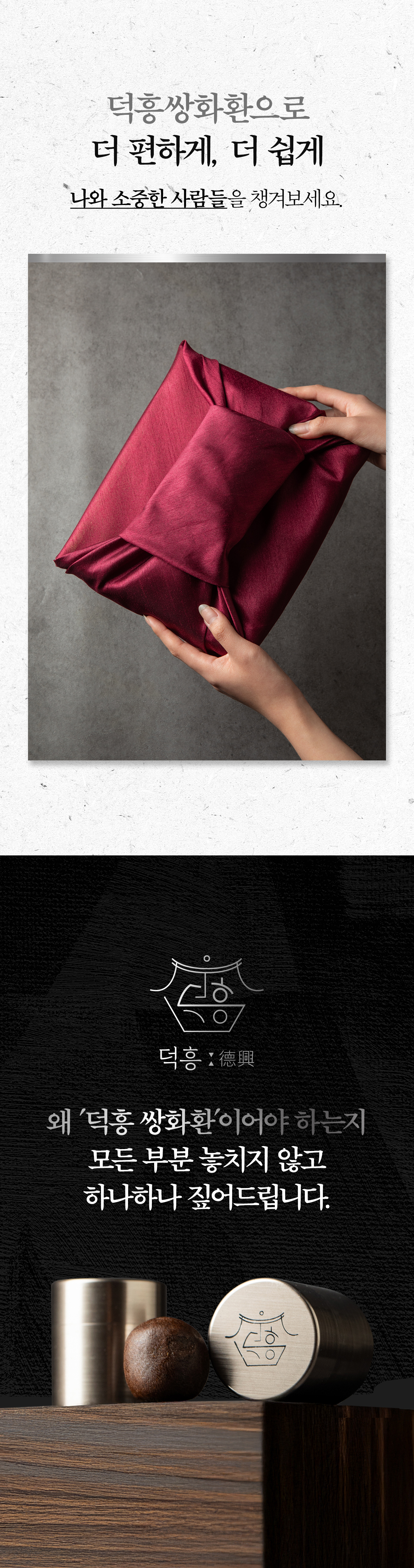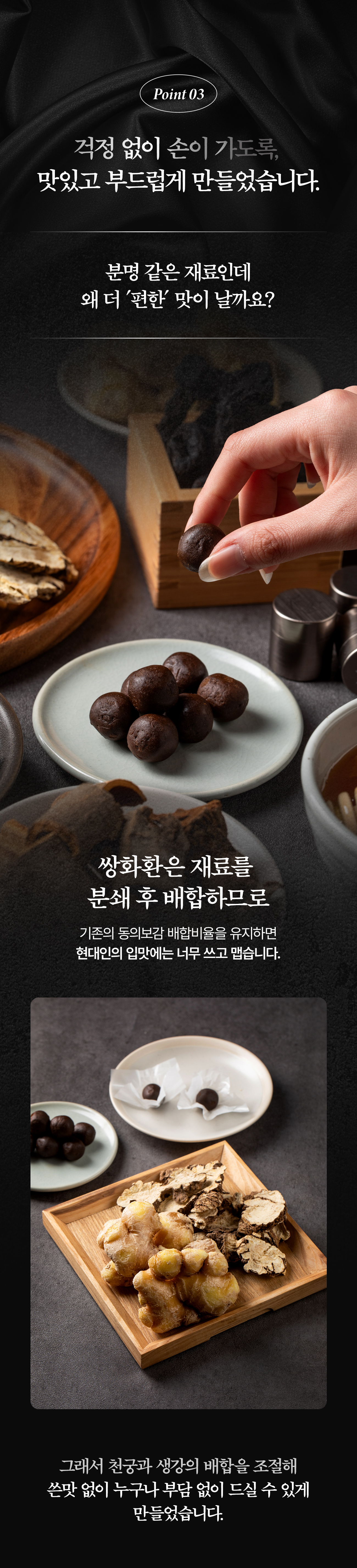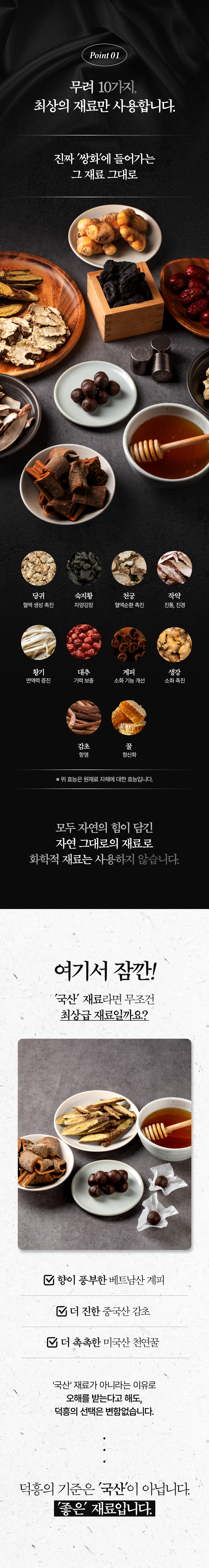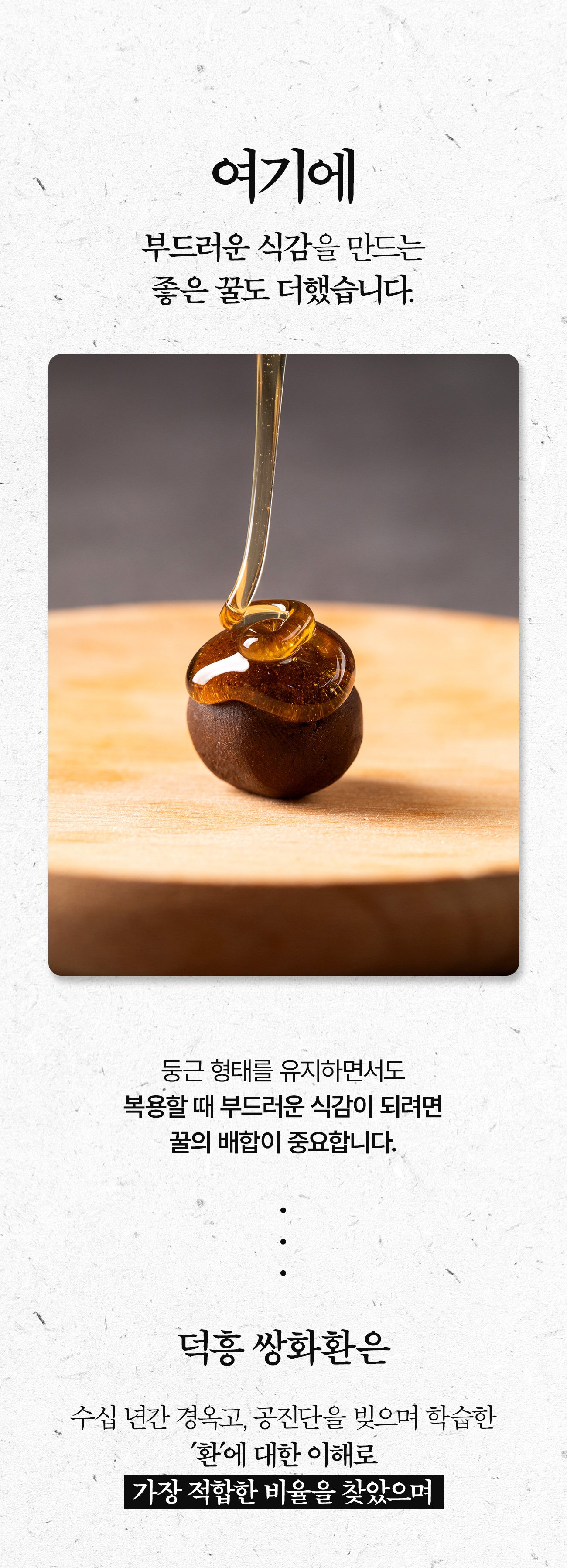 이번에 선보이는 덕흥보감 쌍화환은 바로 그 철학의 결과물입니다. 눈을 속이는 색소나 입을 즐겁게 하는 인공적인 단맛 대신, 오직 땅의 기운을 그대로 품은 원재료의 힘을 담았습니다. 기계로 똑같이 찍어내는 대신, 한 알 한 알에 저희의 마음과 정성을 담았습니다.