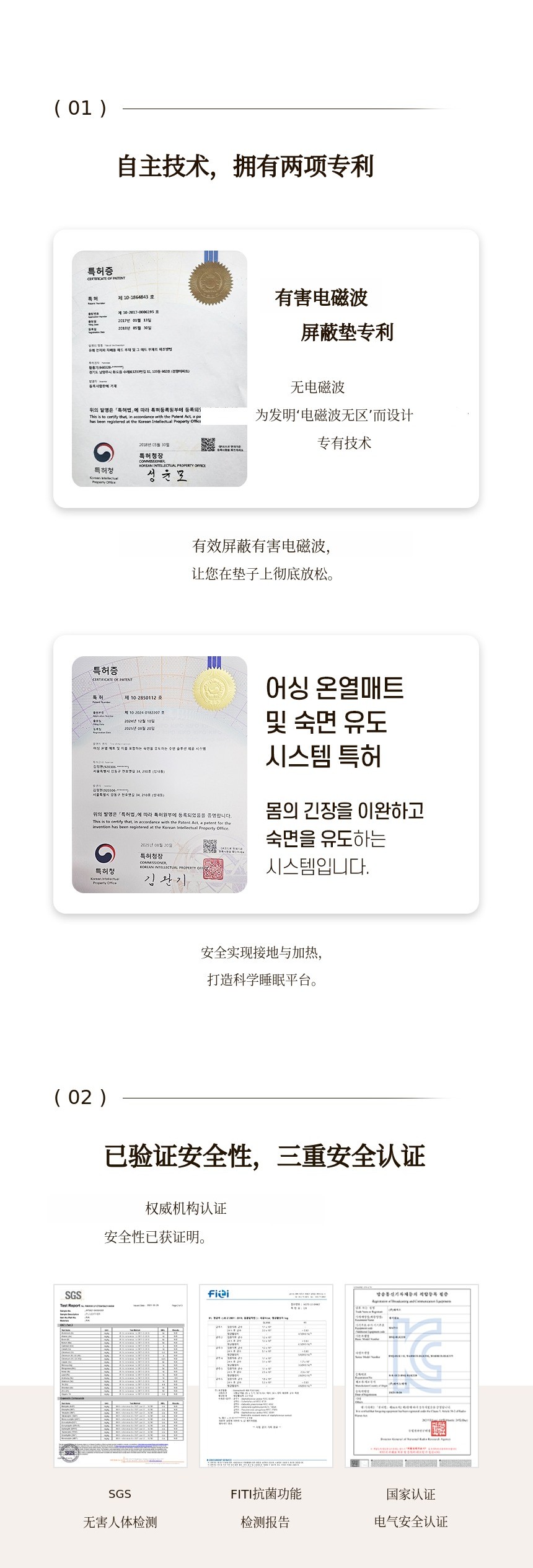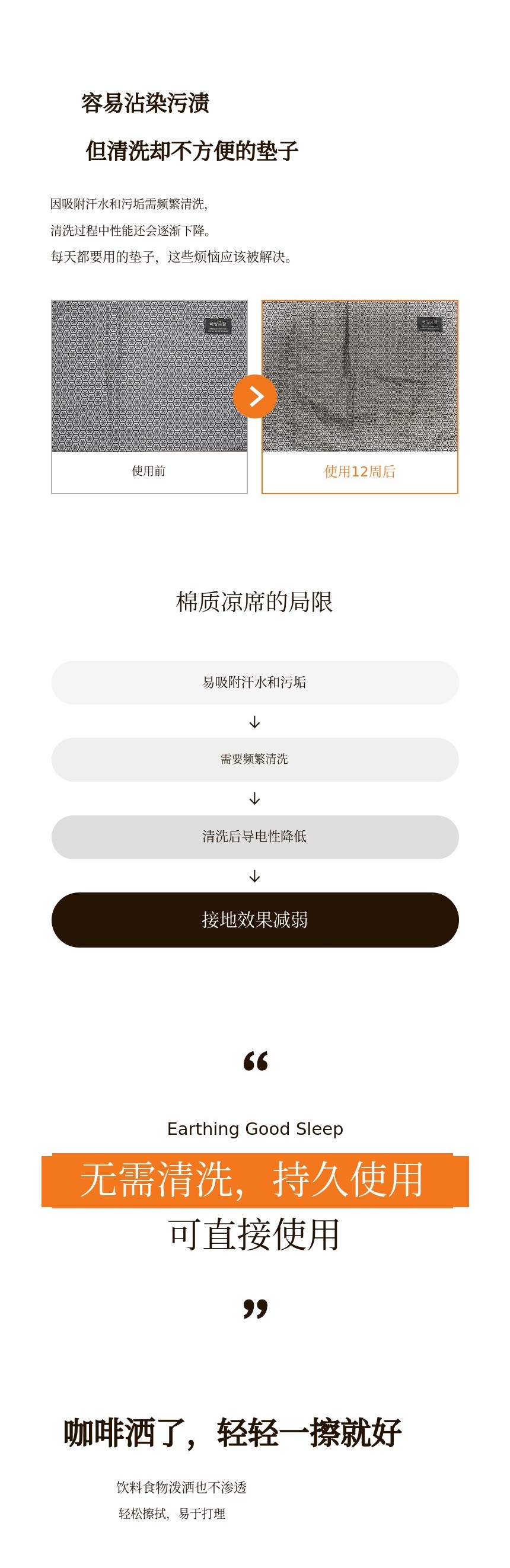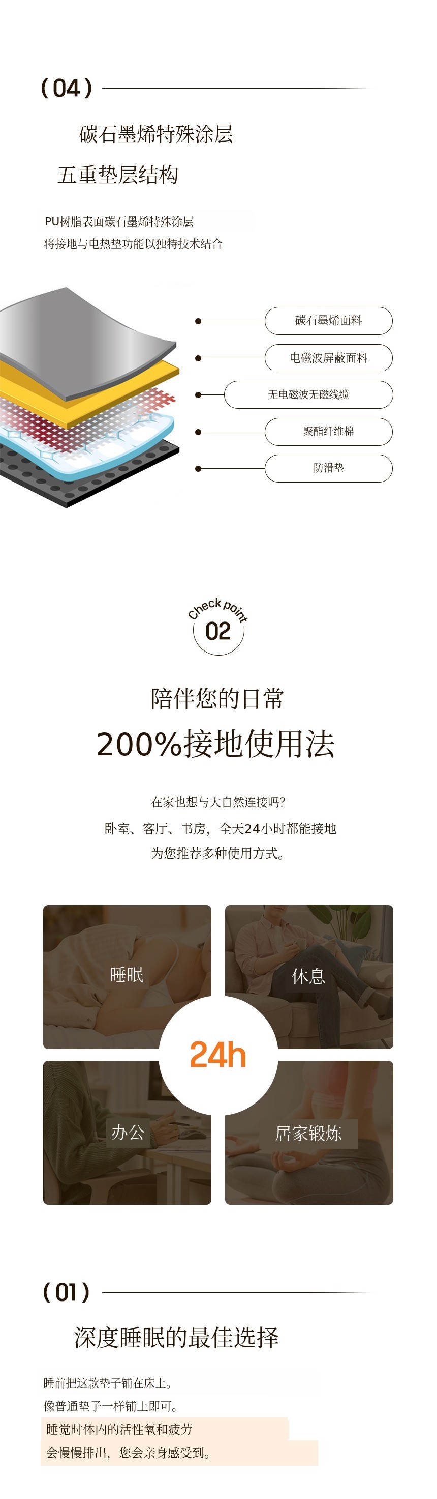 Earthing Good Sleep 的第一款产品采用了在棉质材料上印刷碳纳米管的方式。但由于汗水和污垢,需要频繁清洗,在此过程中接地导电性下降,导致消费者对产品效果的满意度降低。因此我们专注于材料创新。既能带来良好皮肤触感,又能在无需清洗的情况下稳定保持接地导电性 的材料被开发出来。我们并未止步于此,还结合了无电磁波担忧的加热功能,提供更加便捷和持续的接地效果,新一代睡眠解决方案 由此诞生。