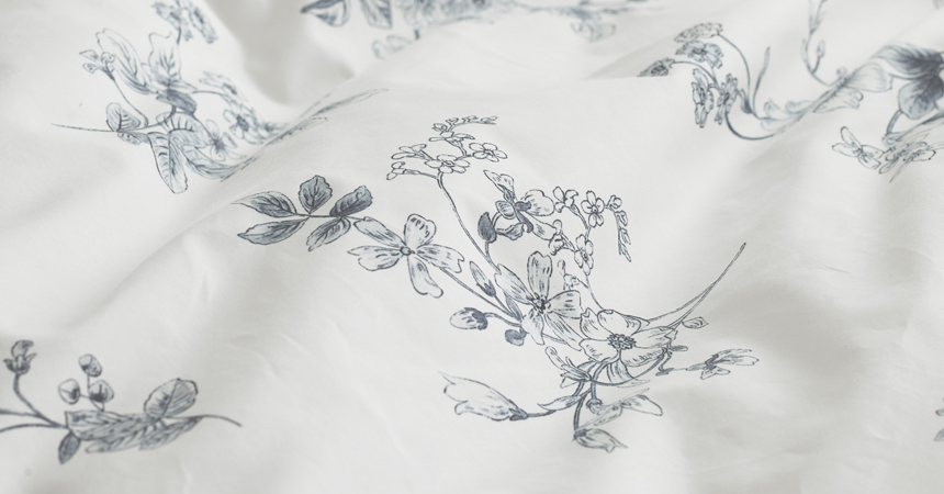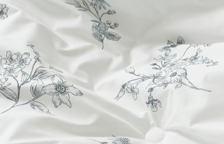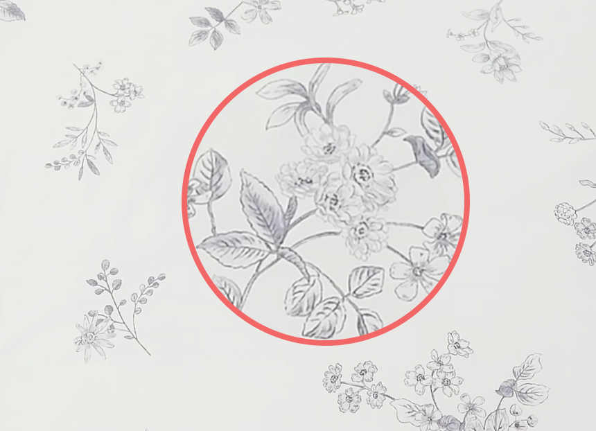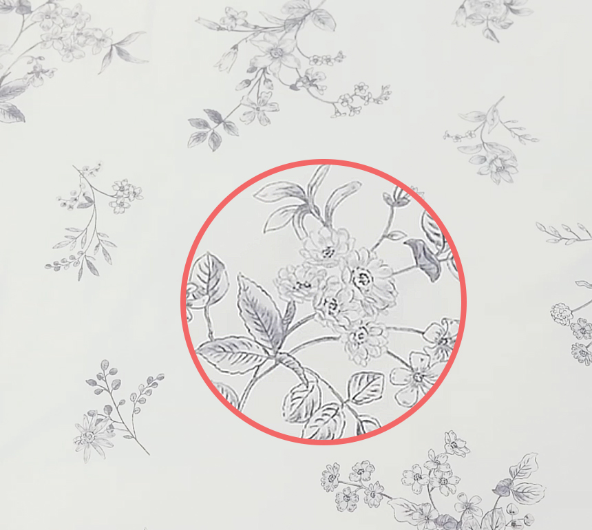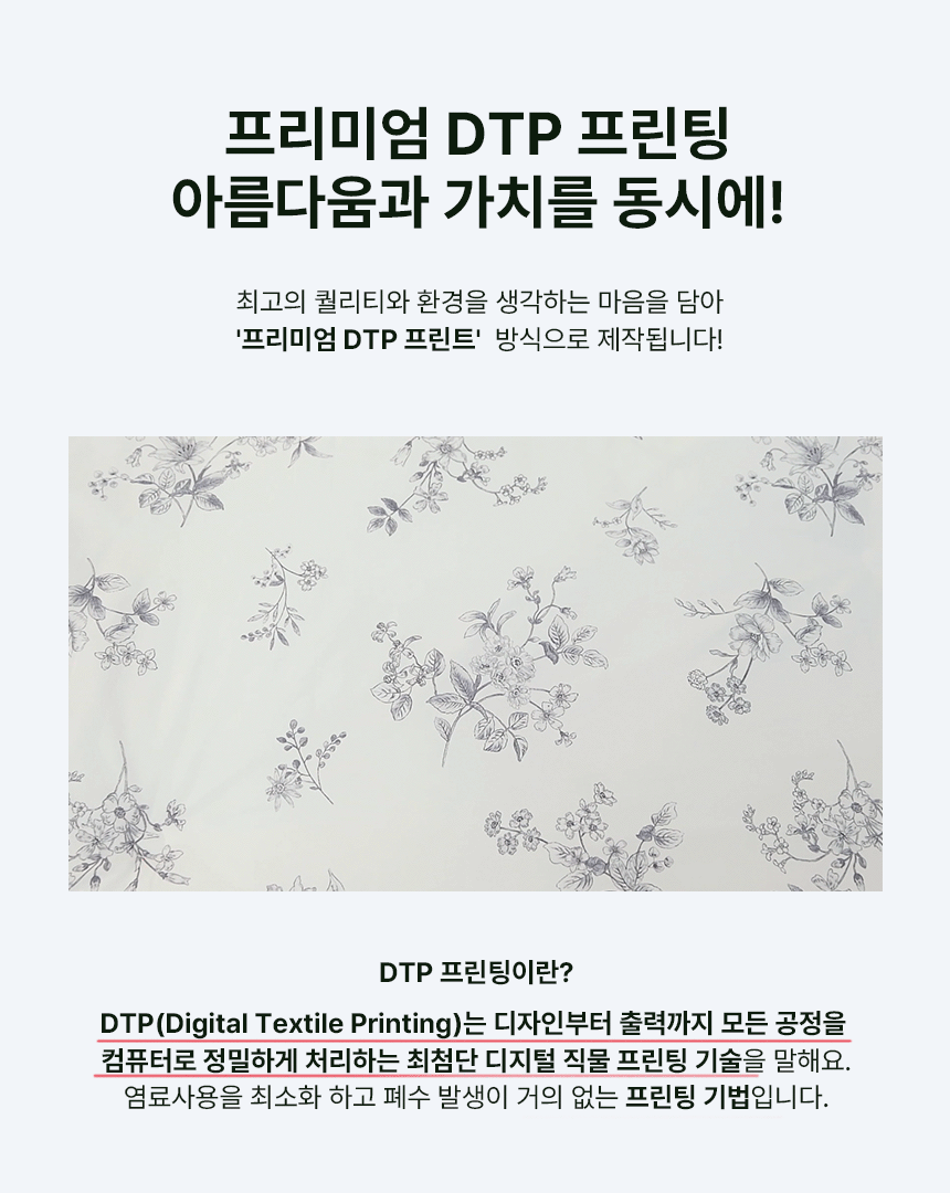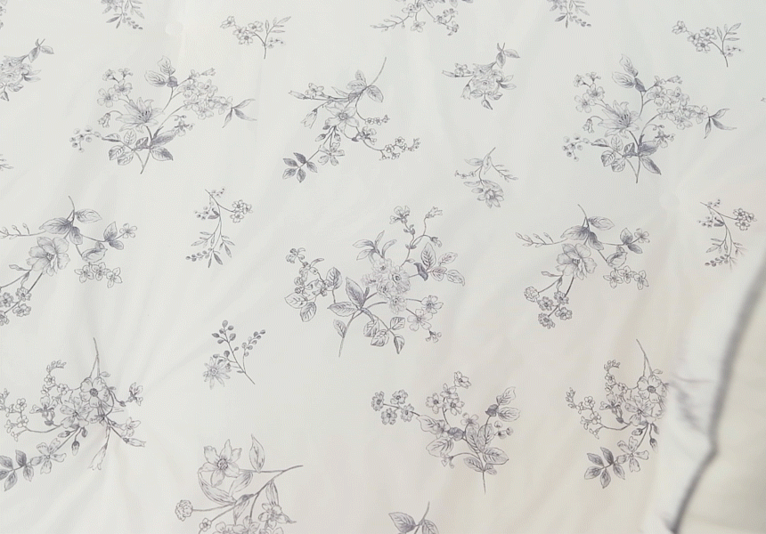 일반 나염 프린트는 150cm 폭 제한으로 이음선이 생기지만, 나이스필은 프리미엄 DTP프린트 공법으로 연폭선 없는 광폭 베딩을 완성했습니다.