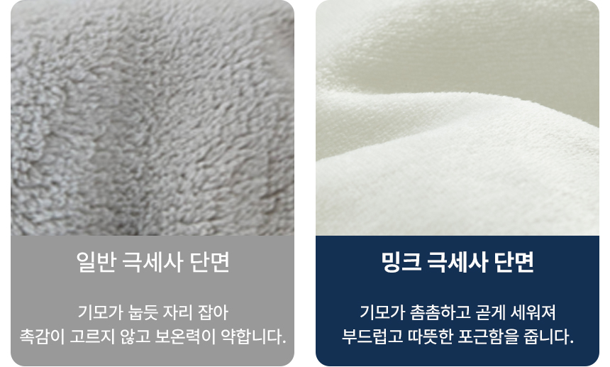 밍크 극세사 단면을 보면 기모가 촘촘하게 세워져 있어, 피부에 닿을 때 한층 더 부드럽고 따뜻한 포근함을 느낄 수 있습니다.