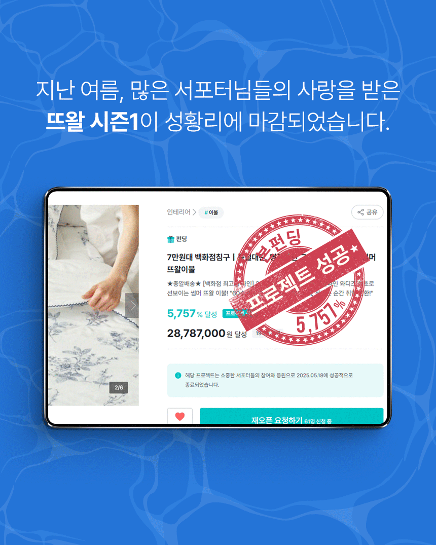 와디즈는 창의적인 아이디어와 제품을 세상에 소개하는 플랫폼으로, 나이스필의 30년 경험을 바탕으로 만든 프리미엄 침구를 와디즈 서포터들에게 먼저 선보이기 위해 참여하고 있습니다.