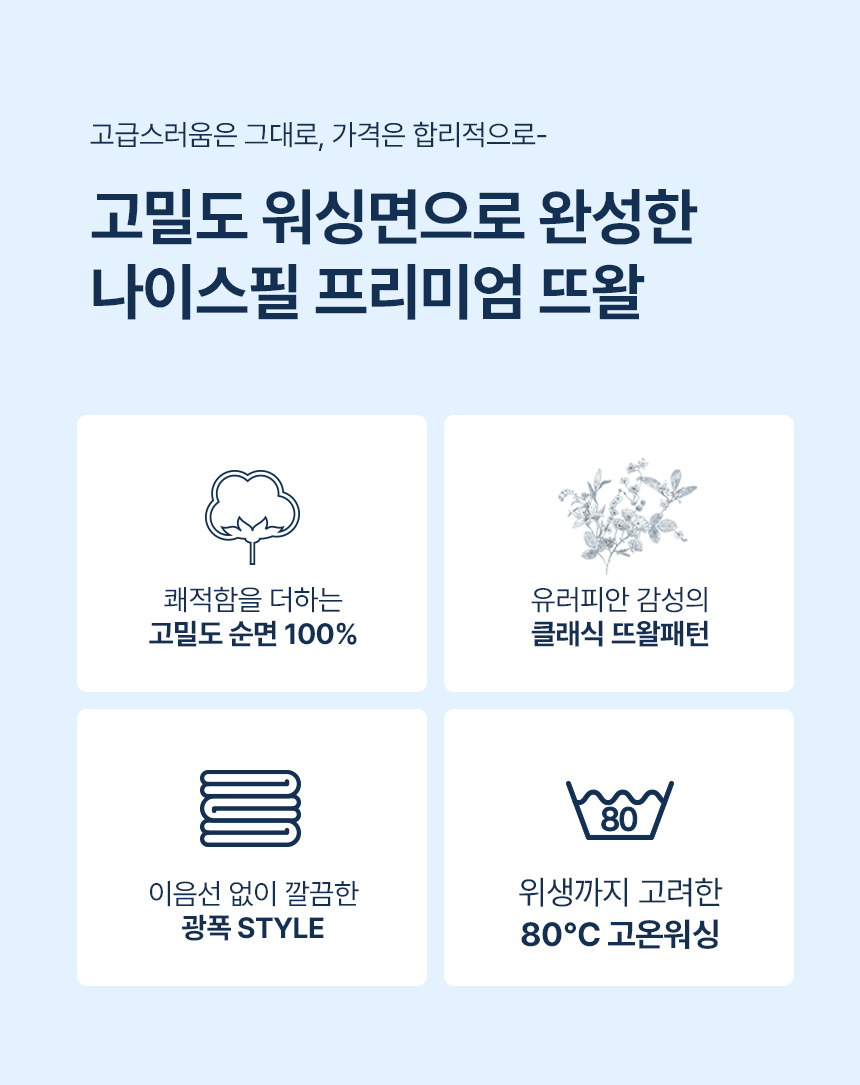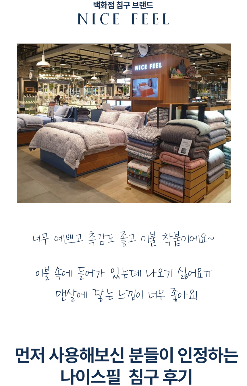 나이스필은 촘촘하고 쫀쫀하게 짜인 밍크 극세사 원단을 사용해, 피부에 닿는 순간 보들보들한 마이크로 기모 터치감을 선사하며 일반 극세사보다 한층 더 포근하고 따뜻한 겨울철 최적의 선택이 됩니다.
