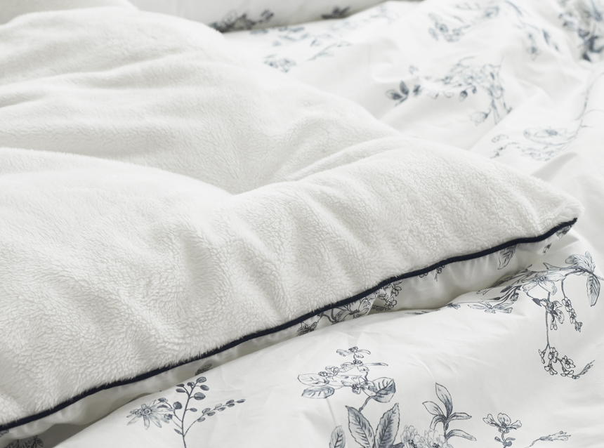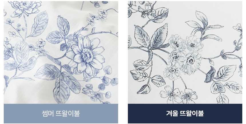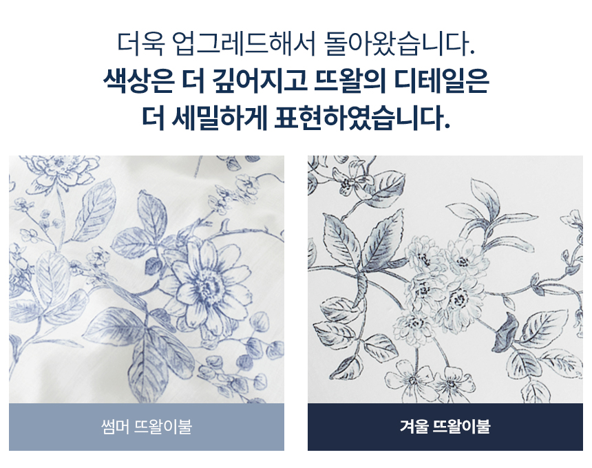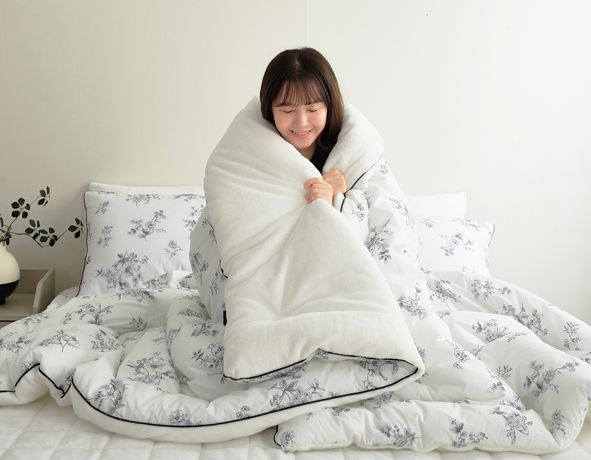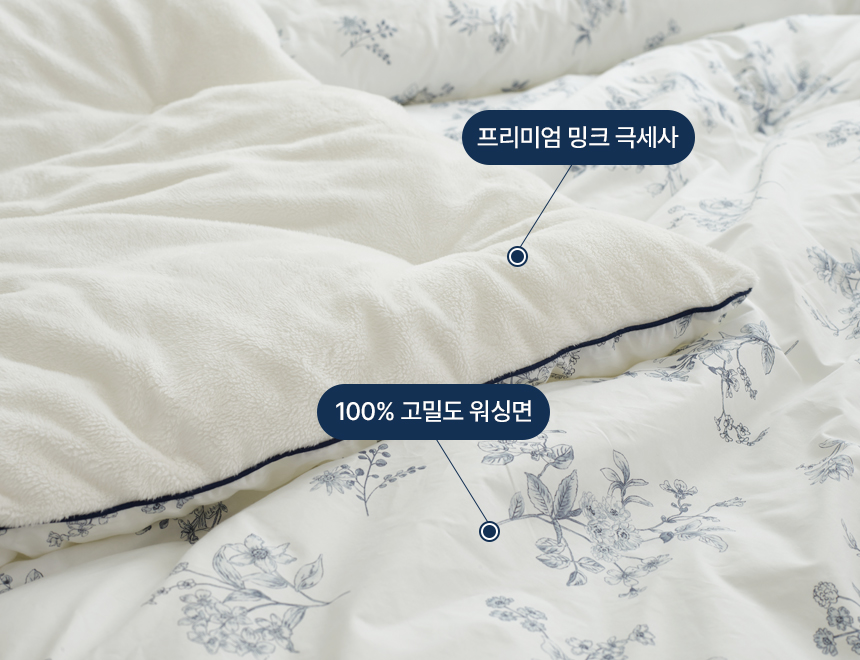 칙칙하거나 투박했던 색감의 겨울이불은 잊으세요. 앞면은 고밀도 60수 워싱면, 뒷면은 프리미엄 밍크 극세사의 명품급 뜨왈 패턴으로, 뒤집어서 다양한 침실 분위기 연출이 가능합니다.