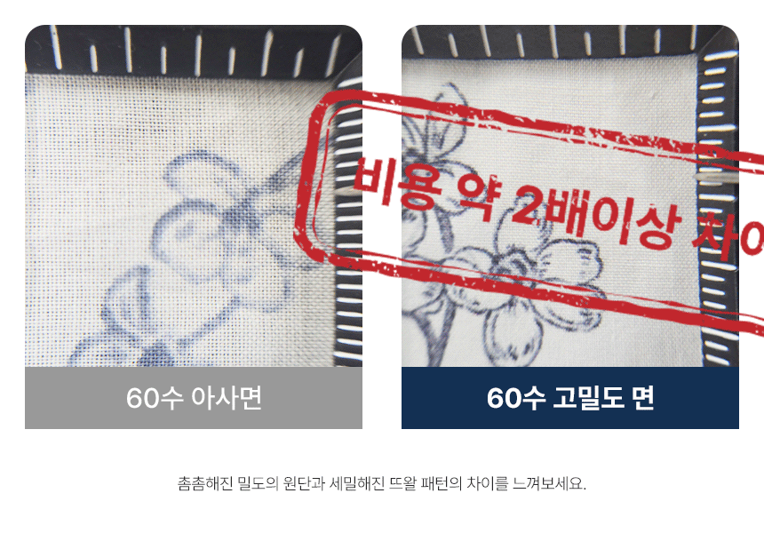 60수 고밀도 면(우) : 촘촘하고 매끄러워 내구성이 뛰어나며 오래 사용해도 형태 유지