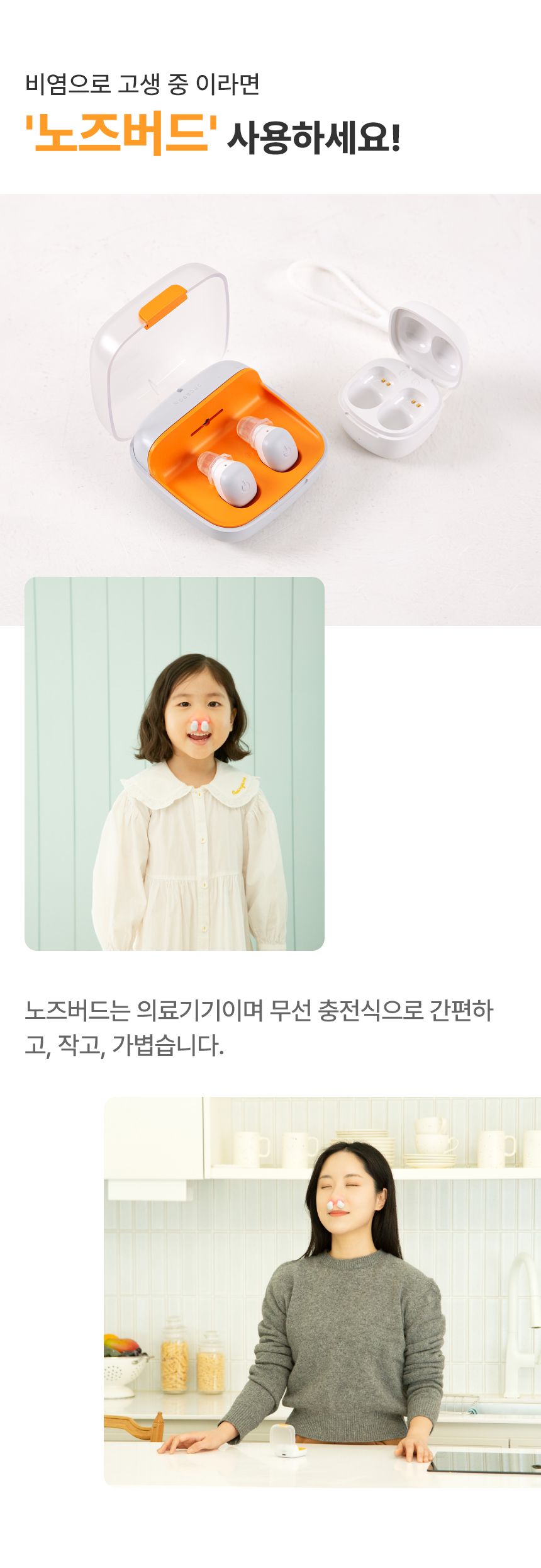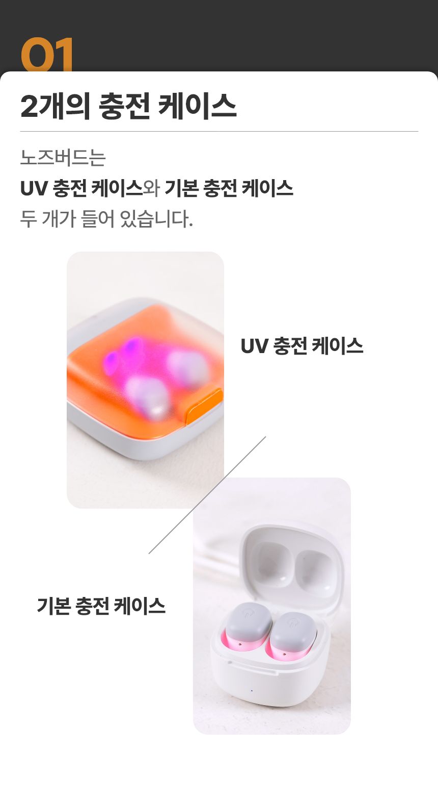 이번에 소개하는 노즈버드는 노즈굿과 동일한 구조로 광에미터 특허를 이용한 제품입니다. 사용 후 실리콘 소독에 도움을 주는 UV충전기를 추가하여 집에서는 UV충전기로, 외출할 때는 휴대용 충전기를 사용할 수 있게 편의성을 더욱 더 높였습니다.