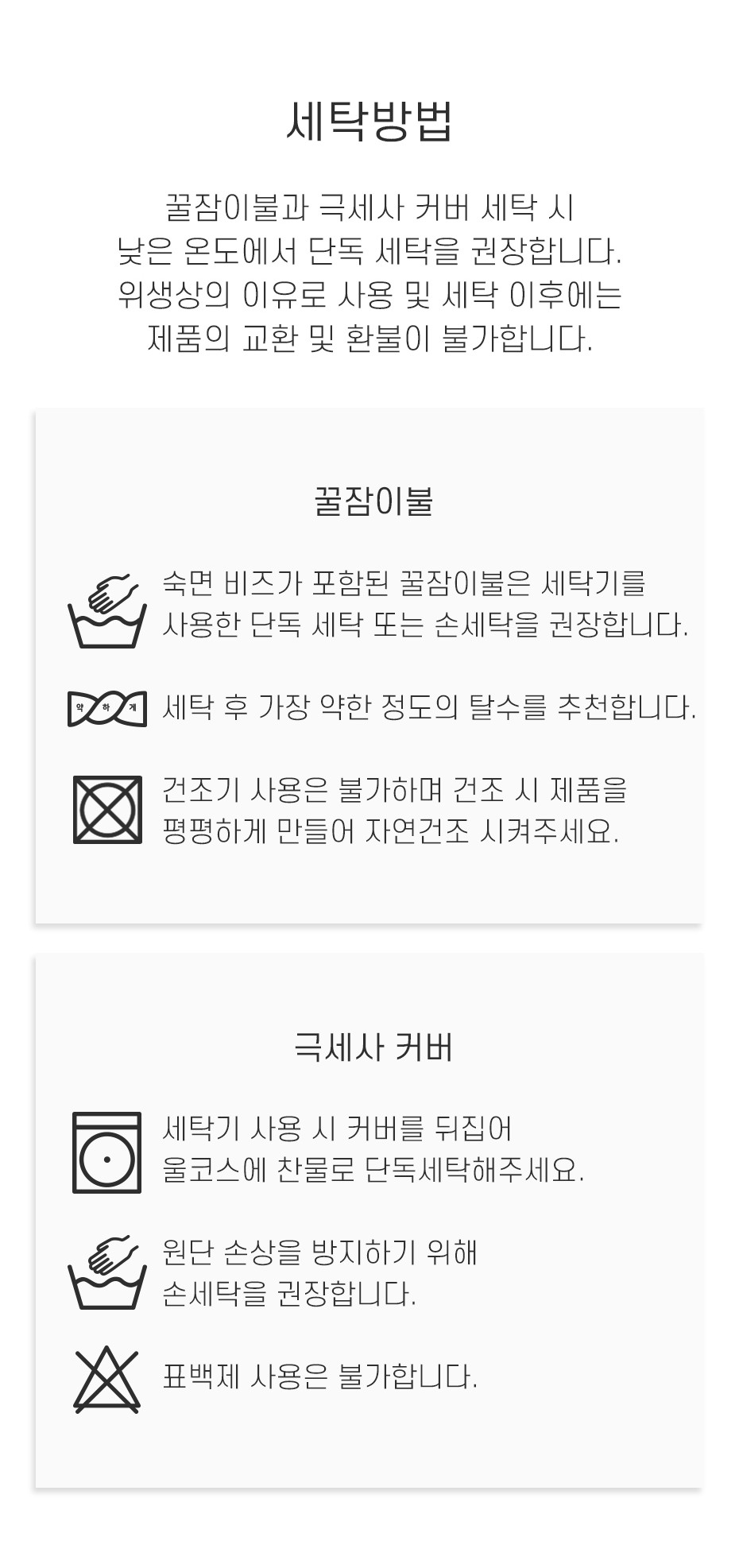 사용 및 세탁 후에 제품 하자로 인한 반환 신청은 불가합니다.