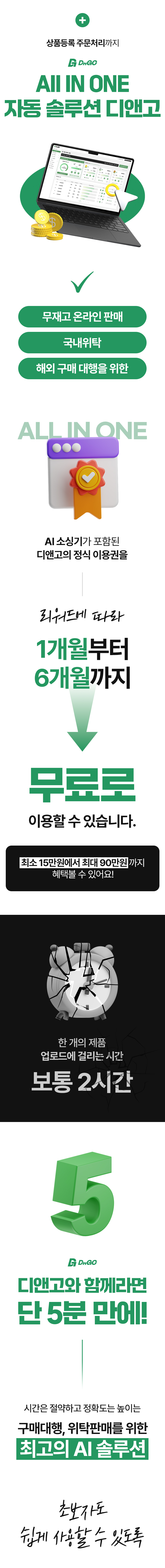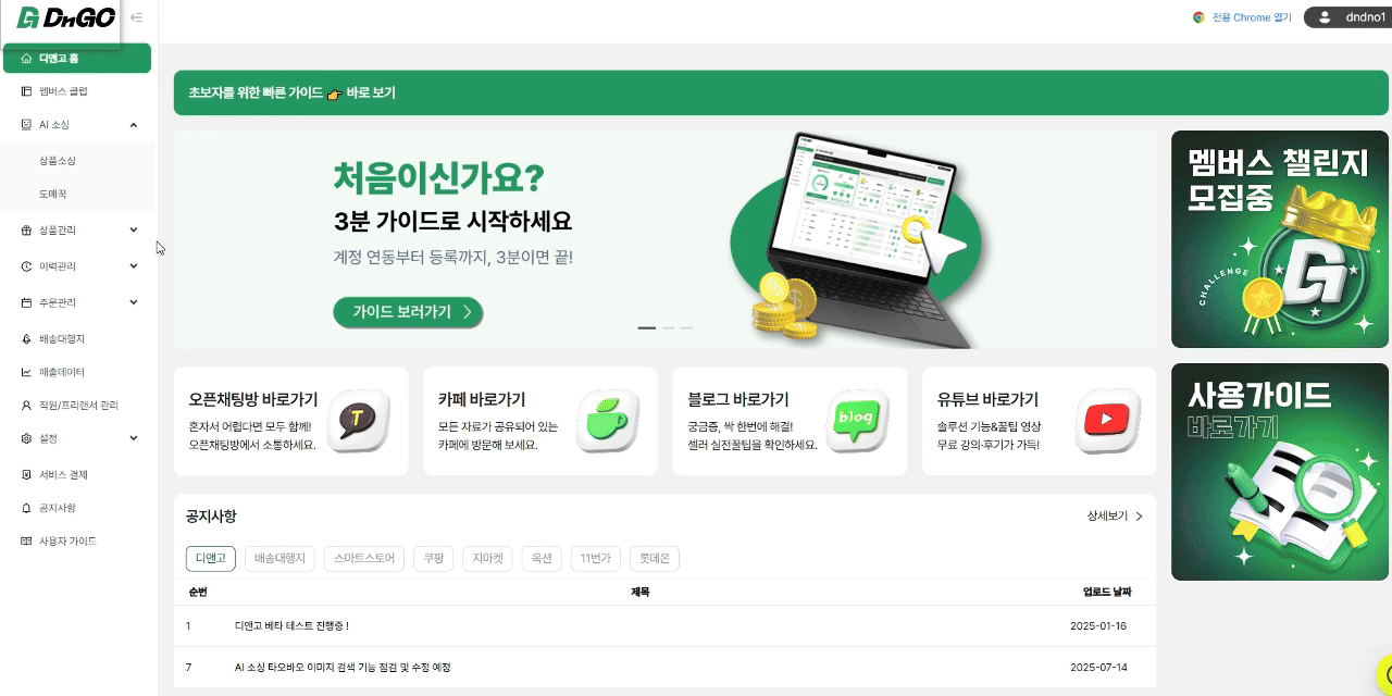소싱부터 상품 수집, AI 번역, 등록, 주문 관리, 마케팅까지 하나의 시스템으로 끝낼 수 있다는 점이 디앤고의 가장 큰 강점입니다.