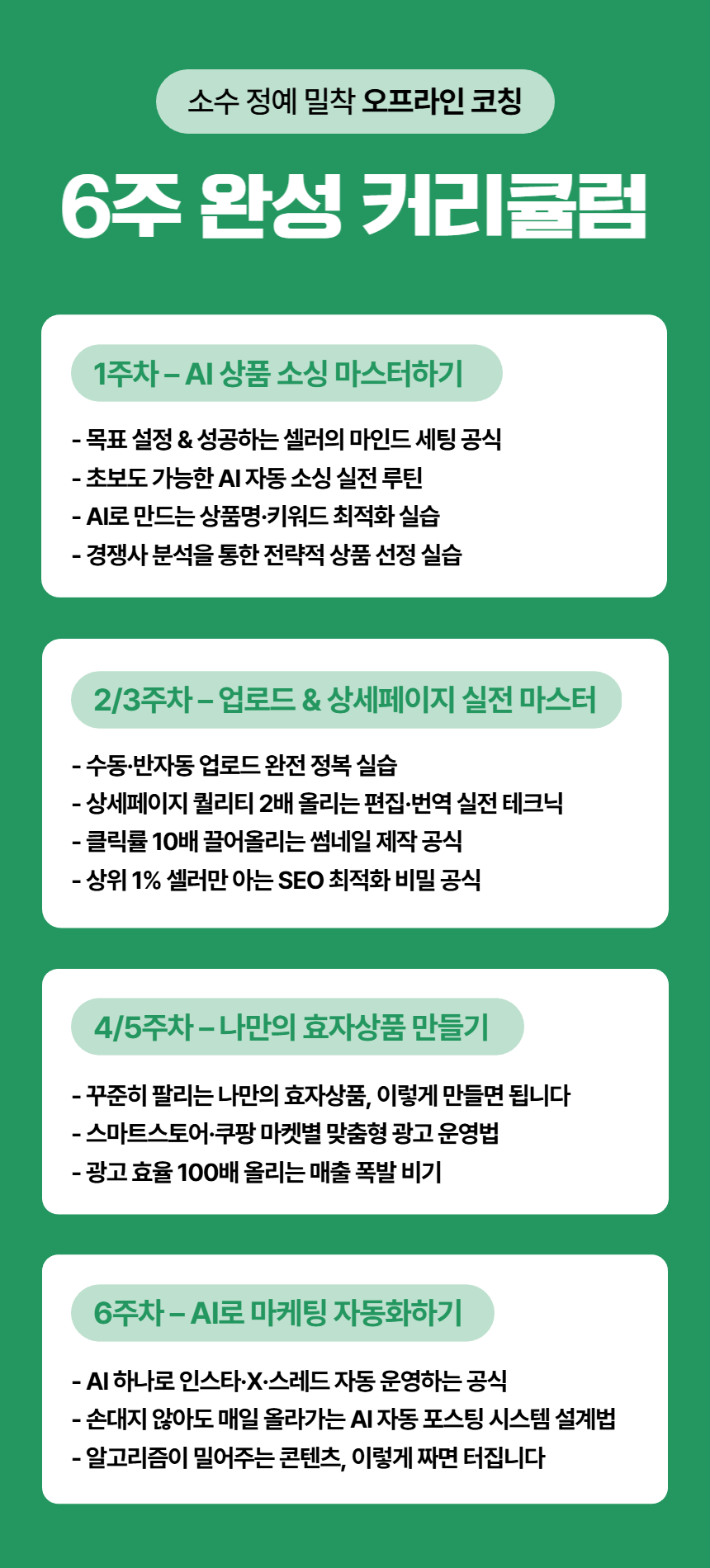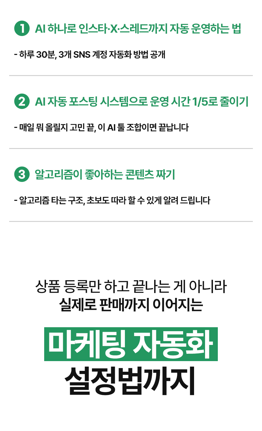 강의 → 실습 → 피드백의 과정을 통해 초보자도 1달 안에 '팔리는 시스템'을 만들 수 있도록 설계한 실전형 자동화 솔루션입니다.
