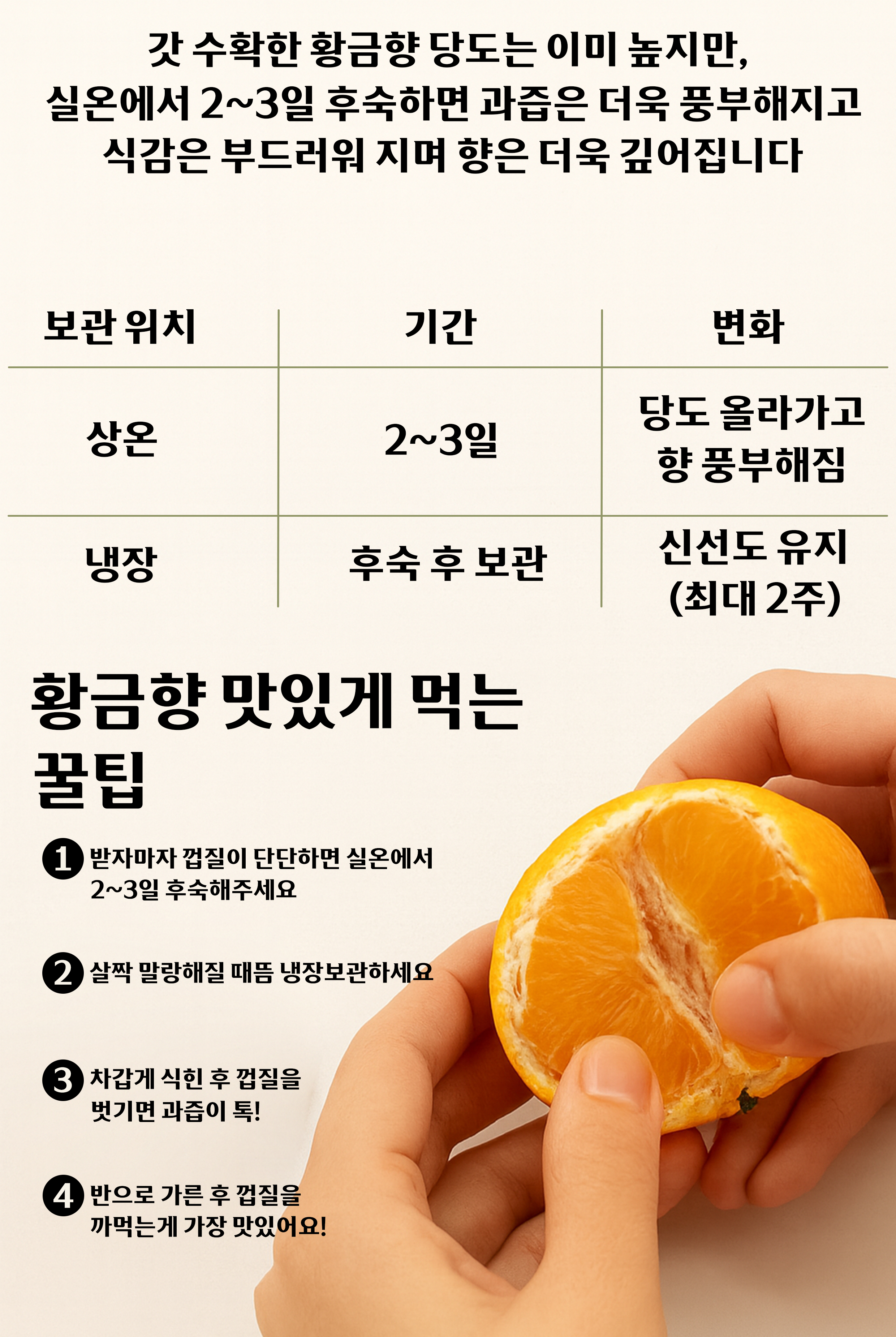 - 보관 방법 : 받으신 후 즉시 황금향의 상태를 확인하여 주세요. 냉장보관 시 최대 2주일을 넘기지 말아주세요