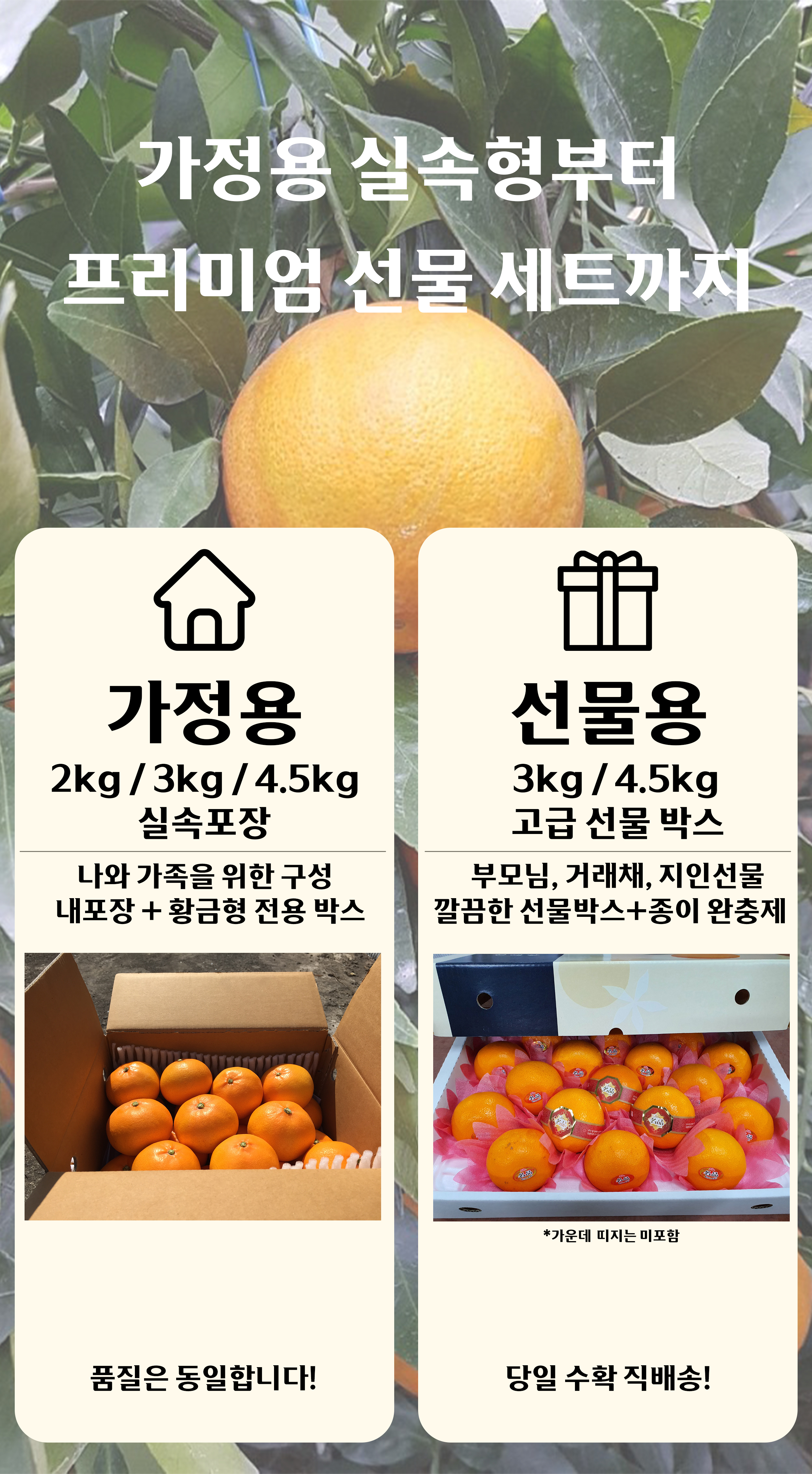 12~14브릭스 이상의 높은 당도와 은은한 감귤 향이 입안 가득 퍼집니다.