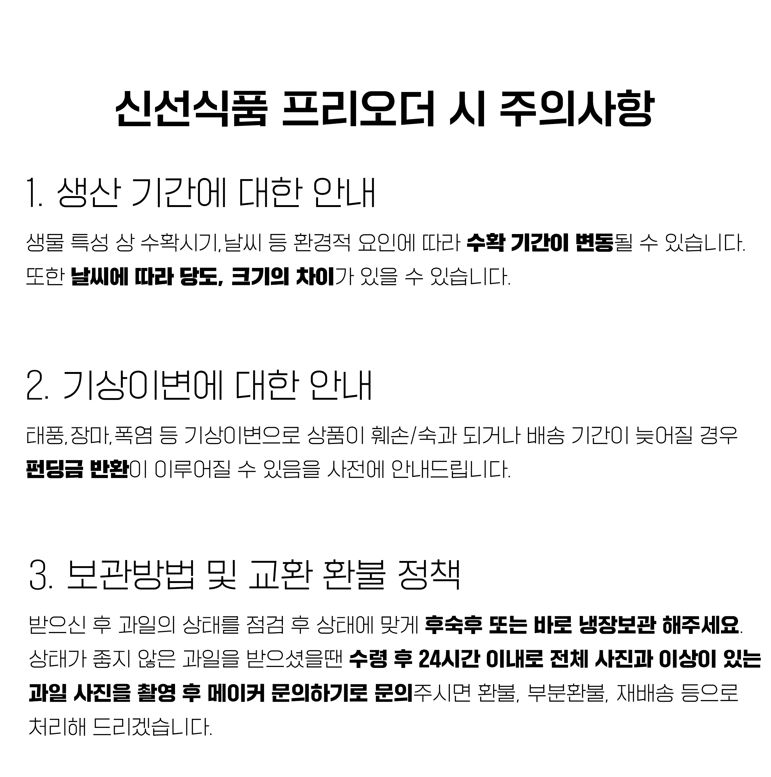 - 교환 및 환불 정책 : 파손이 된 황금향의 사진과 전체사진을 촬영 후 수령 24시간 이내로 메이커 문의하기로 문의주세요. 상태에 따라서 교환 및 환불, 부분환불로 도와드리겠습니다.