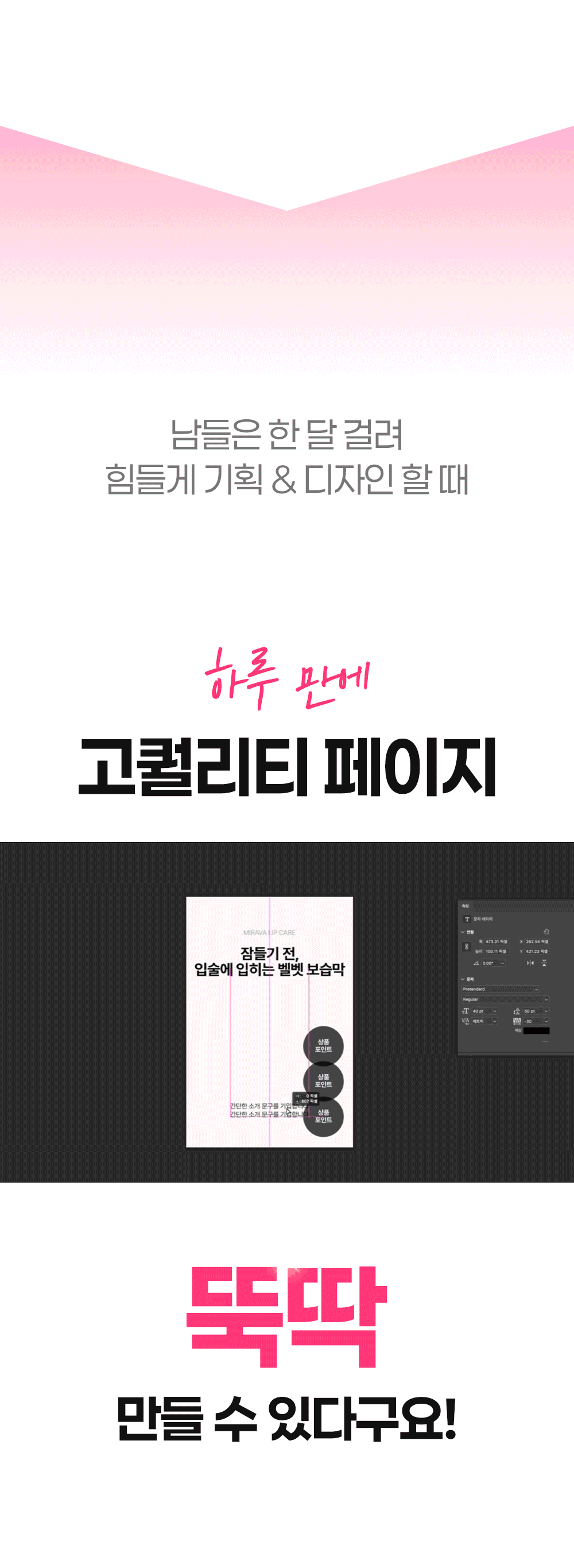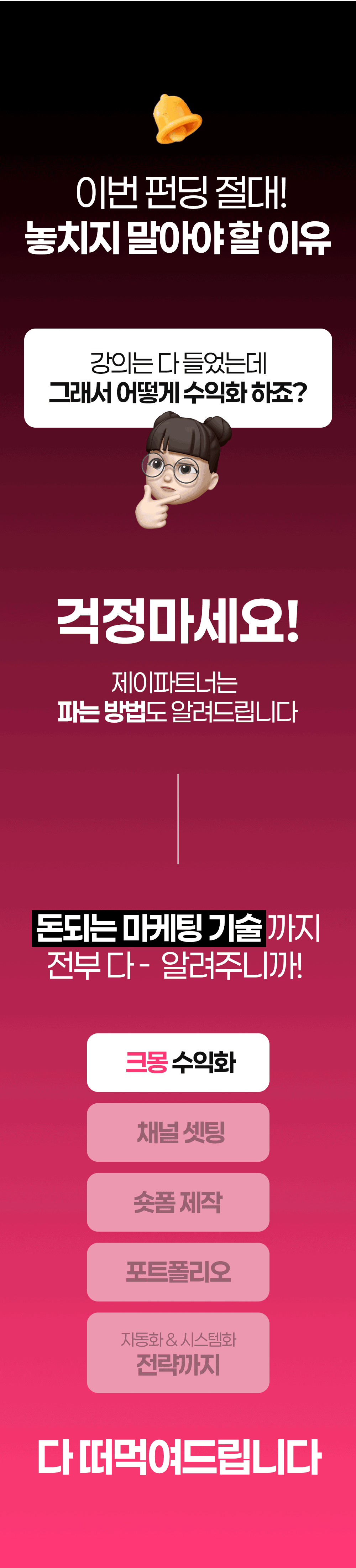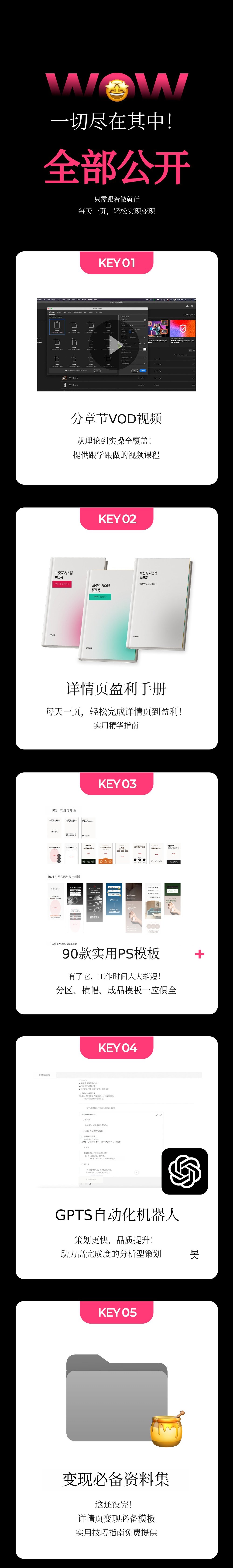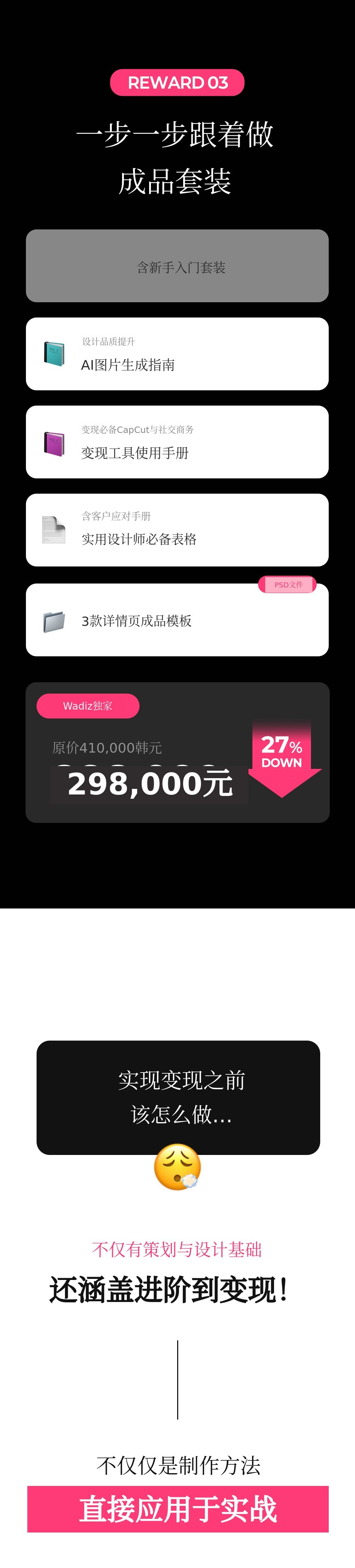 1. 📄 畅销详情页制作系统 - 凭借50亿销售额验证的桥接系统 2. 🚀 从策划到设计一站式教育 - 即使初学者也能轻松实现盈利的课程 3. 🎁 Wadiz独家折扣 - 仅在Wadiz平台提供25%折扣和限量套餐