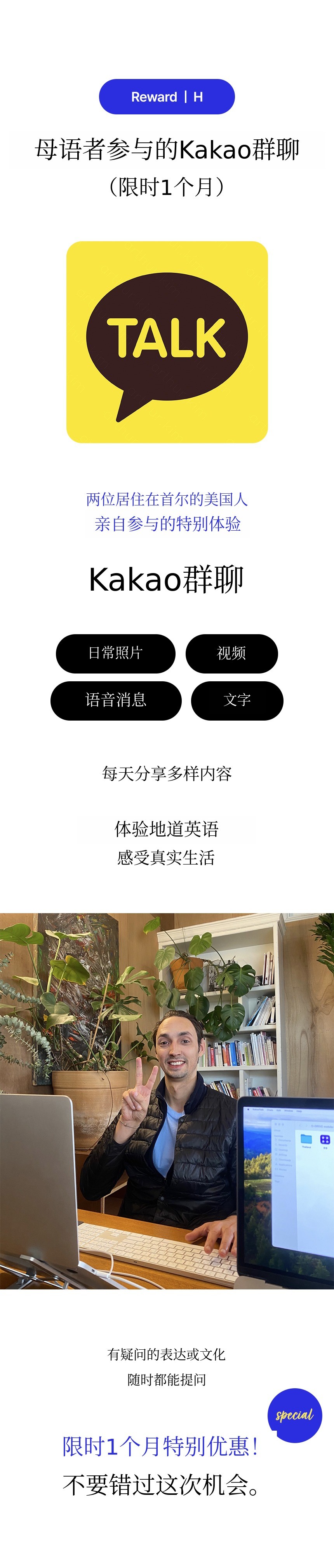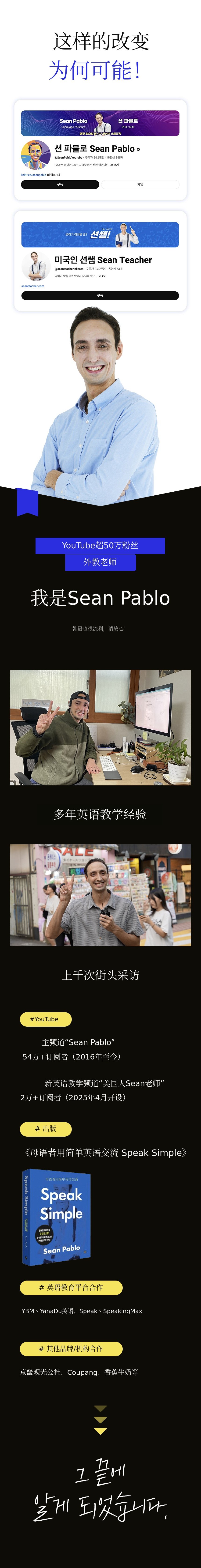 2014年来到韩国当英语老师。教了四年以上英语,进行了九千多次街头采访。在这个过程中,我发现了韩国人共同的烦恼。那就是‘虽然能看懂课本英语,但完全听不懂母语者的对话’。 原因在于R/L发音、缩略和连读、直译式“中式英语”习惯、听力与口语的差距,以及在母语者面前缺乏自信。如果不知道"I'm going to go"听起来像"I'm gonna go"的区别,无论记住多少单词,实际对话还是会错过。