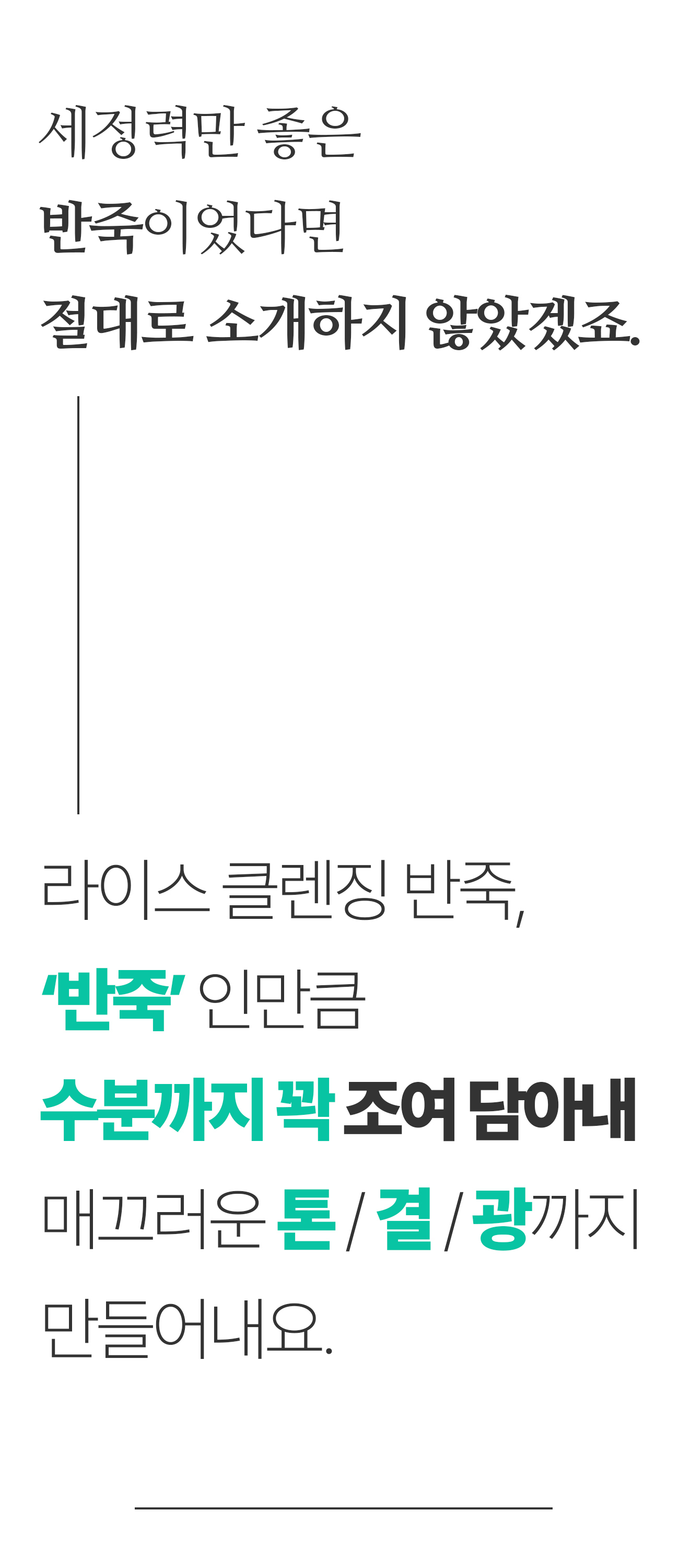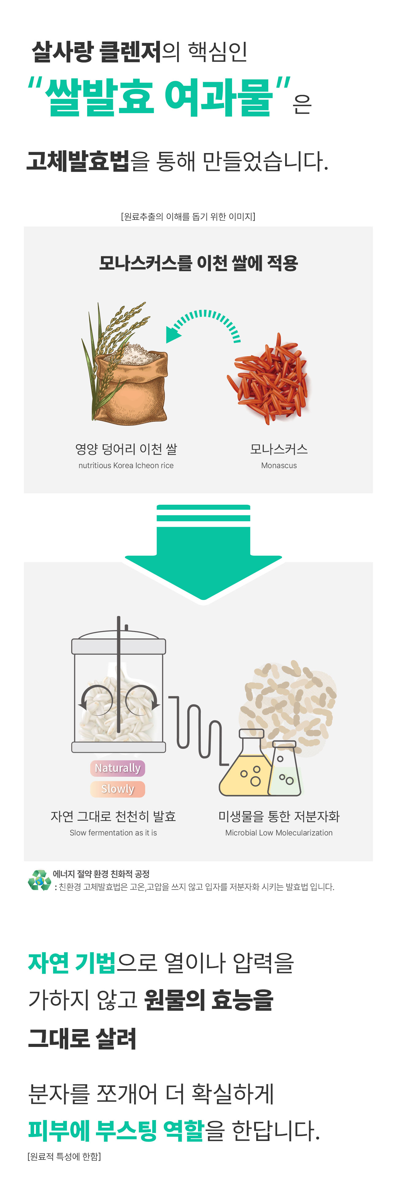 처음에는 왜 하필 쌀이냐, 성분이 저렴하다 등 주위에서 만류하기도 했으나 우리땅에서 자란 원물의 힘 그중에 이천쌀을 선택했고 그리고 쌀뜨물 세안 좋은거는 다 아니까 그 효능을 제품에 담아내고 싶었습니다.