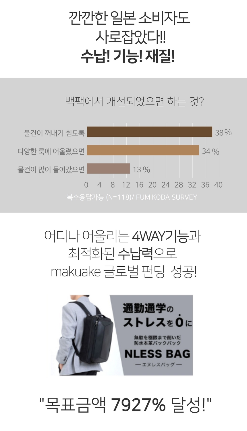 출퇴근시 접하게 되는 만원버스와 좁은 지하철 좌석에서 "어떻게 하면 조금 더 편리하게 수납할 수 있는지?" 매일 매일 만나는 출퇴근러의 불편은 무엇인지 고민하며 디자인하다보니 제품은 더 슬림해지고 수납방식은 달라지게 됩니다.