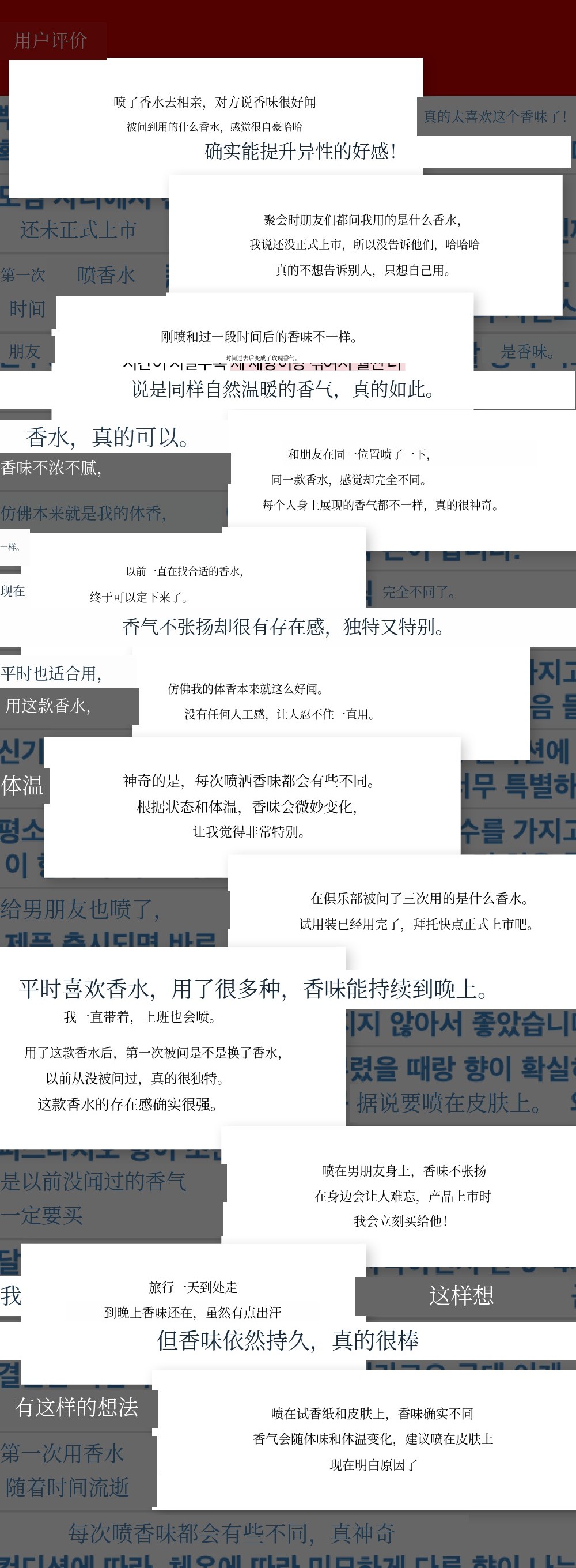 渗透体温与体香的细腻构成: 香气能够自然融入你的 独特体温和体味中,为了实现这一点,对前调、中调、基调各香调的配比 进行了数十次重新调整的测试。通过这份细致的努力,香气能够不过分也不令人负担地 在皮肤上定香并散发香气。