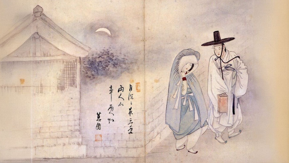 '月下情人(月下情人)'是朝鲜后期画家惠园申润福的代表作,描绘了明亮月夜里男女恋人秘密低语爱的场景。