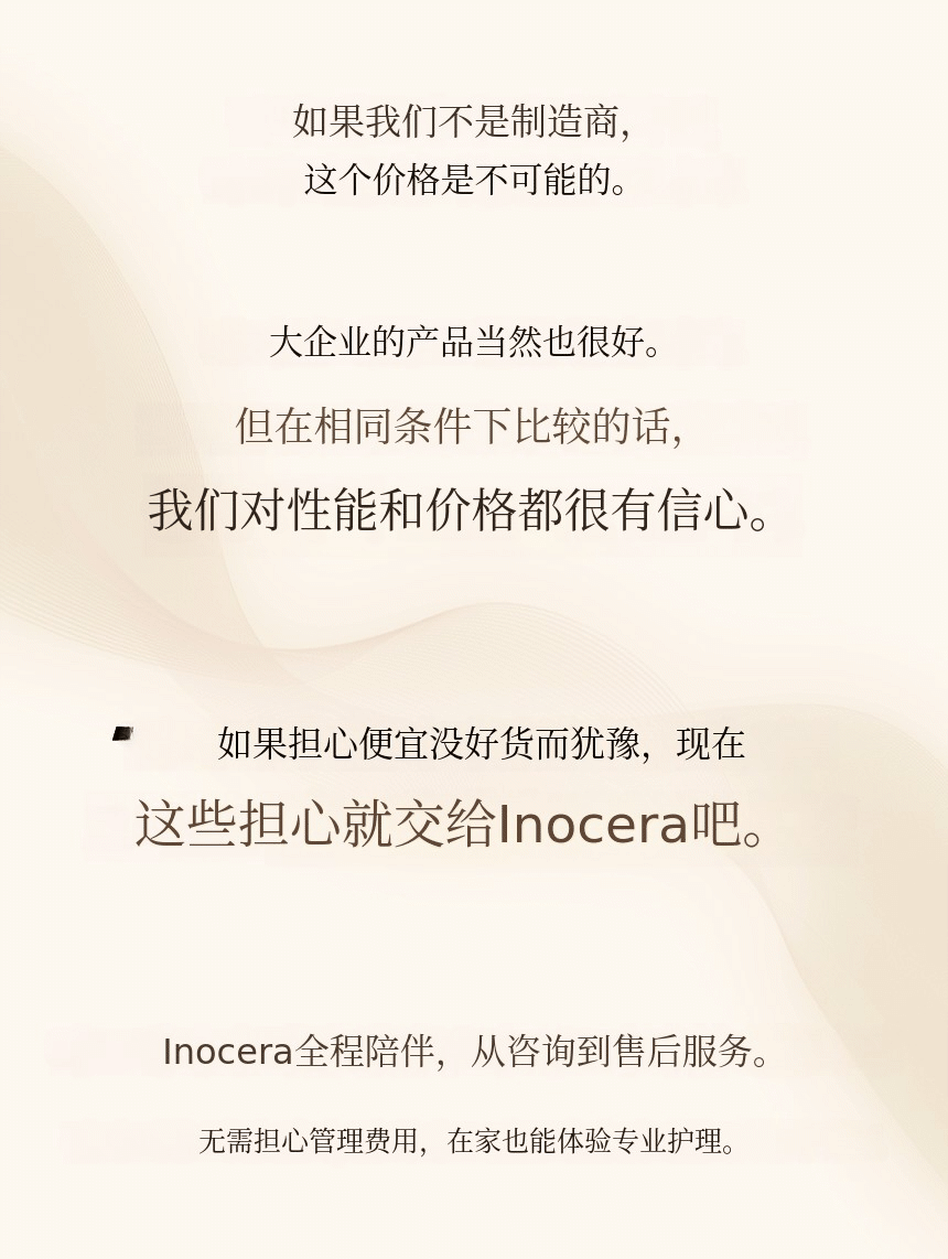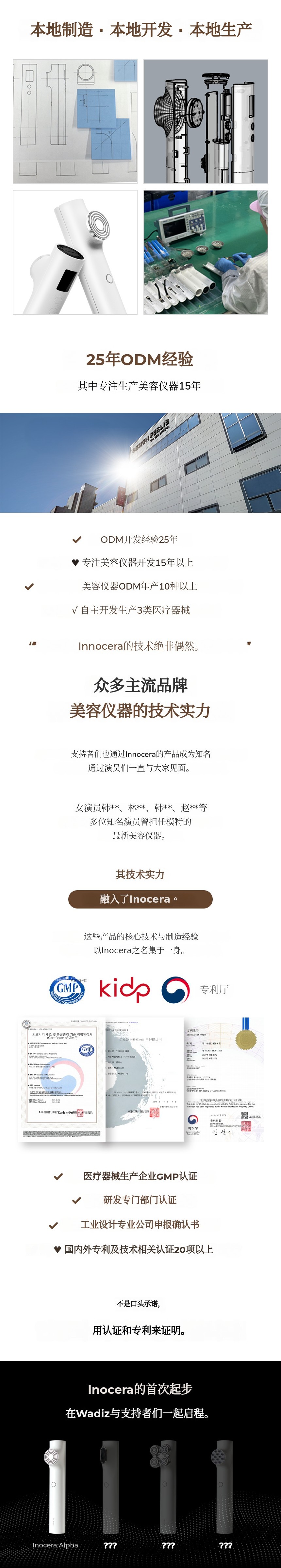 **INNOCERA(伊诺塞拉)**是一家拥有25年医疗器械及美容仪器自主研发和制造经验的专业制造企业。与短时间内诞生的品牌不同,我们凭借长期积累的技术实力和制造经验,具备了差异化的竞争力。一直以来,我们为众多知名美容品牌制造和供应产品,技术实力得到了验证,并将这些经验和技术汇聚,推出了自有品牌**伊诺塞拉(INNOCERA)**。