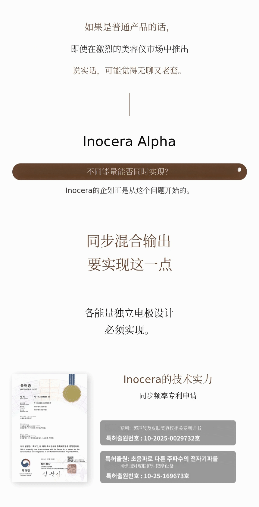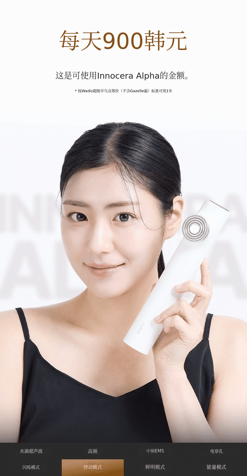 通过Wadiz首次亮相的伊诺塞拉Alpha,是一款应用了前所未有的“同步混合输出”技术的创新美容仪器。将水滴超声波、高频、中频、EP、IR LED等在皮肤科和美容院常见的核心功能集于一体,无需分别护理,可同时进行多项护理。为忙碌的现代人节省美容仪器使用时间,同时最大化效果。