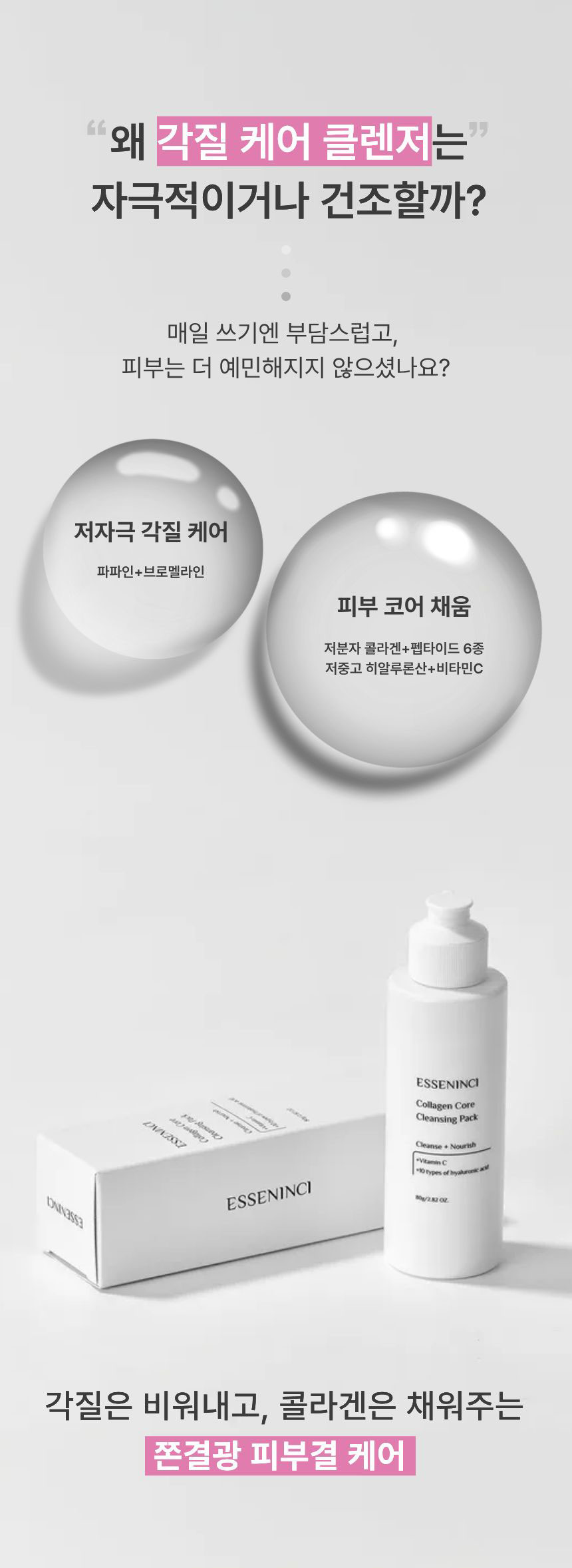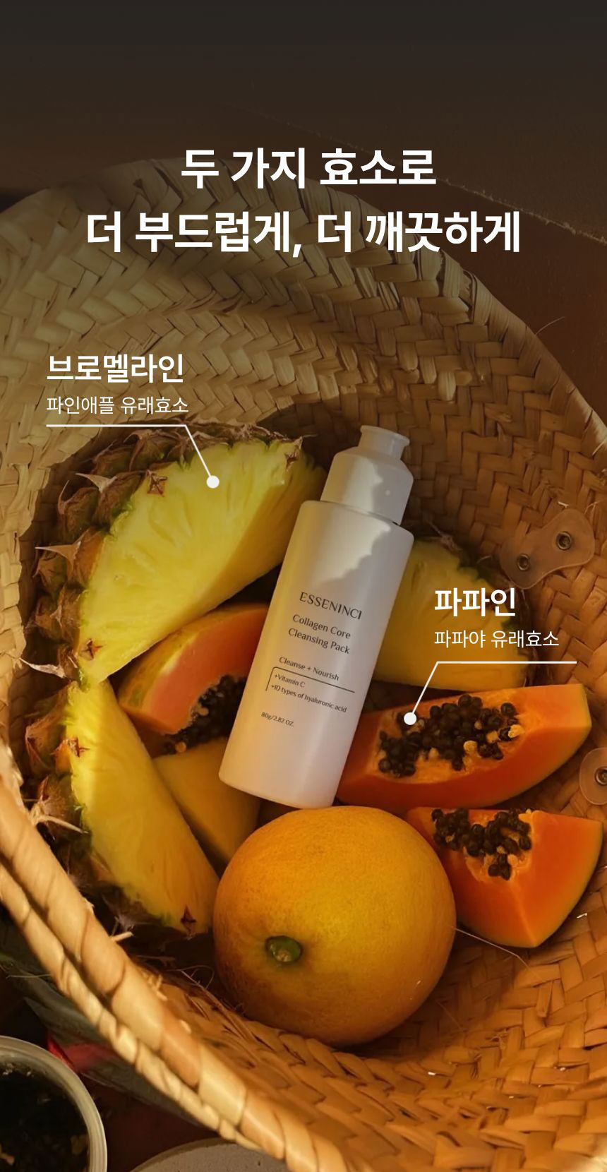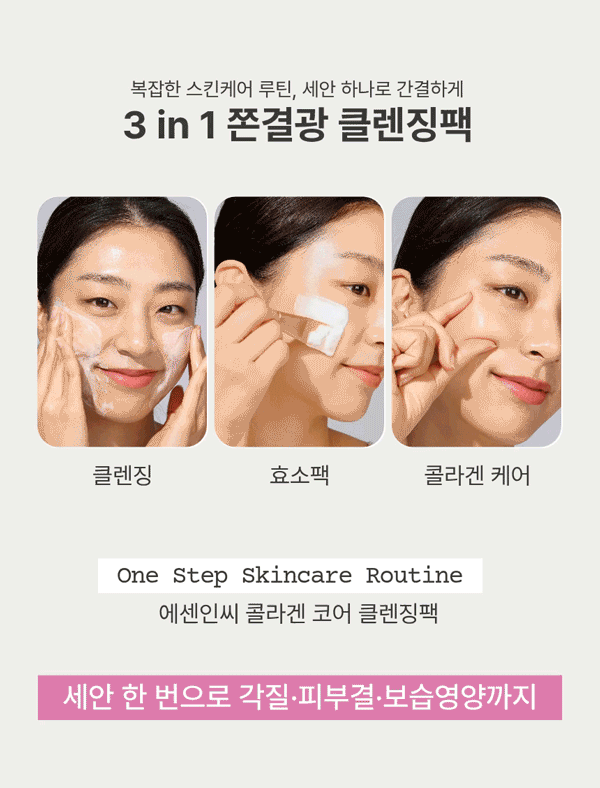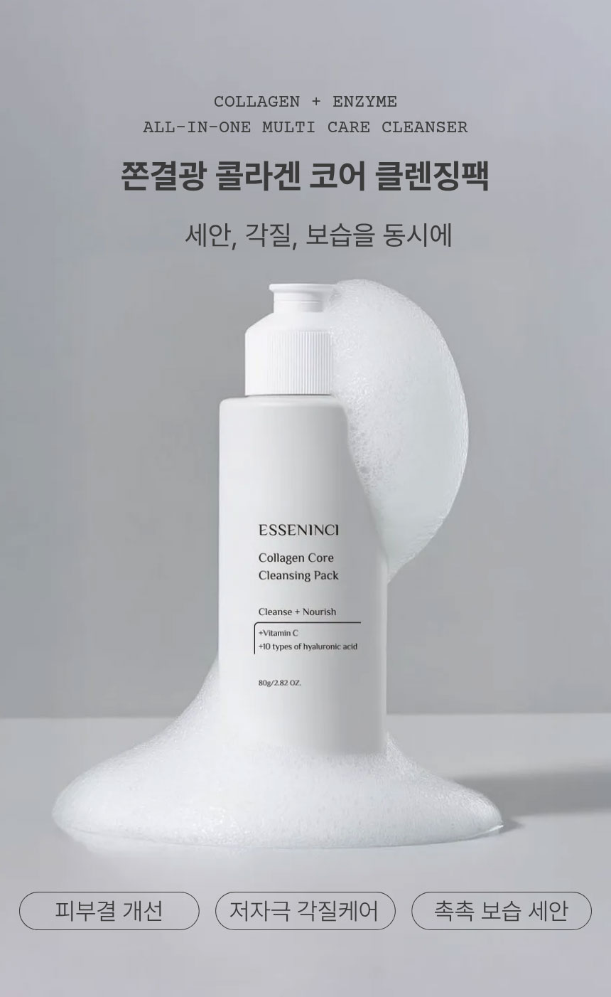 A. 평소에는 일반 클렌징 폼처럼 간편하게 사용하시면 됩니다. 조금 더 피부 케어가 필요할 때는 피부 관리샵에서 받는 효소팩처럼 활용하실 수 있습니다.보통 피부 관리샵에서 사용하는 효소 세안제는 각질 개선에만 초점이 맞춰져 있는데요,에센인씨 클렌징팩은 콜라겐, 펩타이드, 히알루론산, 비타민C까지 함께 담겨 있어서 단순 각질 정리를 넘어, 피부 수분·윤기·피부결 개선까지 한 번에 도움을 드립니다.